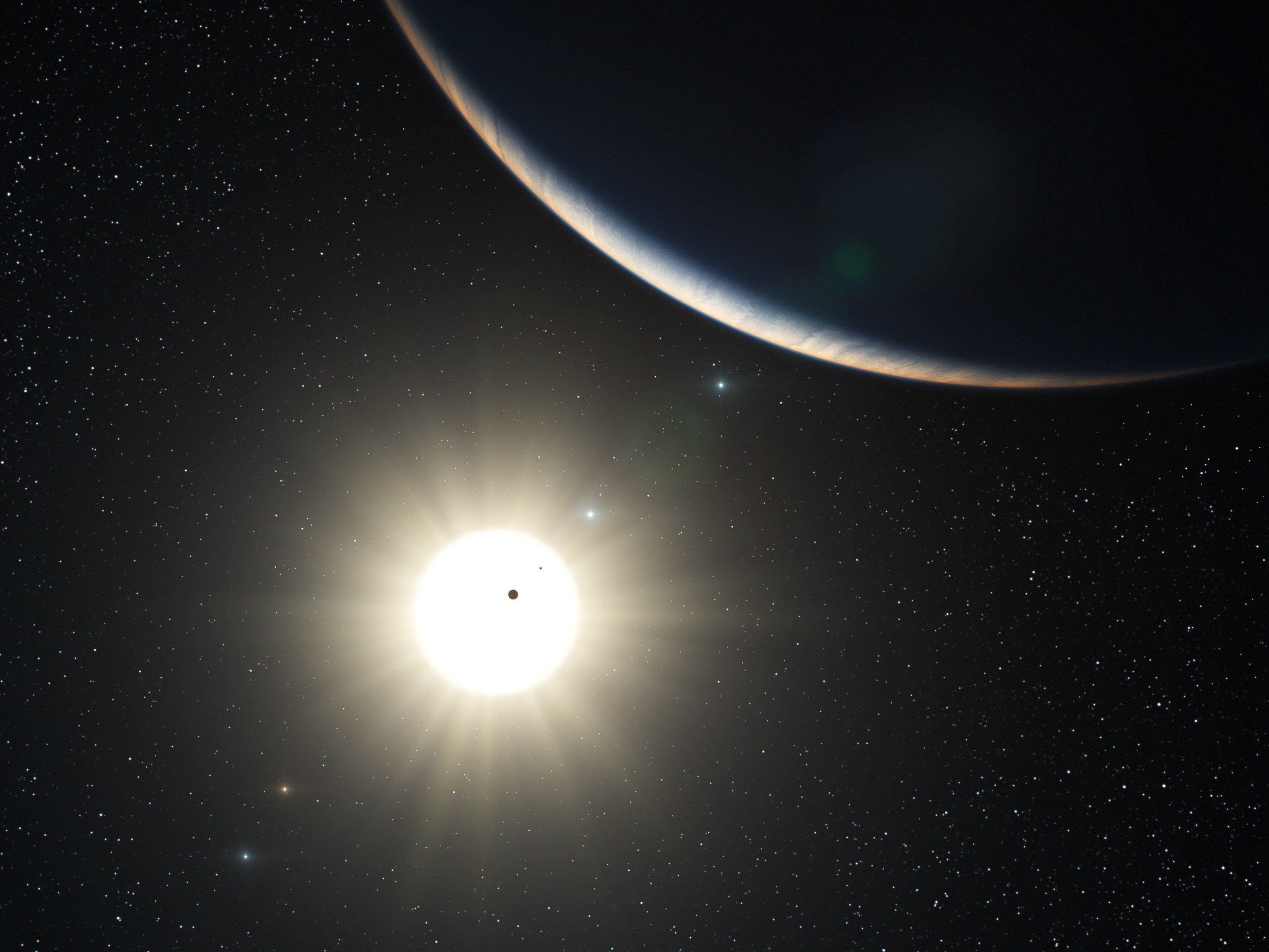 The large crescent is the third world in the system (HD 10180d), which is comparable to the planet Neptune in mass. The two inner planets appear as silhouettes in transit across the bright disc of the star. The outer planets in the system appear in the background sky.