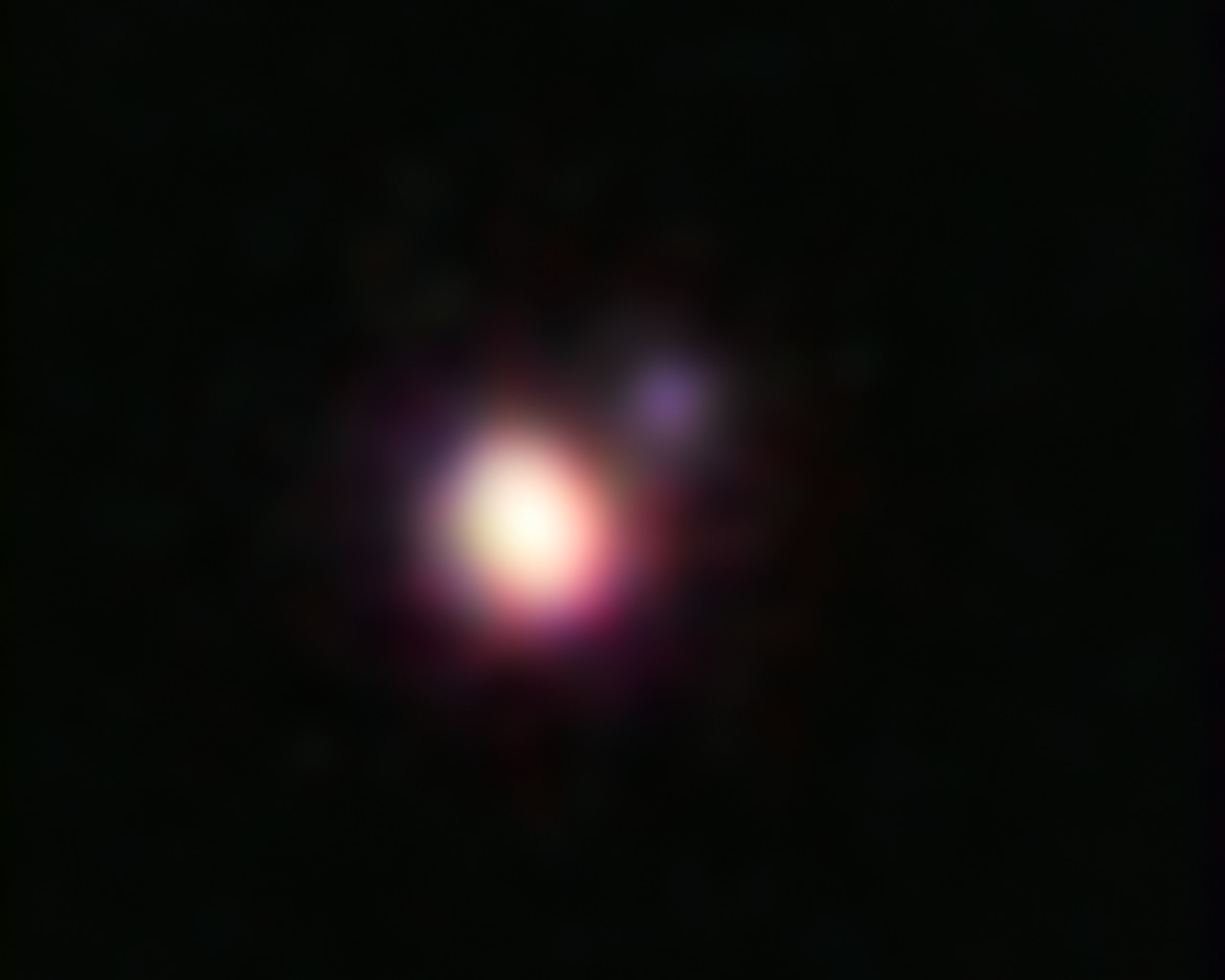 This image of the brown dwarf binary CFBDSIR 1458+10 was obtained using the Laser Guide Star (LGS) Adaptive Optics system on the Keck II Telescope in Hawaii. Adaptive optics cancels out much of Earth’s atmospheric interference, improving the image sharpness by a factor of ten and enabling the very small separation binary to be resolved. This is the coolest pair of brown dwarfs found so far—the colder and dimmer of the two components is a candidate for the brown dwarf with the lowest temperature ever found. This colour picture was created from images taken through four different filters at near-infrared wavelengths.