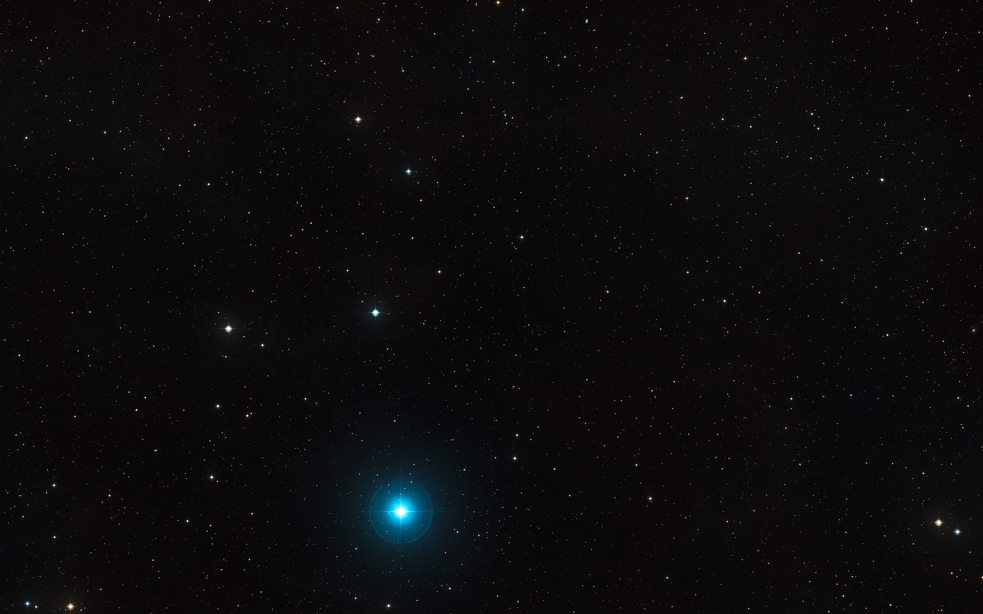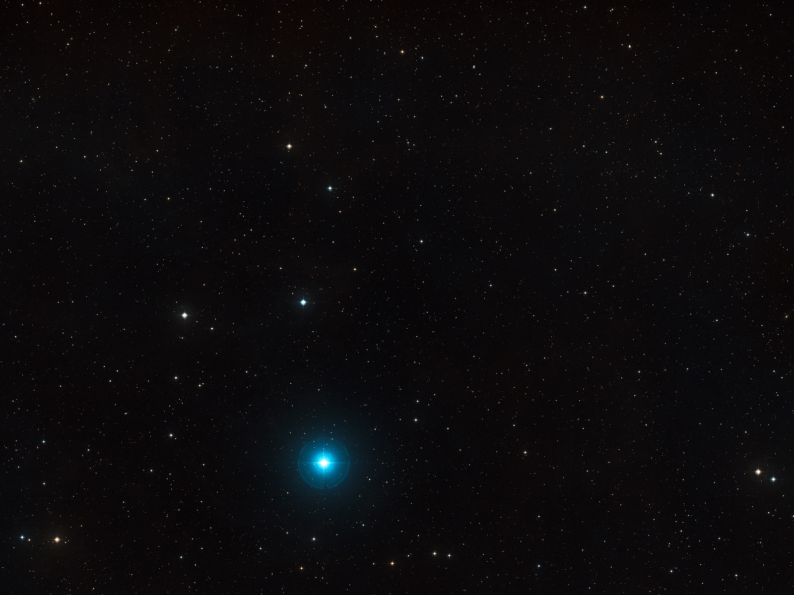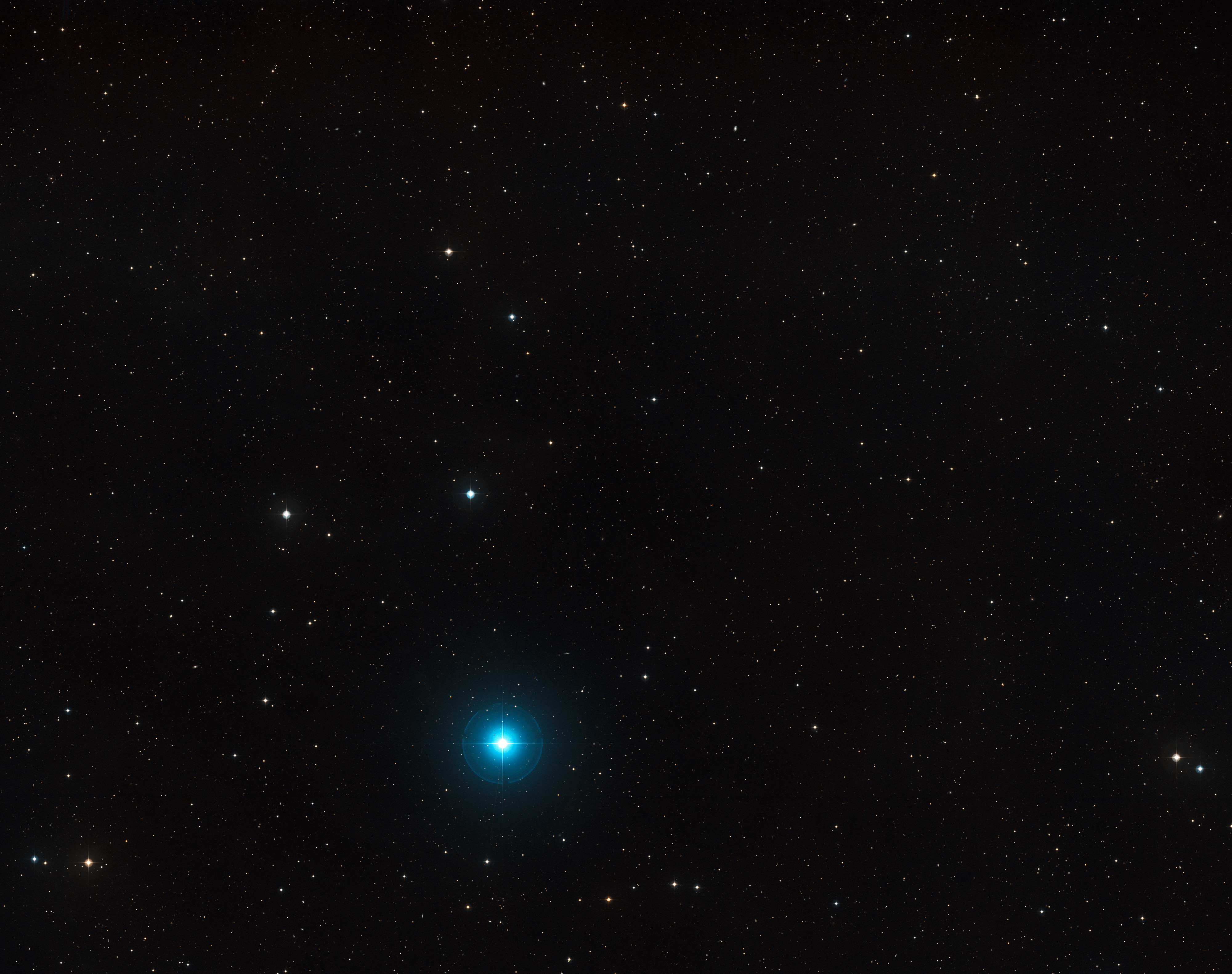 This visible-light wide-field image of the region around ULAS J1120+0641, the most distant quasar found so far, was created from photographs taken through red and blue filters and forming part of the Digitized Sky Survey 2. The object itself lies very close to the centre and is not visible in this picture, but many other, much closer, galaxies are seen in this wide-field view that spans about three degrees of sky.