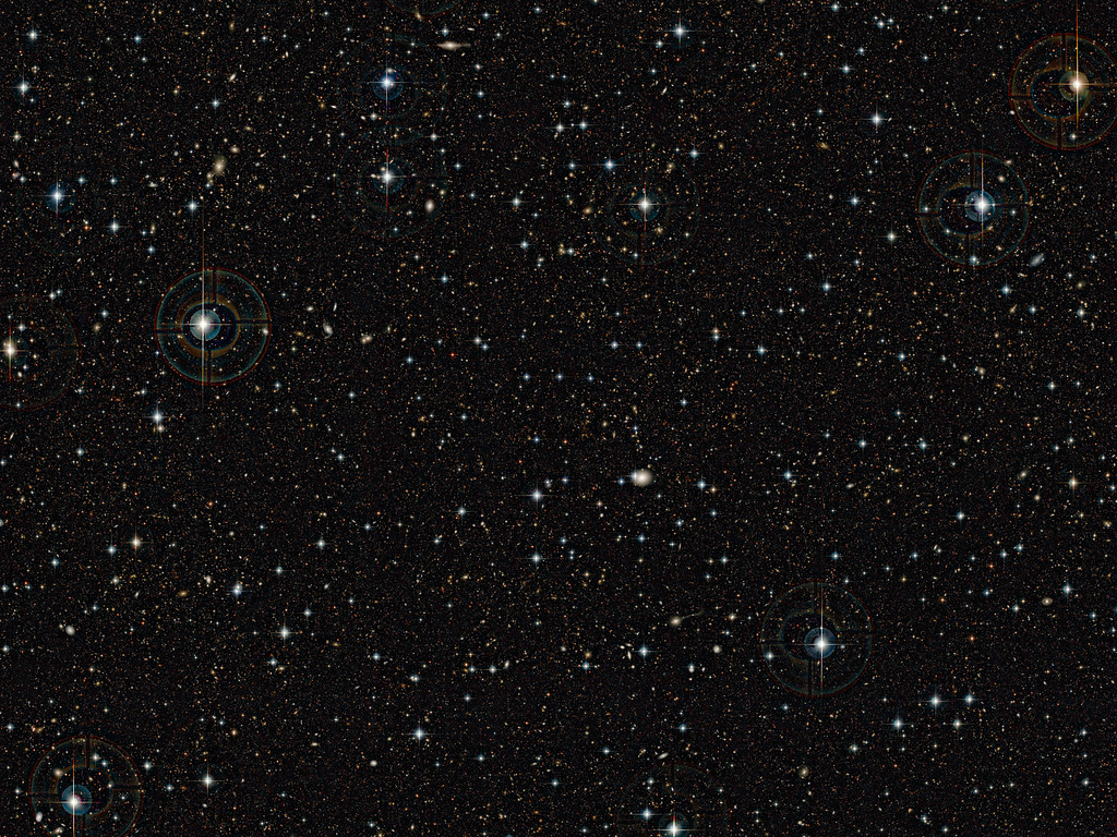 This very deep image shows the COSMOS field imaged by the Canada France Hawaii Telescope (CFHT). Huge numbers of very faint galaxies are visible. A new study of this field, combining data from ESO’s Very Large Telescope and ESA’s XMM-Newton X-ray space observatory has turned up a big surprise. Most of the huge black holes in the centres of active galaxies in the past 11 billion years were not turned on by mergers between galaxies, as had been previously thought.