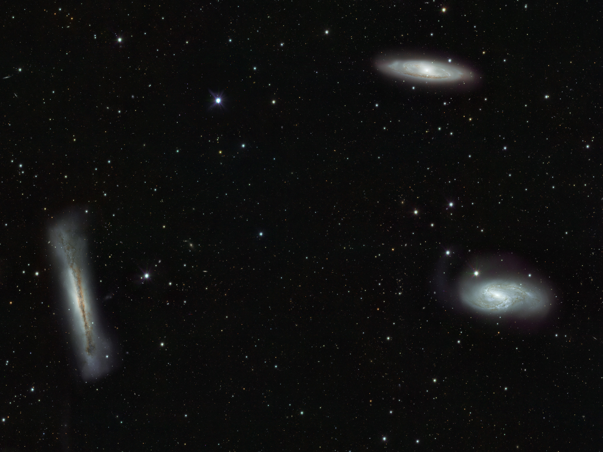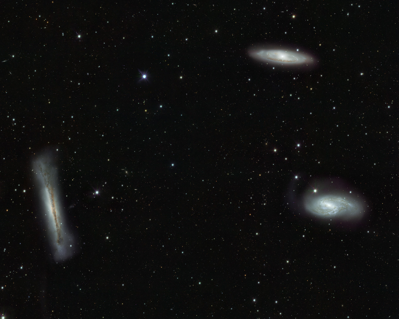 Triplet of bright galaxies in the constellation of Leo (The Lion), together with a multitude of fainter objects: distant background galaxies and much closer Milky Way stars. The image hints at the power of the VST and OmegaCAM for surveying the extragalactic Universe and for mapping the low brightness objects of the galactic halo. This image is a composite created by combining exposures taken through three different filters. Light that passed through a near-infrared filter was coloured red, light in the red part of the spectrum is coloured green, and green light is coloured magenta.