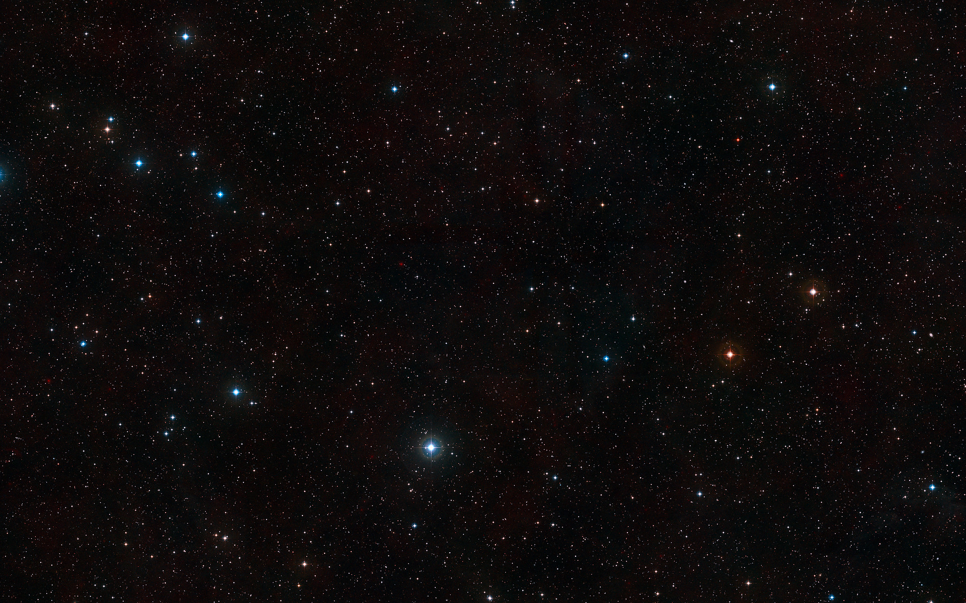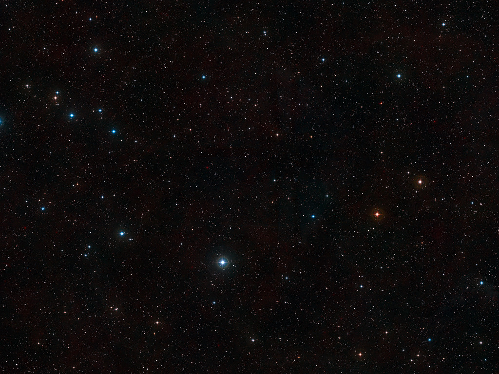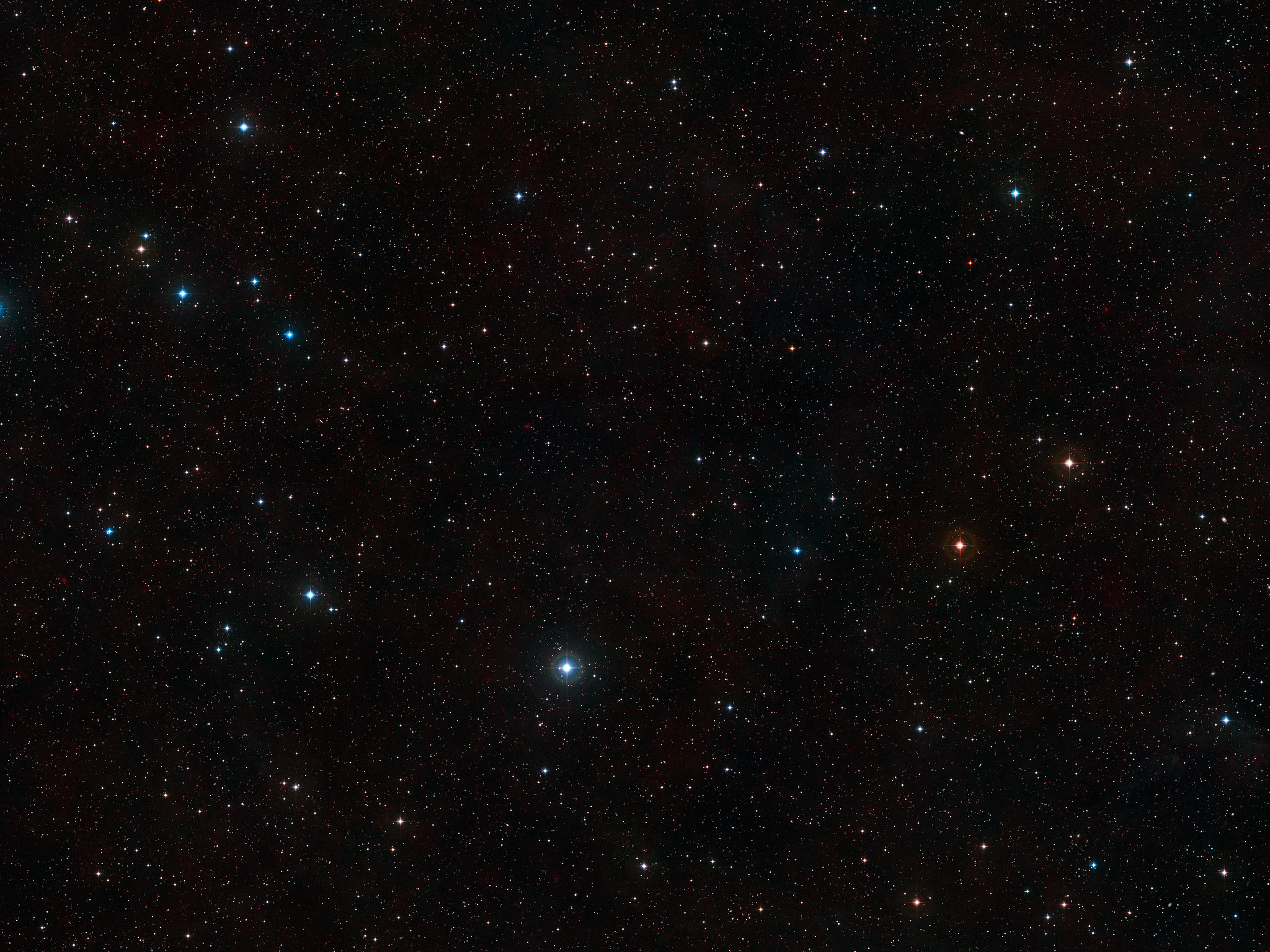 This visible-light wide-field image of the region around the giant Lyman-alpha blob LAB1 was created from photographs taken through blue and red filters and forming part of the Digitized Sky Survey 2. The blob itself lies at the centre of the image but, despite being huge and very luminous, it is so distant that it is too faint to be seen clearly on this picture. The field of view is approximately 2.9 degrees across.