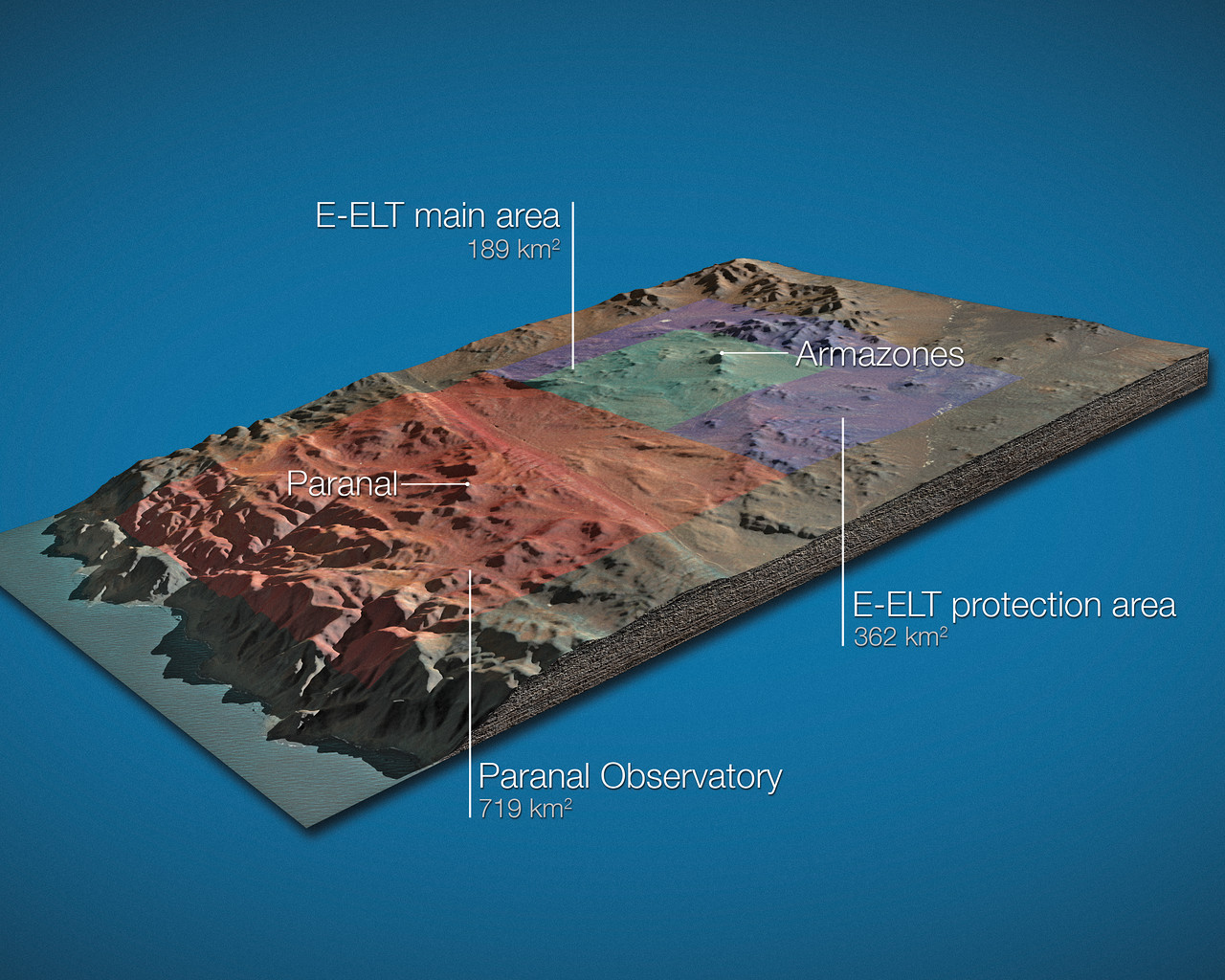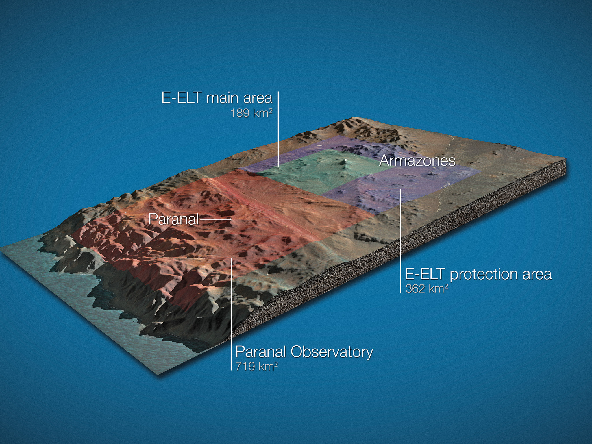 On 13 October 2011, the Republic of Chile and ESO signed an agreement regarding land for the European Extremely Large Telescope, including the donation of an area of 189 km2 around Cerro Armazones for the installation of the E-ELT as well as a concession for 50 years relating to the surrounding area, representing an additional 362 km2 , which will protect the E-ELT from light pollution and mining operations. With the current 719 km2 of land around Cerro Paranal the total protected area around the Paranal–Armazones complex will thus reach 1270 km2.