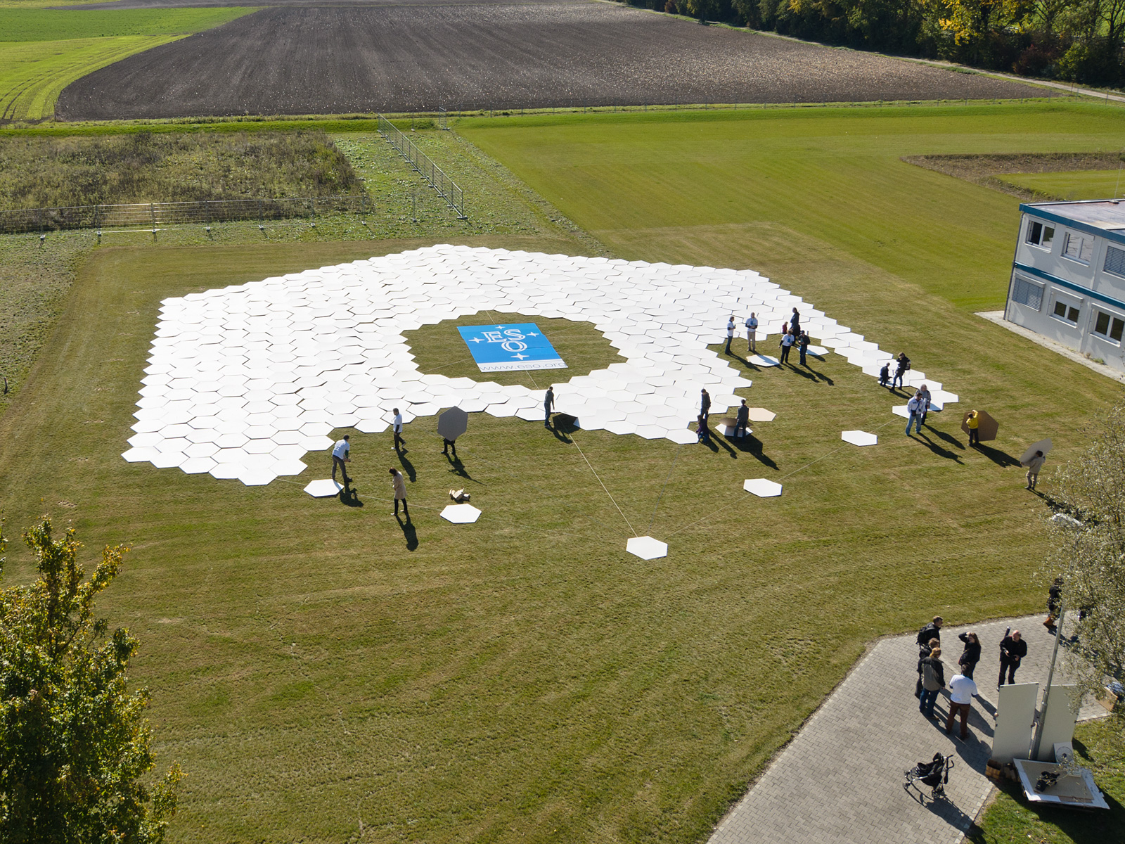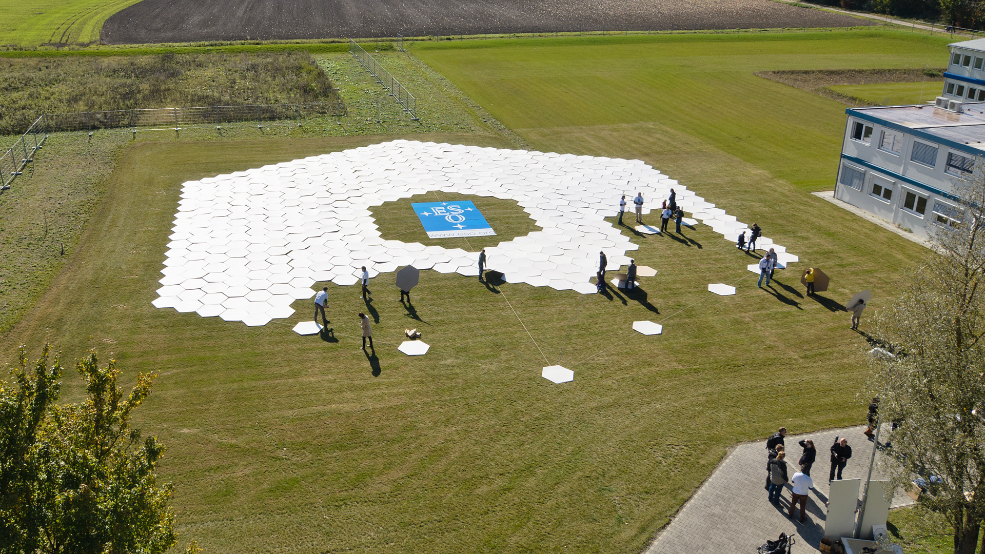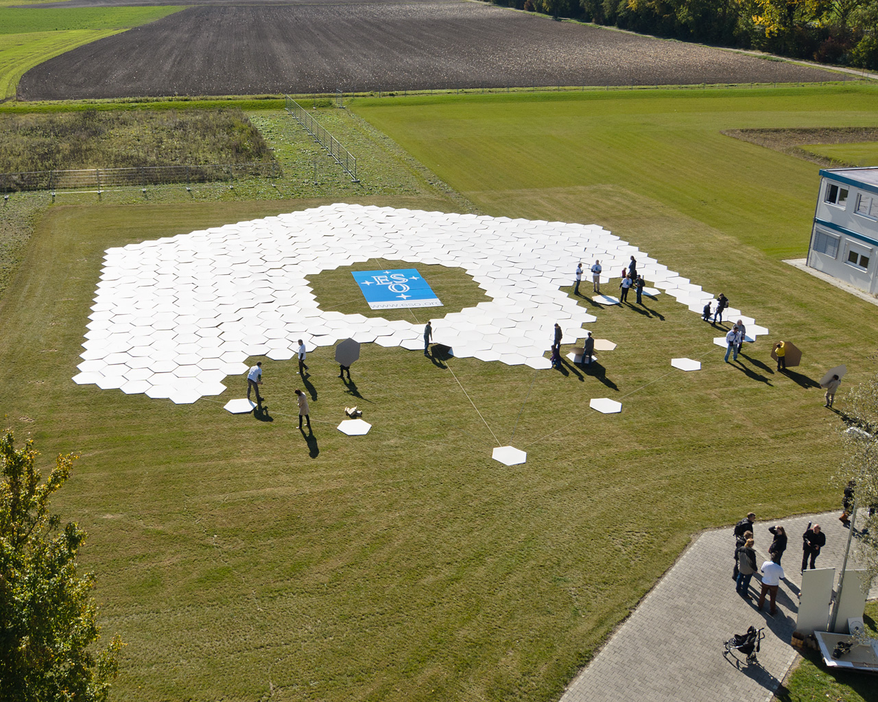 This full-size replica of the mirror was built by participants at ESO’s Open House Day 2011 in Garching bei München. The full-size mock-up was made of 798 cardboard hexagons, each around 1.4 metres across, and it measured 39.3 metres across, occupying an area of nearly 1000 square metres. The E-ELT will be the largest optical/infrared telescope in the world.