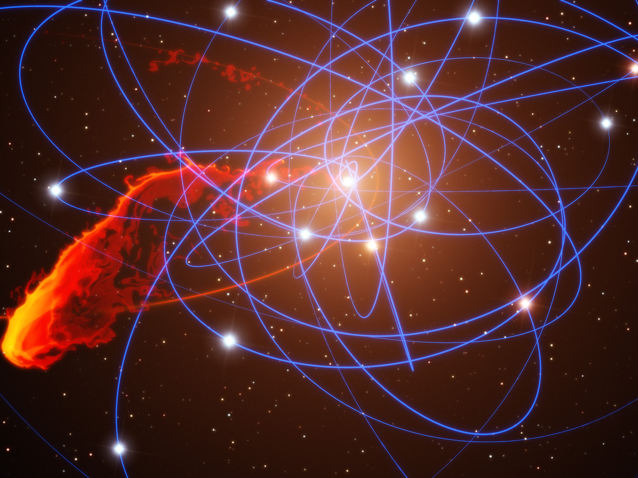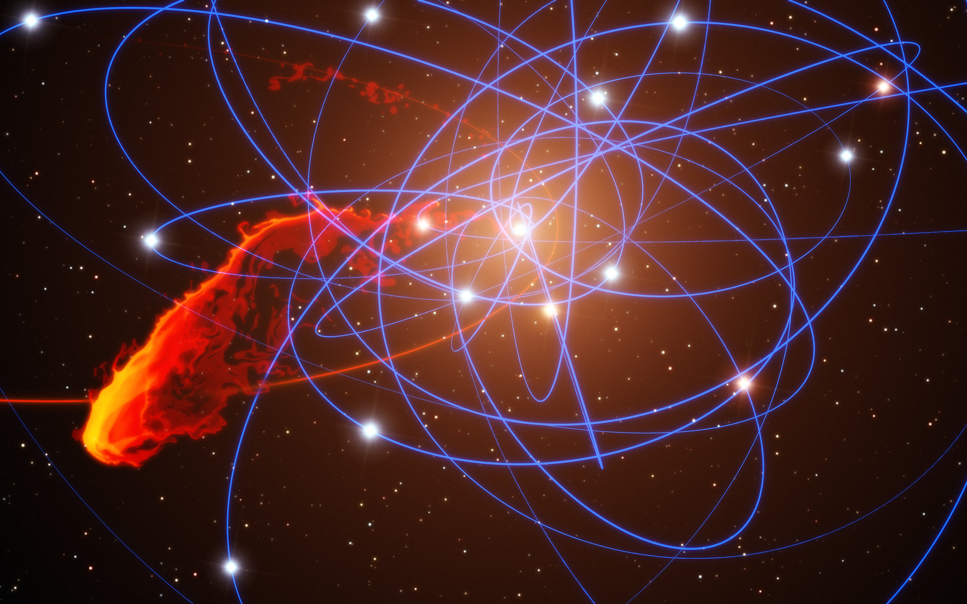 This view shows a simulation of how a gas cloud that has been observed approaching the supermassive black hole at the centre of the galaxy may break apart over the next few years. This is the first time ever that the approach of such a doomed cloud to a supermassive black hole has been observed and it is expected to break up completely during 2013. The remains of the gas cloud are shown in red and yellow, with the cloud's orbit marked in red. The stars orbiting the black hole are also shown along with blue lines marking their orbits. This view simulates the expected positions of the stars and gas cloud in the year 2021.