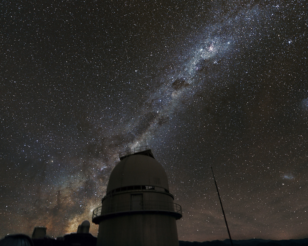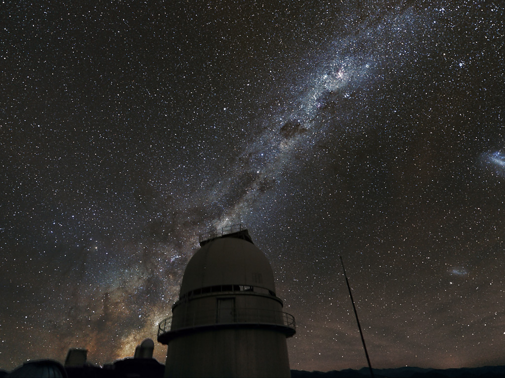 The Milky Way above the dome of the Danish 1.54-metre telescope at ESO's La Silla Observatory in Chile. The central part of the Milky Way is visible behind the dome of the ESO 3.6-metre telescope in the distance. On the right the Magellanic Clouds can be seen. This telescope was a major contributor to the PLANET project to search for exoplanets using microlensing. The picture was taken using a normal digital camera with a total exposure time of 15 minutes.