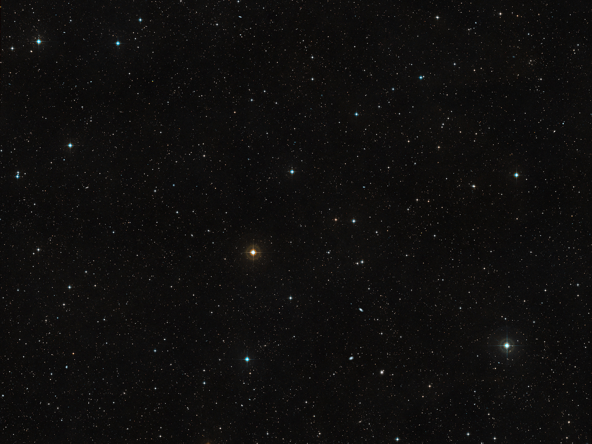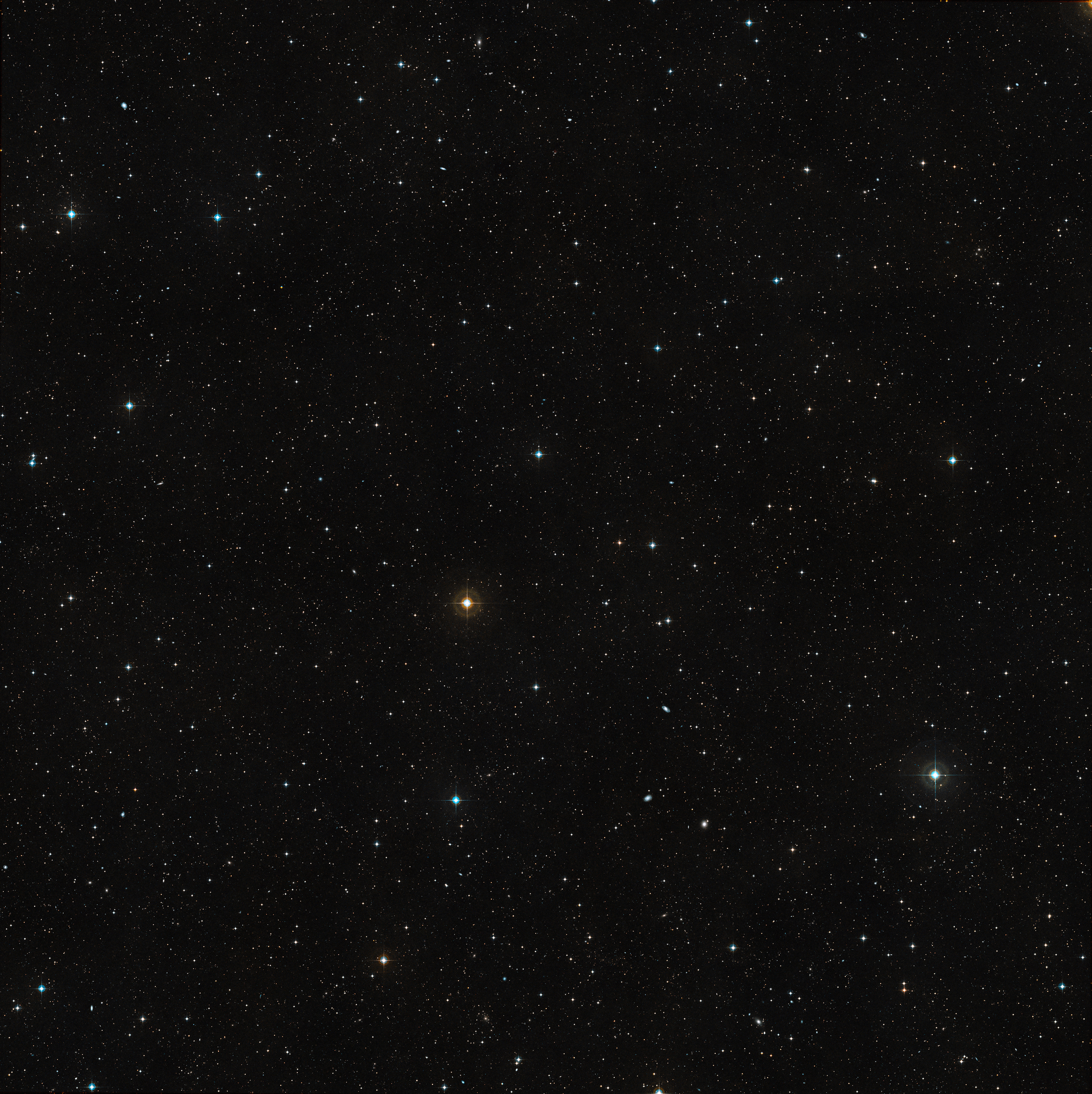 This wide-field image of the sky around the quasar HE0109-3518 is a colour composite made from exposures from the Digitized Sky Survey 2 (DSS2). The total field of view of this image is approximately 3 degrees across.