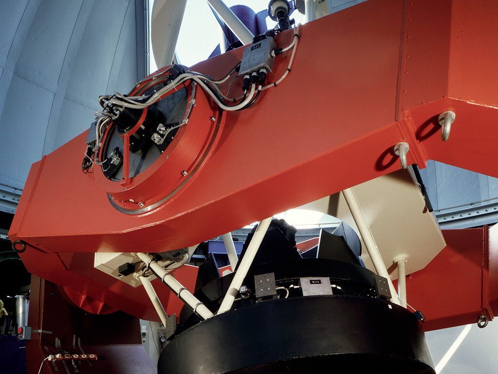 This photograph shows the 1.4-m CAT telescope in its enclosure. This telescope is located on La Silla Observatory in Chile. The ESO Coudé Auxiliary Telescope (CAT) has a 1.4 m primary mirror and is alt-alt mounted. It is housed in a smaller dome, adjacent to the 3.6 m telescope and feeds the 3.6 m Coudé Echelle Spectrometer through a light tunnel. The CAT is fully computer controlled. It has been used for many different types of astronomical observations, including millimetre radio mapping of CO clouds near the galactic centre.