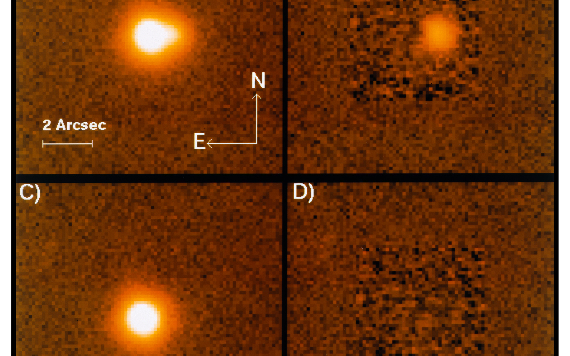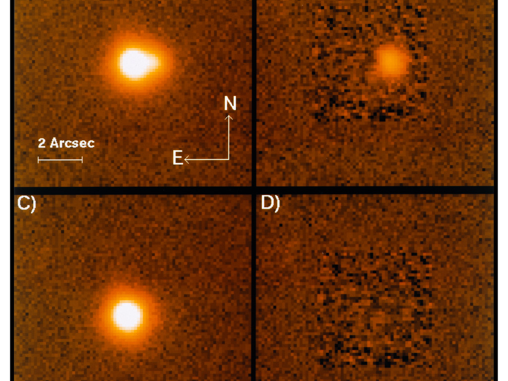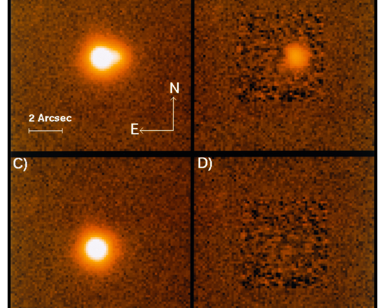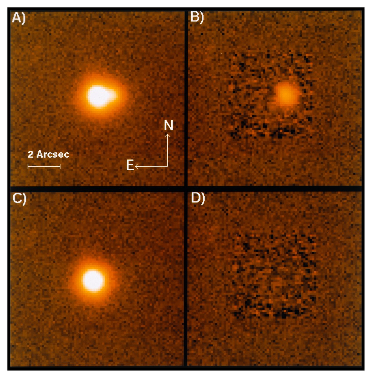 It clearly reveals the elongated shape, caused by the superposition of two images very near each other. In (B), the stronger of the two has been subtracted with an advanced image processing algorithm, based on the scaling of stellar profiles elsewhere in the frame. In (C), the fainter component has been removed, and in (D) the subtraction of both leaves no residual, indicating that there are no further detectable components of the quasar image. The intensity ratio between the two images is 1:7.