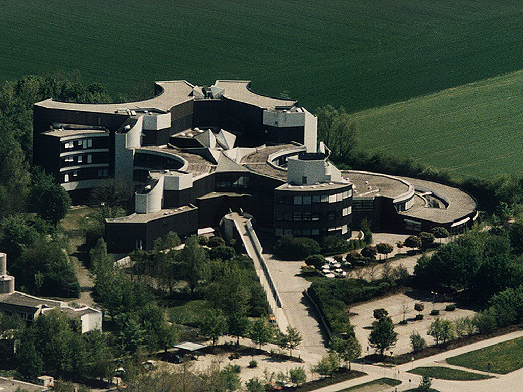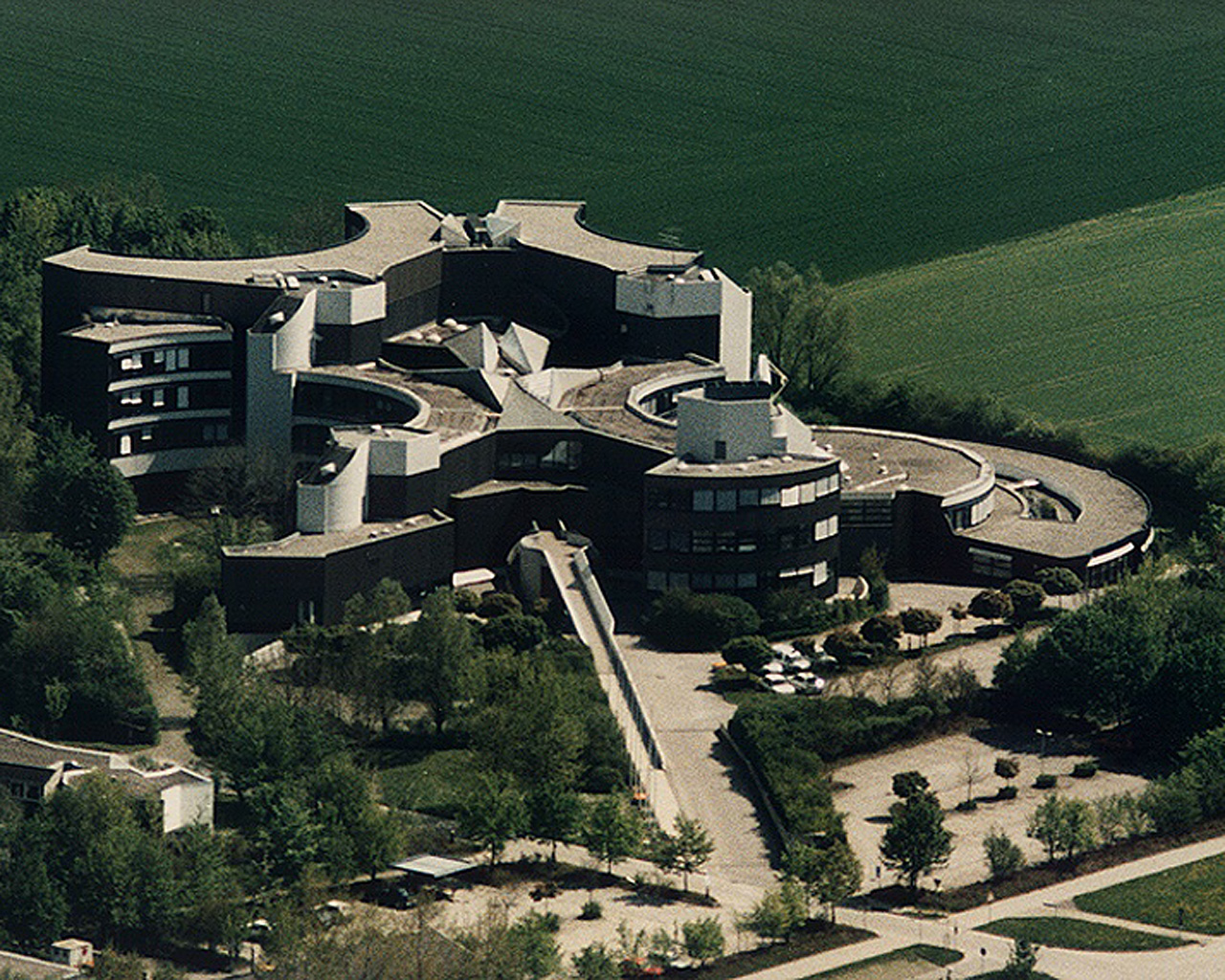 This image shows an aerial view of the modernistic building of the ESO Headquarters in the town of Garching, some 15 kilometres north of Munich, the capital of Bavaria, Germany. The building, which was donated to ESO by the Government of the (then Federal) Republic of Germany was constructed in the late 1970's at a time when ESO's various divisions were still dispersed at several sites in Europe. The move into the Organisation's new European home took place in the summer of 1980.