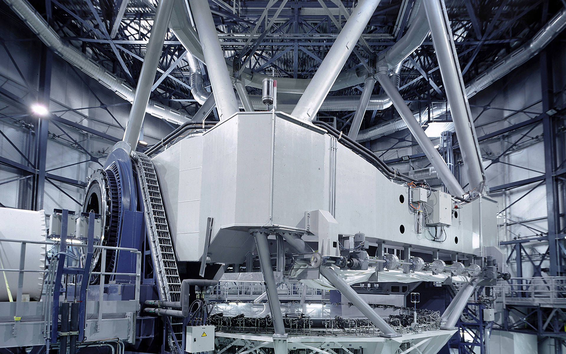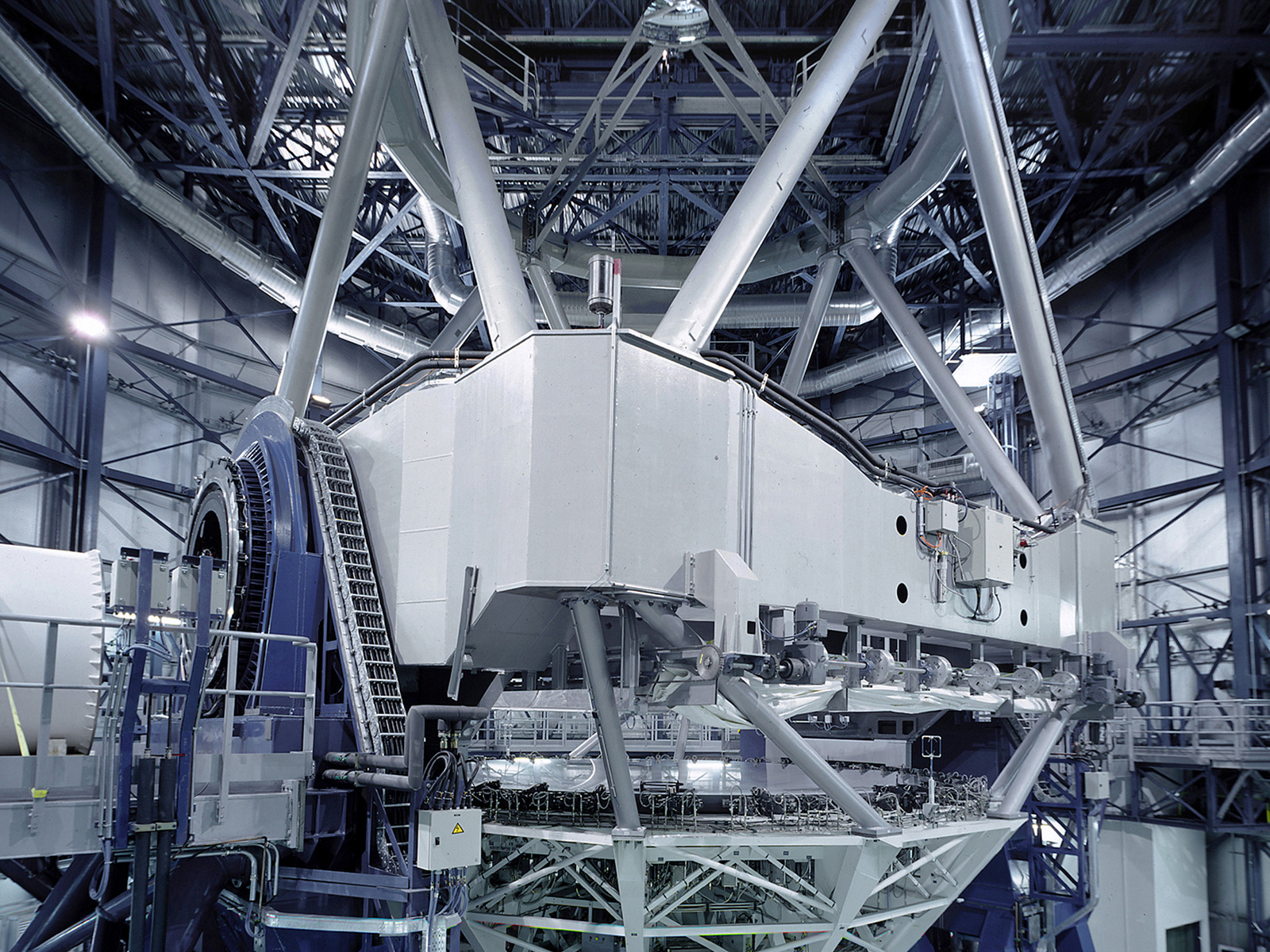 This image was obtained on the day of VLT UT1 First Light (May 25, 1998) by ESO photographer Herbert Zodet, using special equipment to achieve the necessary view and photographic sharpness in the narrow space available within the enclosure. There is an unavoidable distortion of perspective due to the extreme angle. Note in particular the simultaneous visibility of the primary and the secondary mirrors and the amount of detail of the lateral supports of the active optics system at the primary mirror. The Test Camera with which the First Light images were obtained, is seen at the bottom of the M1 Cell (that supports the primary mirror).