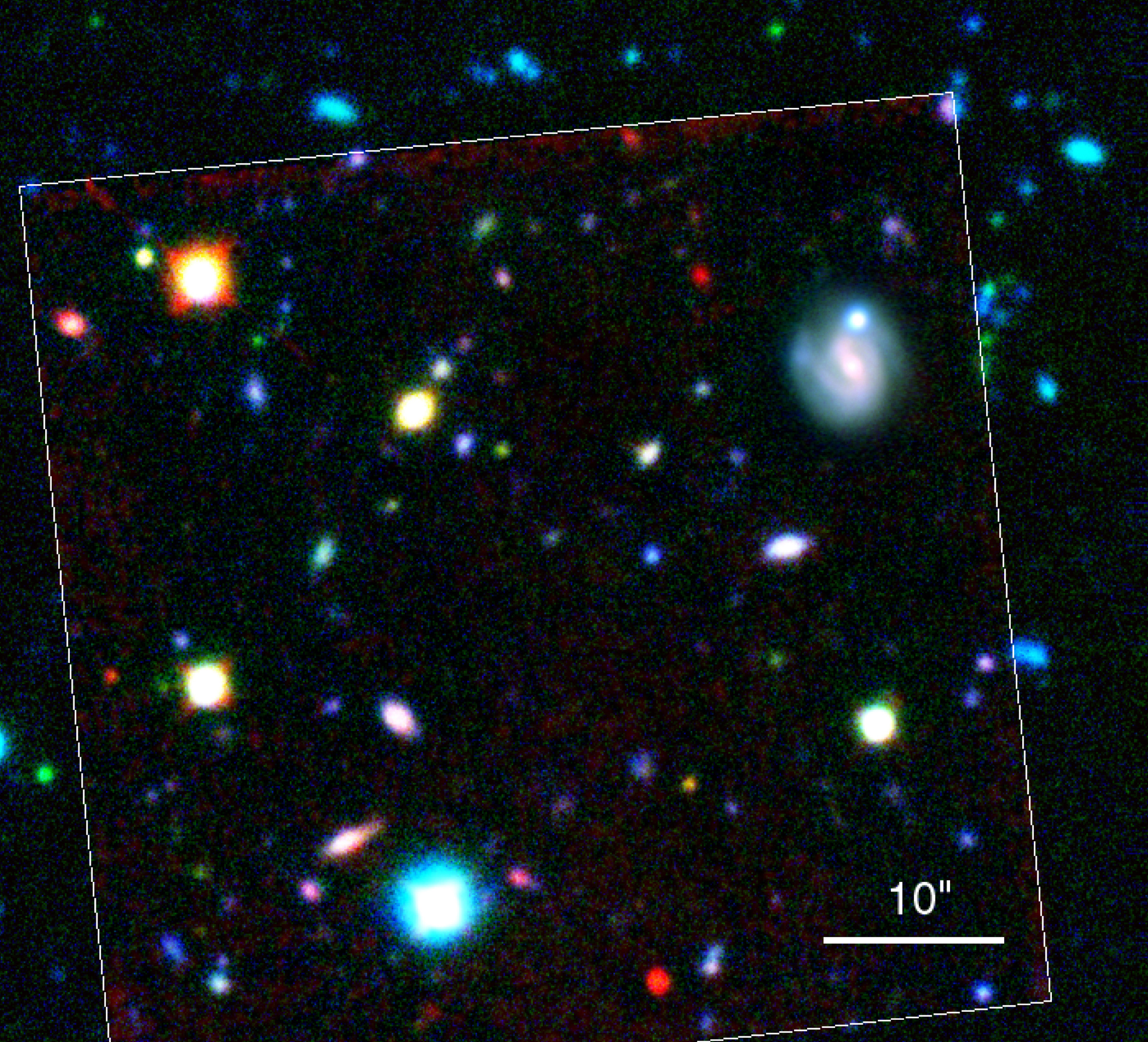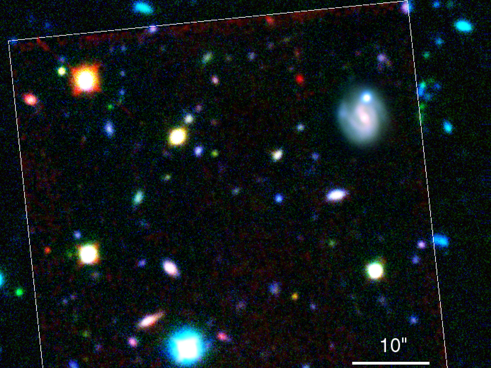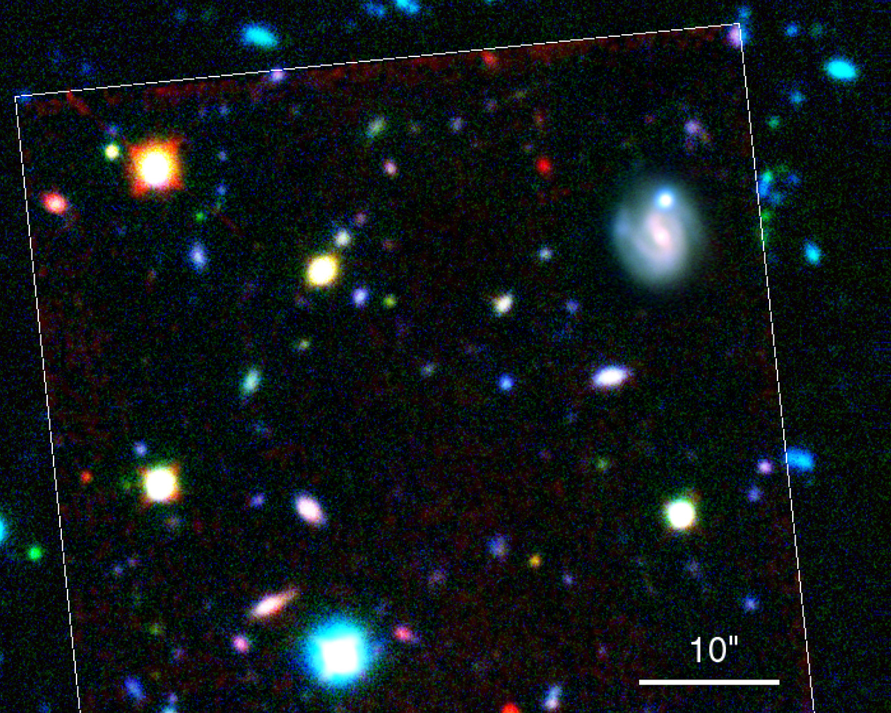 This image is a colour composite of the HDF-S NICMOS field, constructed by combining VLT Test Camera images in U+B and R bands with a HST NICMOS near-IR H-band exposure. These images are displayed as blue, green and red, respectively. The NICMOS image was smoothed to match the angular resolution of the R-band VLT image. The boundary of the NICMOS image is also shown.