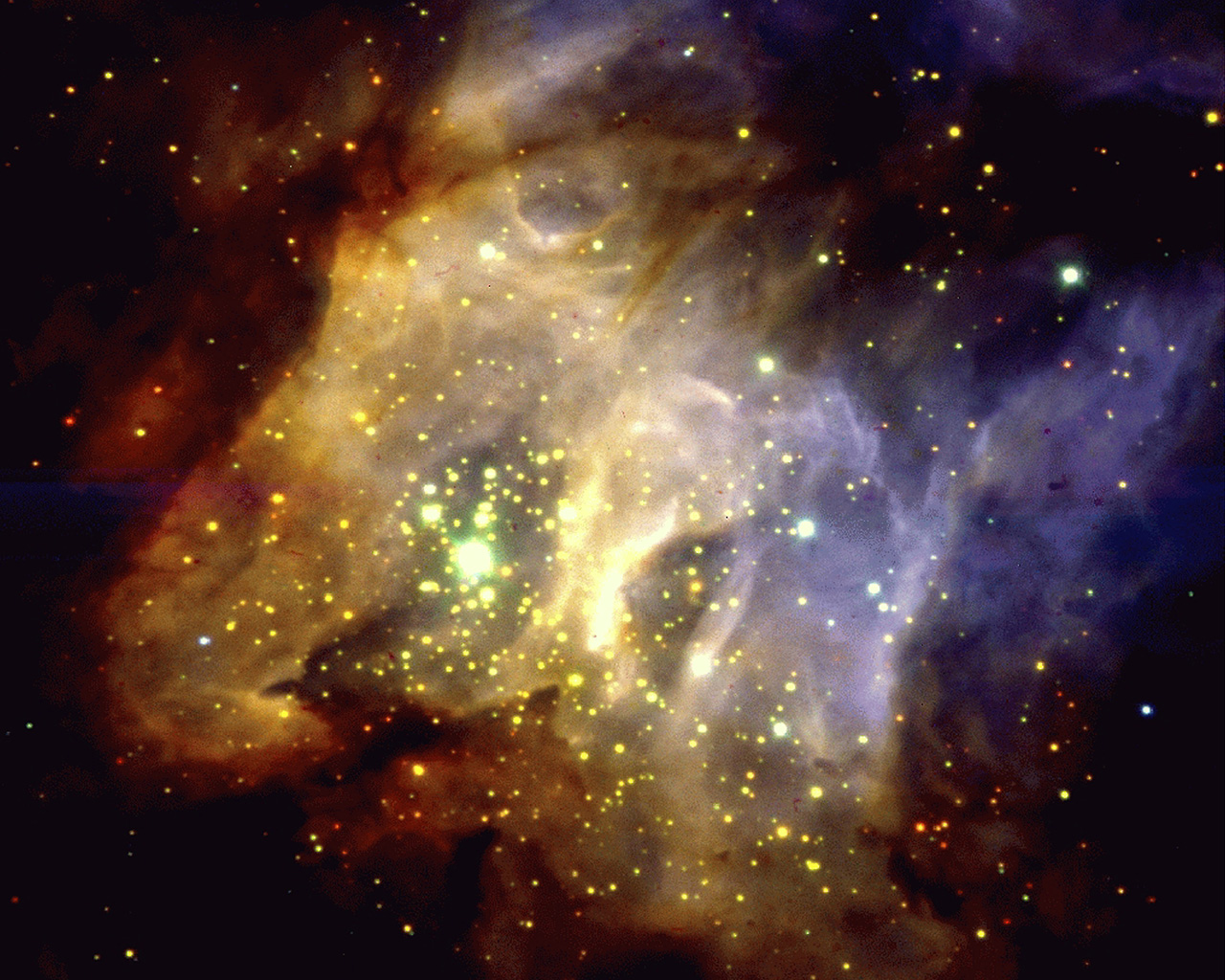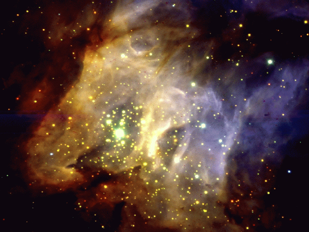 eso9856b displays a spectacular three-colour composite image of RCW38, obtained through three near-infrared filters. This is a region in the Milky Way at a distance of about 5,000 light years, where stars which have recently formed in clouds of gas and dust are still heavily obscured and cannot be observed in the visible part of the spectrum. Contrarily, as this image shows, they are very well seen at infrared wavelengths where the obscuration is substantially lower. The diffuse radiation is a mixture of starlight scattered by the dust and gas in the area, and atomic and molecular hydrogen line emission.