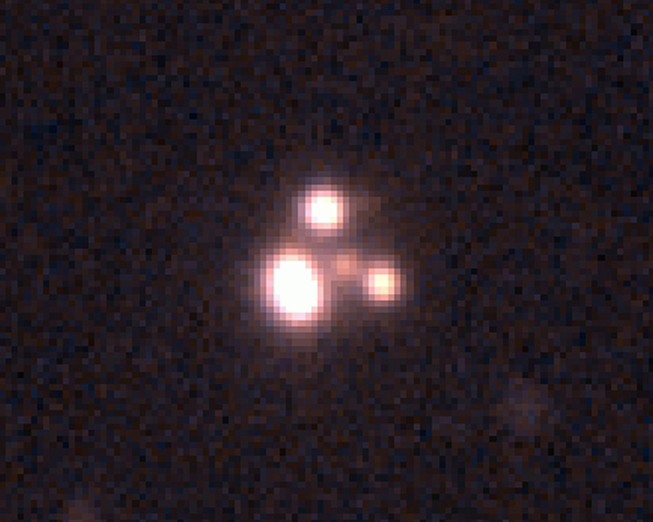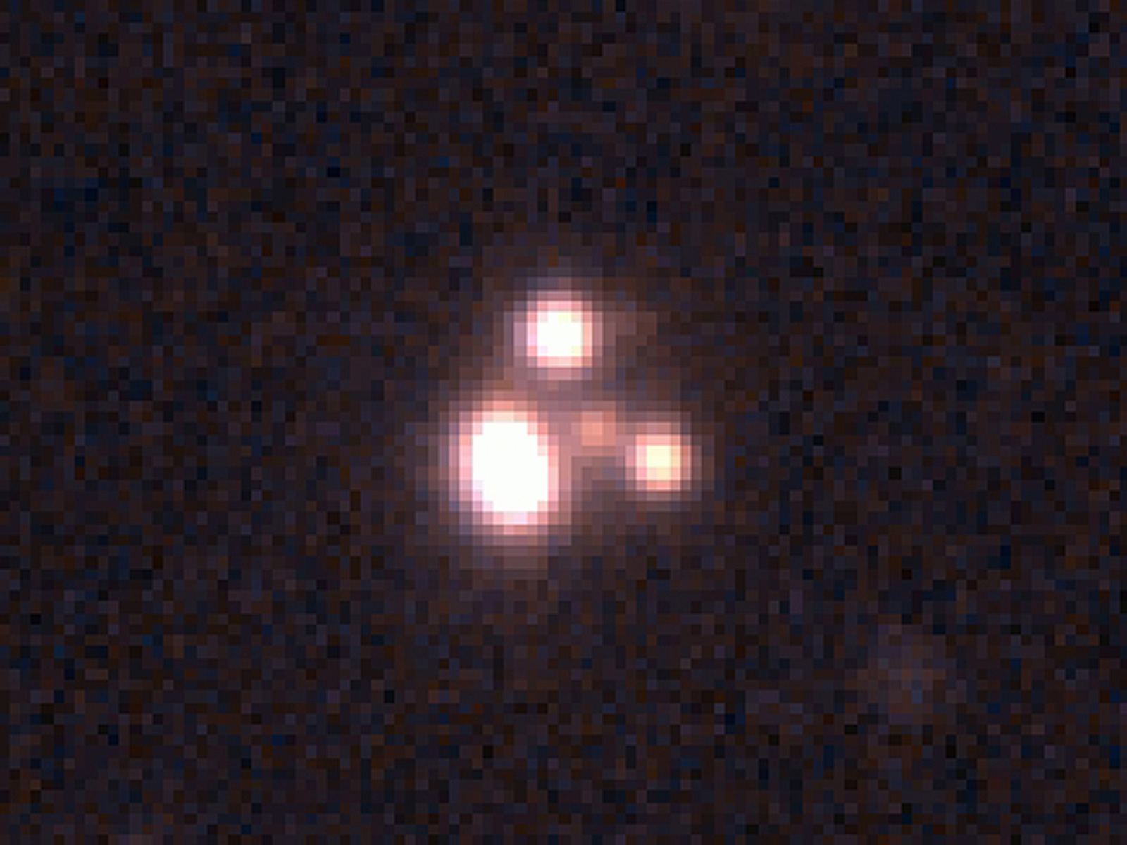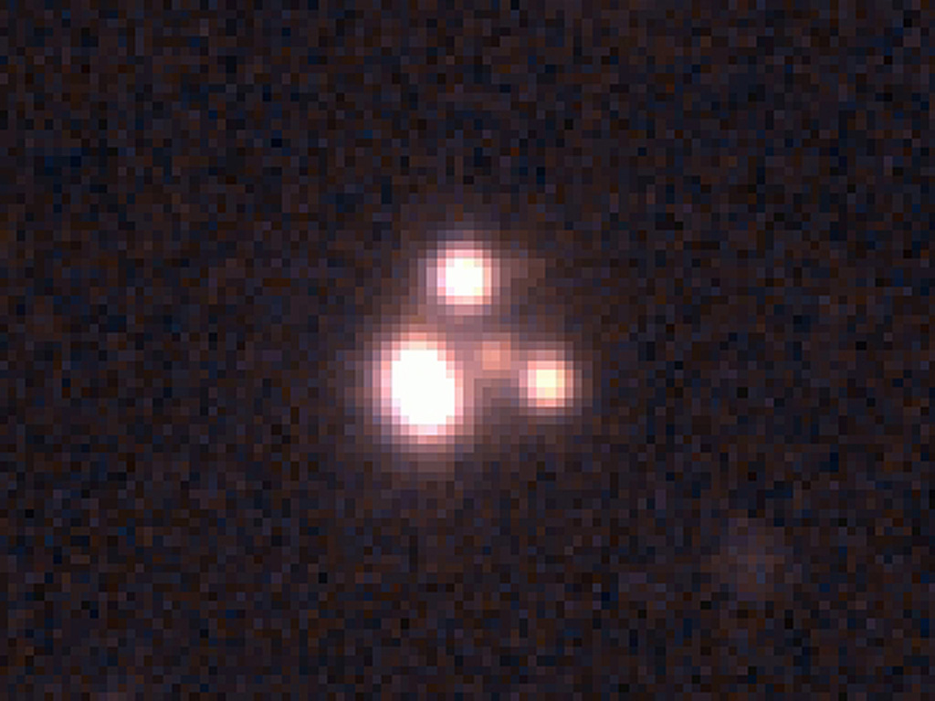 The image is an infrared colour composite of the quadruply lensed quasar system MG0414+0534 made by combining 20 min ISAAC J (1.25µm) and Ks (2.16µm) exposures. This complex of images is only about 2 arcsec across. At the centre is the red galaxy at redshift z = 0.96 which is responsible for the four (of which two are not completely resolved) gravitationally lensed images of a z = 2.64 quasar plus a faint arc.