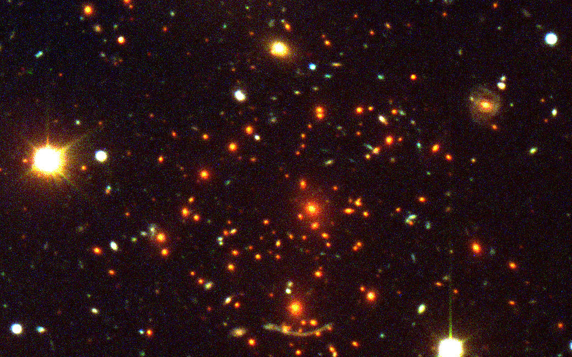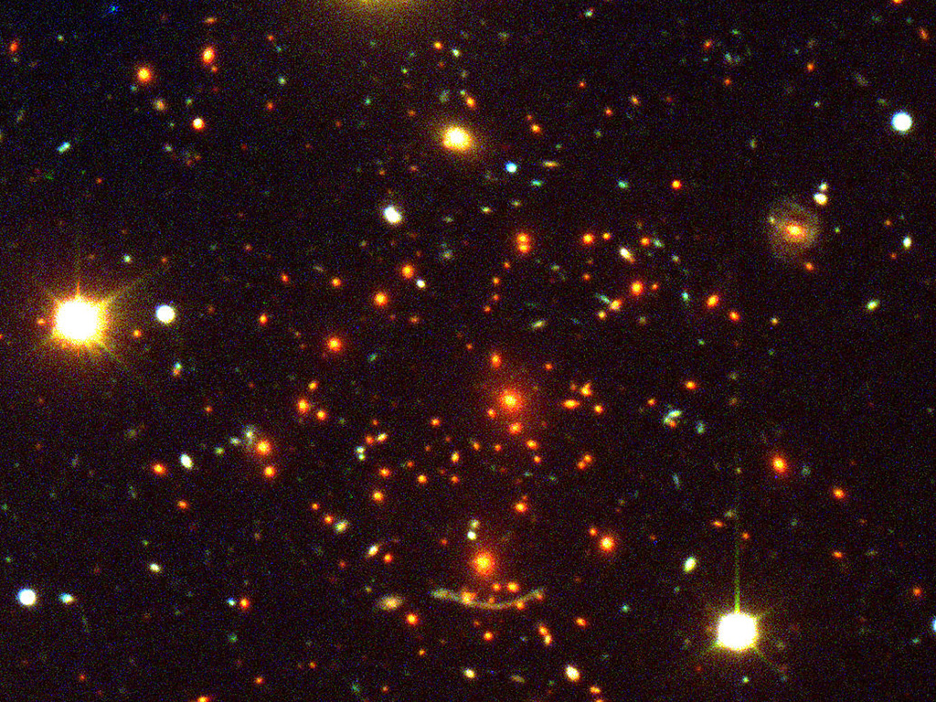 This is a composite colour image of the Abell 370 cluster of galaxies. The light of a very distant object is deformed by the foreground cluster. Abell 370, at the center of the photo, contains a large number of galaxies — most of them are ellipticals. The two brightest red galaxies slightly above the gravitational arc are the most massive in the cluster and give an important contribution to the lensing event.