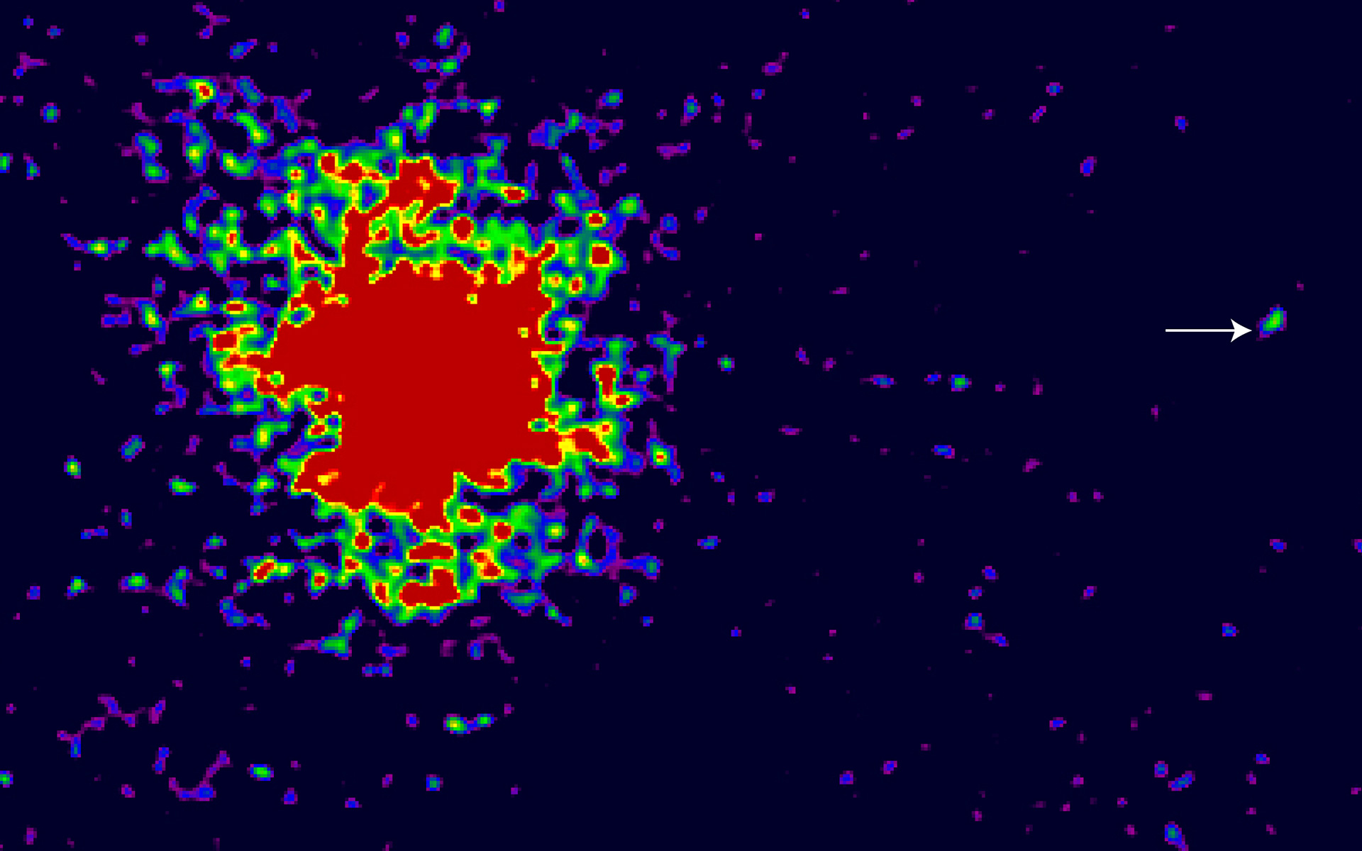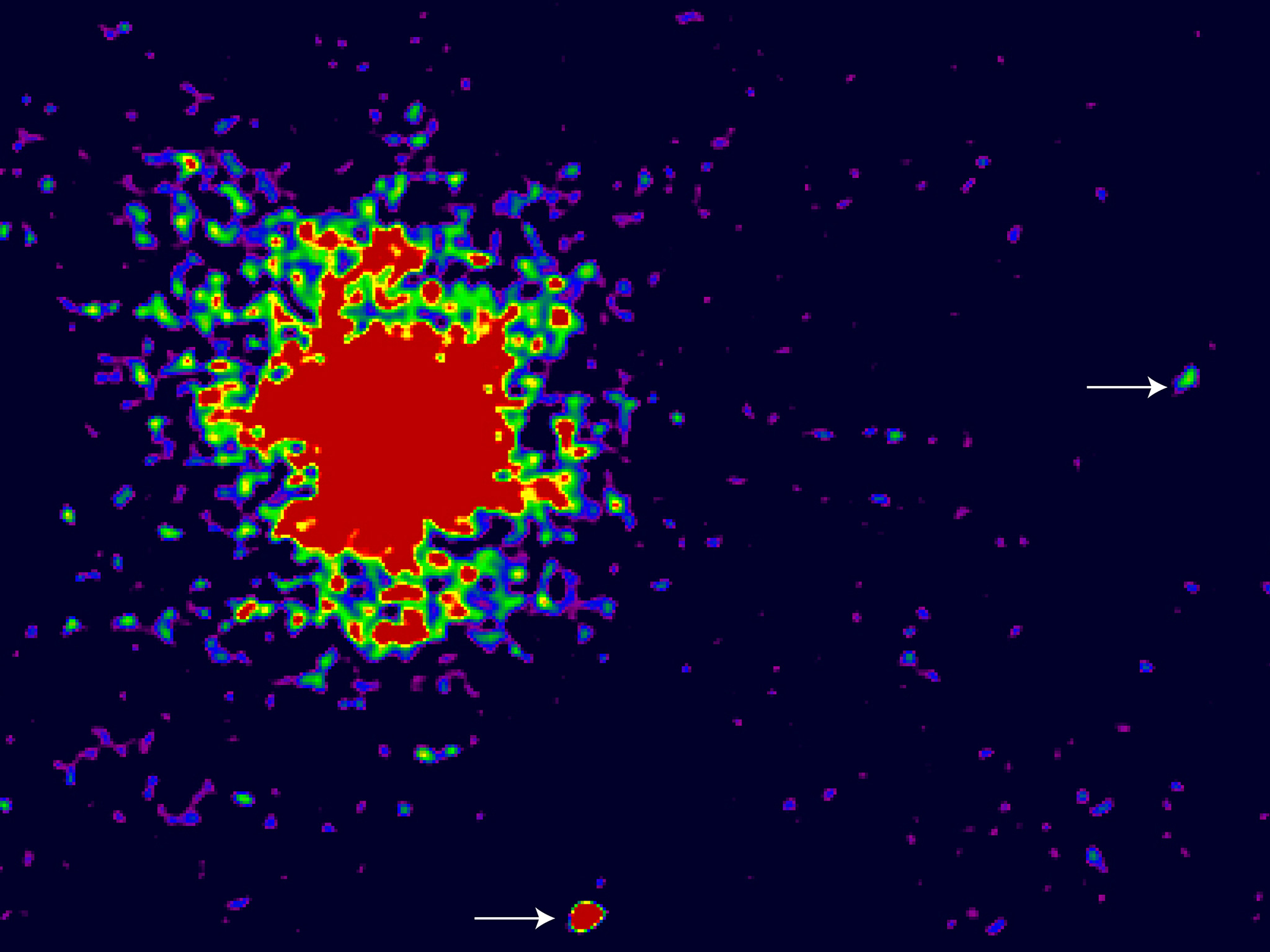 The image represents emission from the field around the radio-weak quasar J2233-606 in the Hubble Deep Field South (HDF-S) at a wavelength that corresponds to Lyman-alpha emission at the redshift (z = 2.2) of the quasar. Three Lyman-alpha candidate companions are indicated with arrows. Note also the extended nebulosity around the quasar.