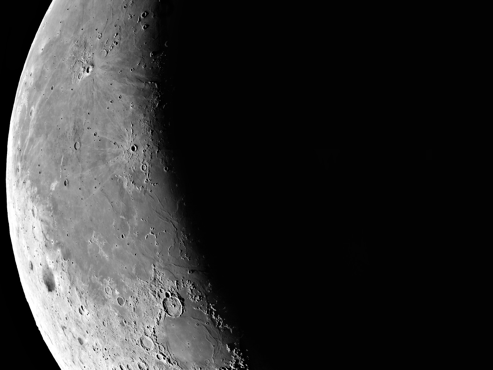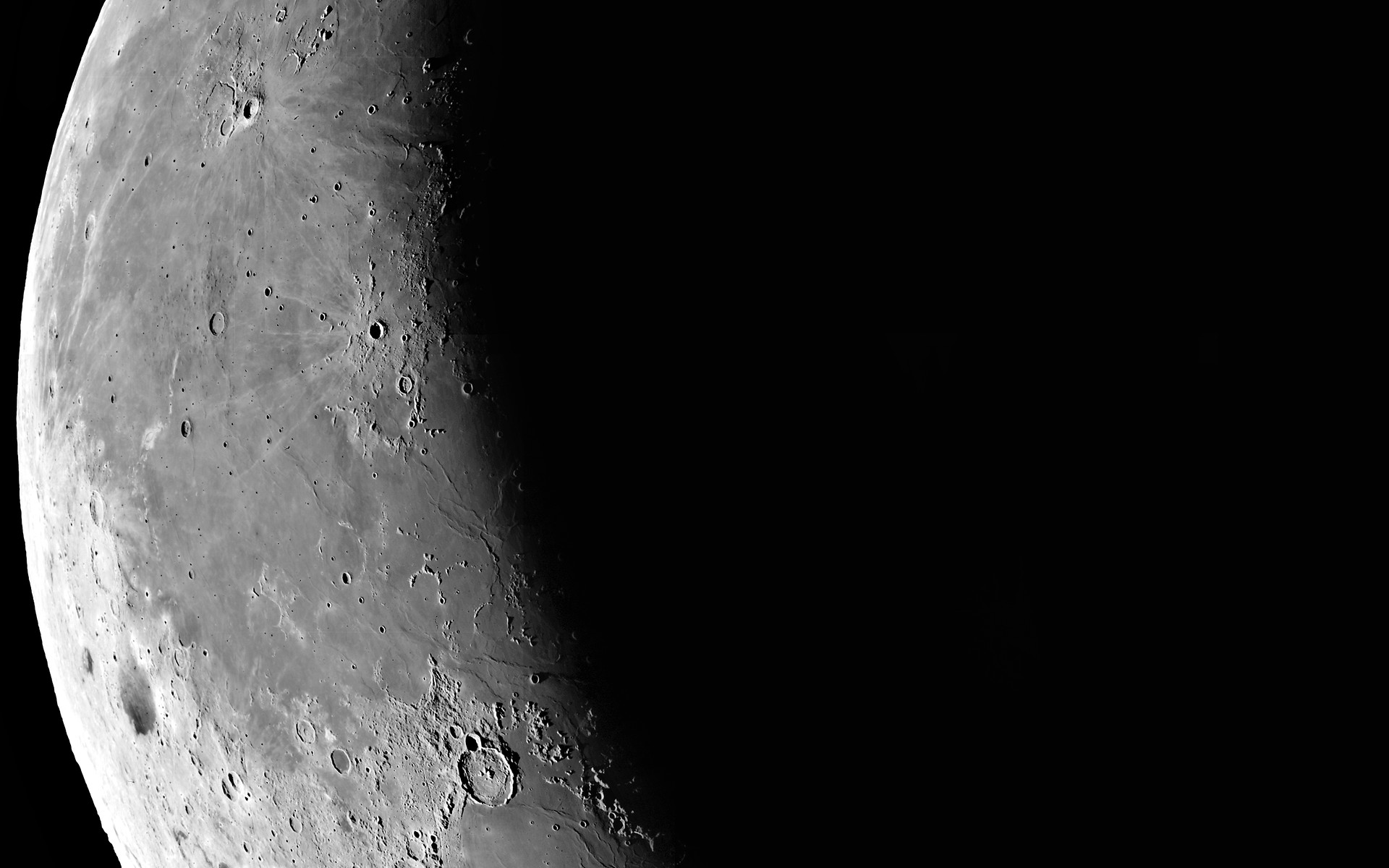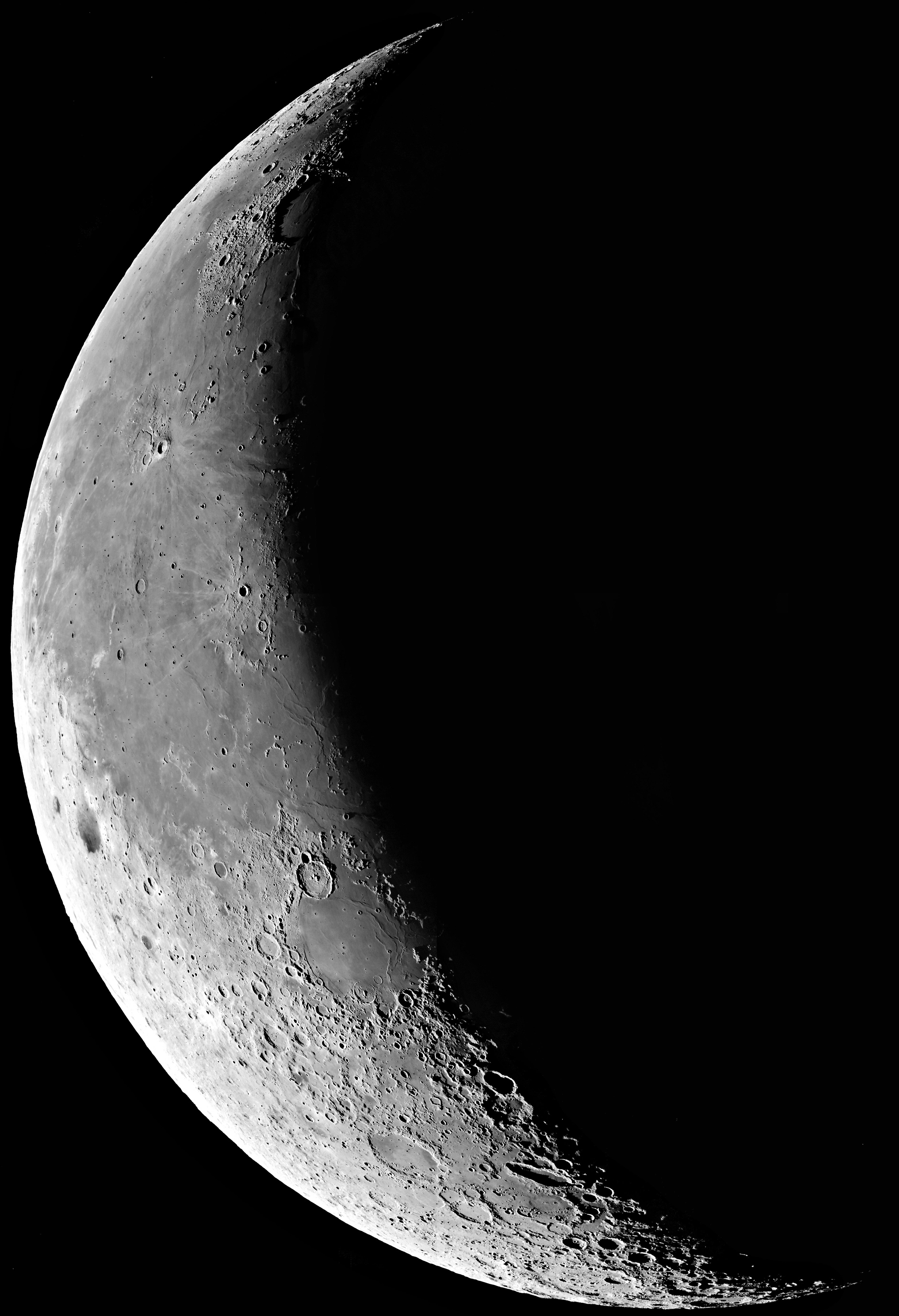 A series of short exposures through a near-infrared filtre was obtained of the waning Moon at sunrise on January 12 (at about 10 hrs UT), i.e. about 5 days before New Moon (24.3 days "old"). As can be seen in the image, the edge of the full field-of-view is about the size of the diameter of the Moon. Several 0.1 sec exposures were made through a near-infrared filtre (856 nm; FWHM 14 nm) with small offsets were recombined (to cover the gaps between the individual CCDs); otherwise, the image is raw. It was rebinned (2x2) to 4kx4k size and sampling 0.48 arcsec/pixel. The right-hand side of the picture was cropped in this reproduction to reduce the file size