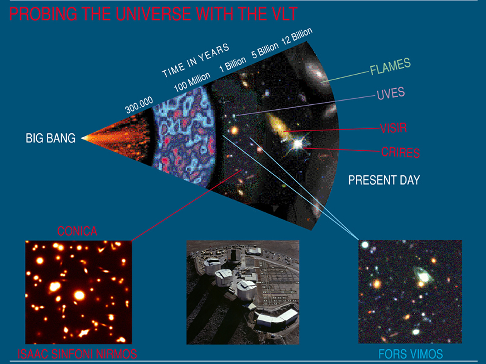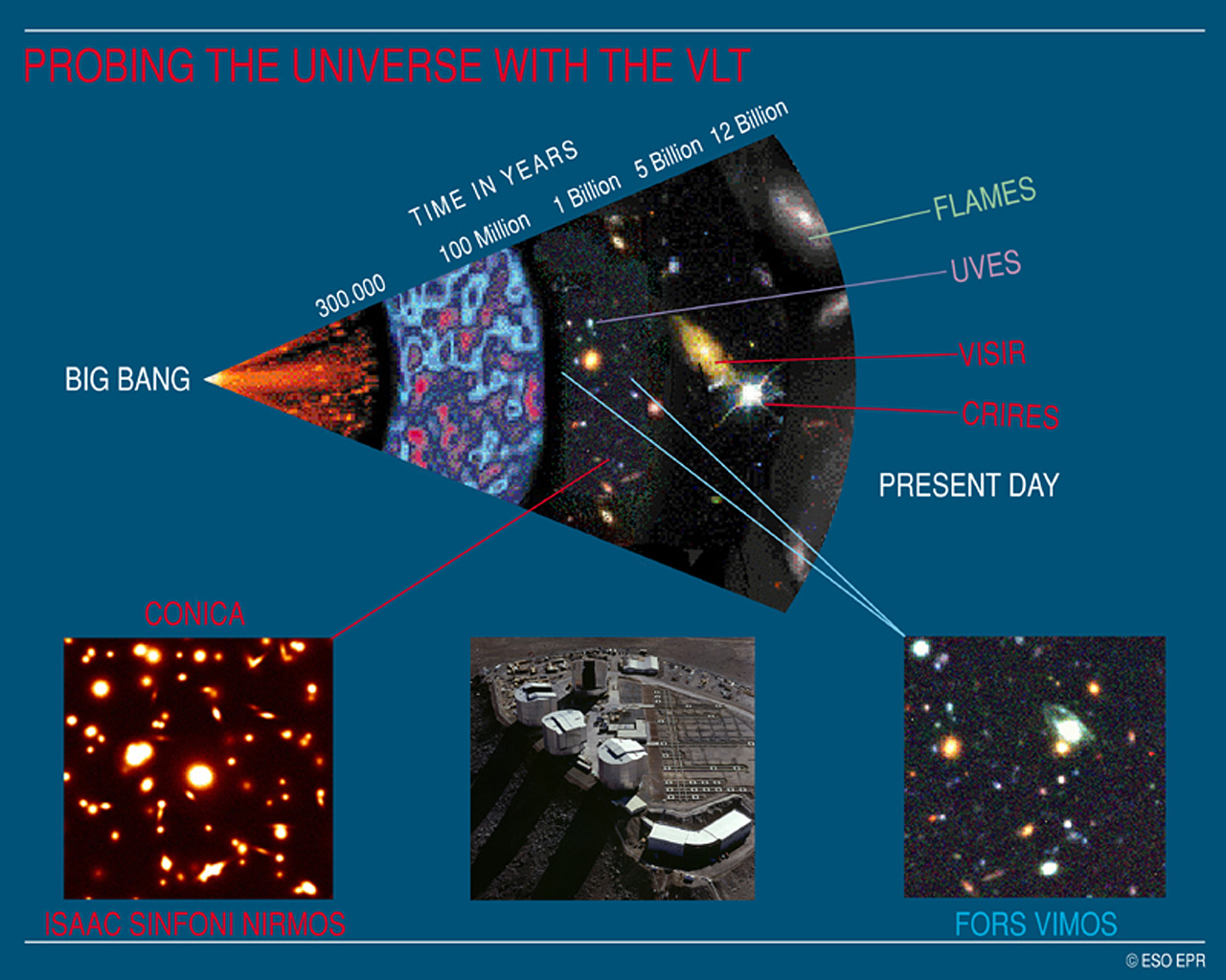 Probing the Universe with the VLT: From the Big Bang to the Present Day. Objects and epochs that may be observed with different VLT instruments