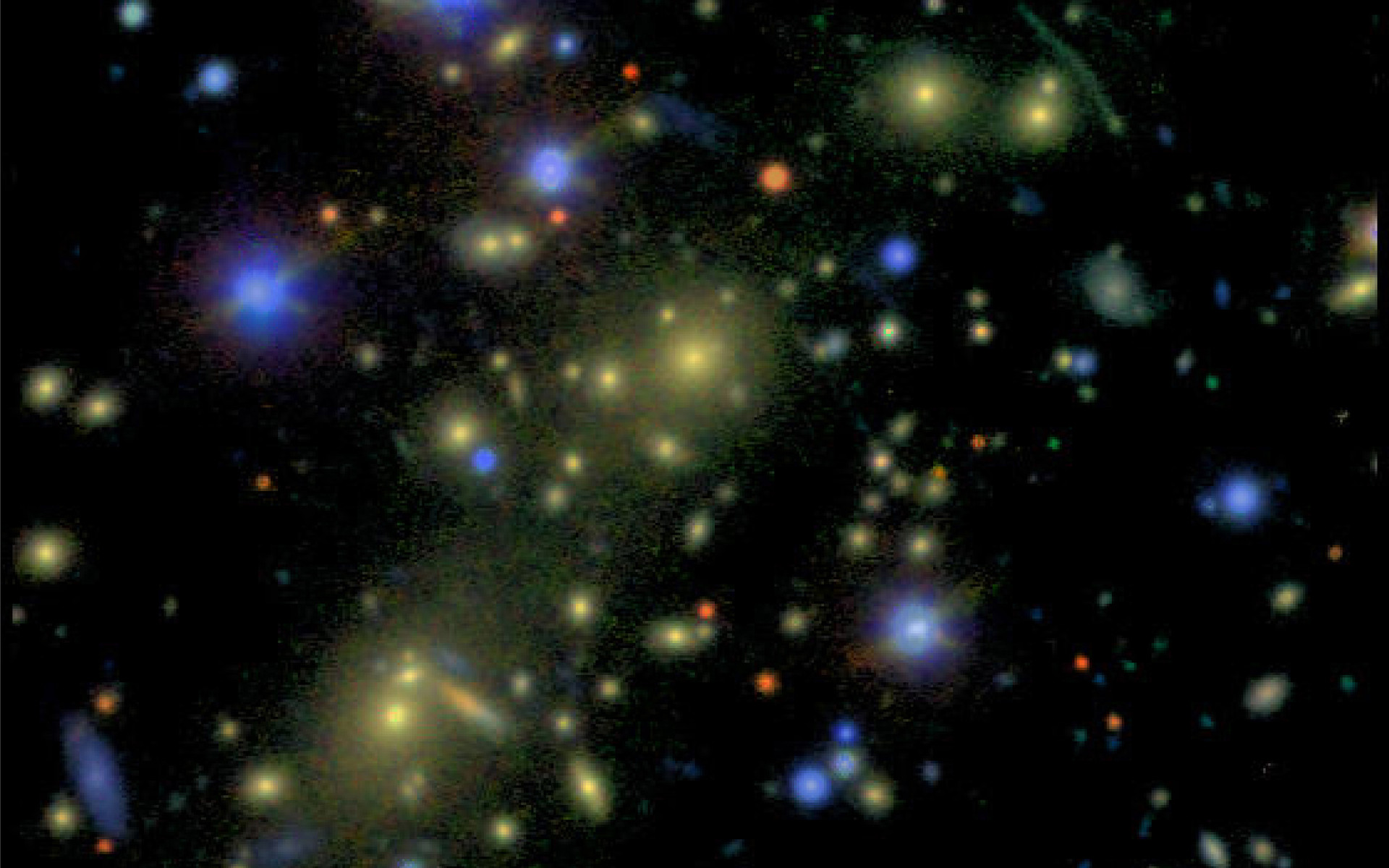 Colour composite image of the galaxy cluster 1ES 0657-558, based on data taken in the B (blue; exposure 900 sec), V (green; 600 sec), R (red; 500 sec) and I (near-infrared; 600 sec) filters with FORS1 in the standard observing mode at the VLT UT1. A few of the brighter stars in the field saturated the CCD during the exposure; their images have been cleaned in this reproduction. North is up and East is left.
