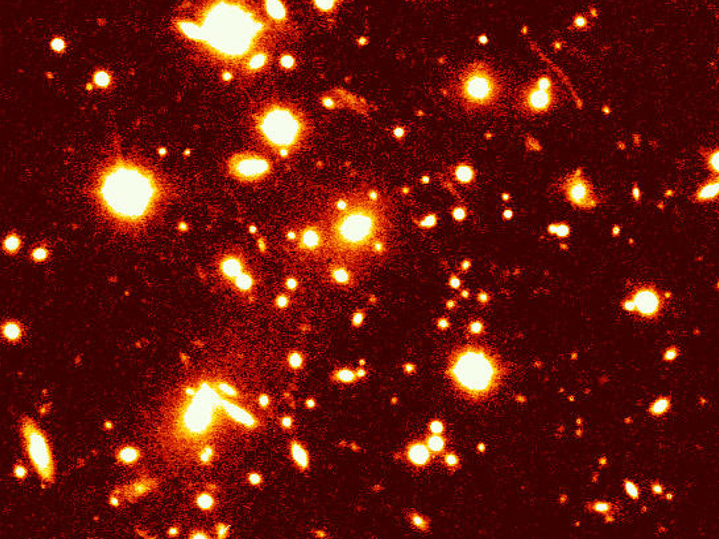 Photograph showing a (false-colour) image of the galaxy cluster 1ES 0657-558 prepared from data taken in the V (green) band filter. The arcs and arclets in this cluster are particularly well visible in this image. The total exposure time was 600 seconds. North is up and East is left.