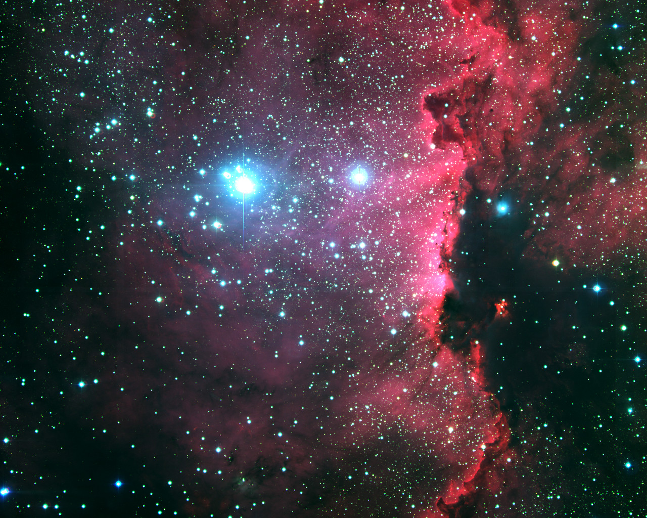 RCW 108 is a molecular cloud that is in the process of being destroyed by intense ultraviolet radiation from heavy and hot stars in the nearby stellar cluster NGC 6193, seen to the left in the photo. A series of images were obtained with the Wide Field Imager (WFI) of areas in the Milky Way band, including some in which interstellar nebulae of gas and dust are seen. Each frame records 8184 x 8196, or over 67 million, pixels in a sky field of 32 x 32 arcmin 2. The photo shows the RCW 108 complex of bright and dark nebulae in the southern association Ara OB1, a star-forming region in the constellation Ara (the Altar), deep in the southern sky. The resolution in this image has been degraded by reducing the number of pixels in one direction from about 8000 to 3000 in the "High-Resolution version", in order to make the image transportable over the web without incurring completely unacceptable transfer times. Still, it is very large, even in the highly compressed jpeg format, reflecting the great amount of details visible.