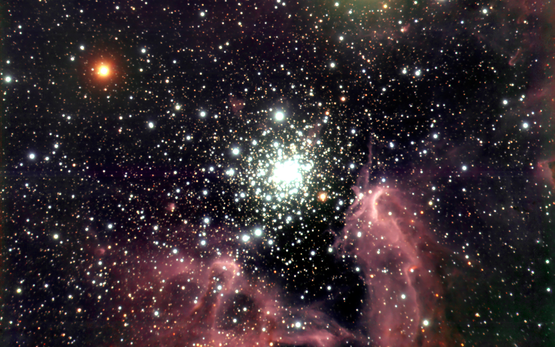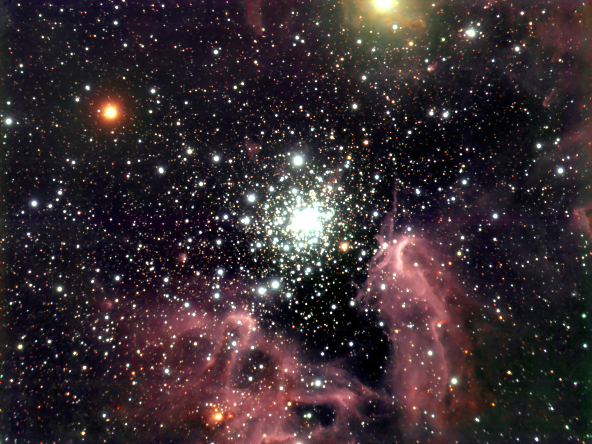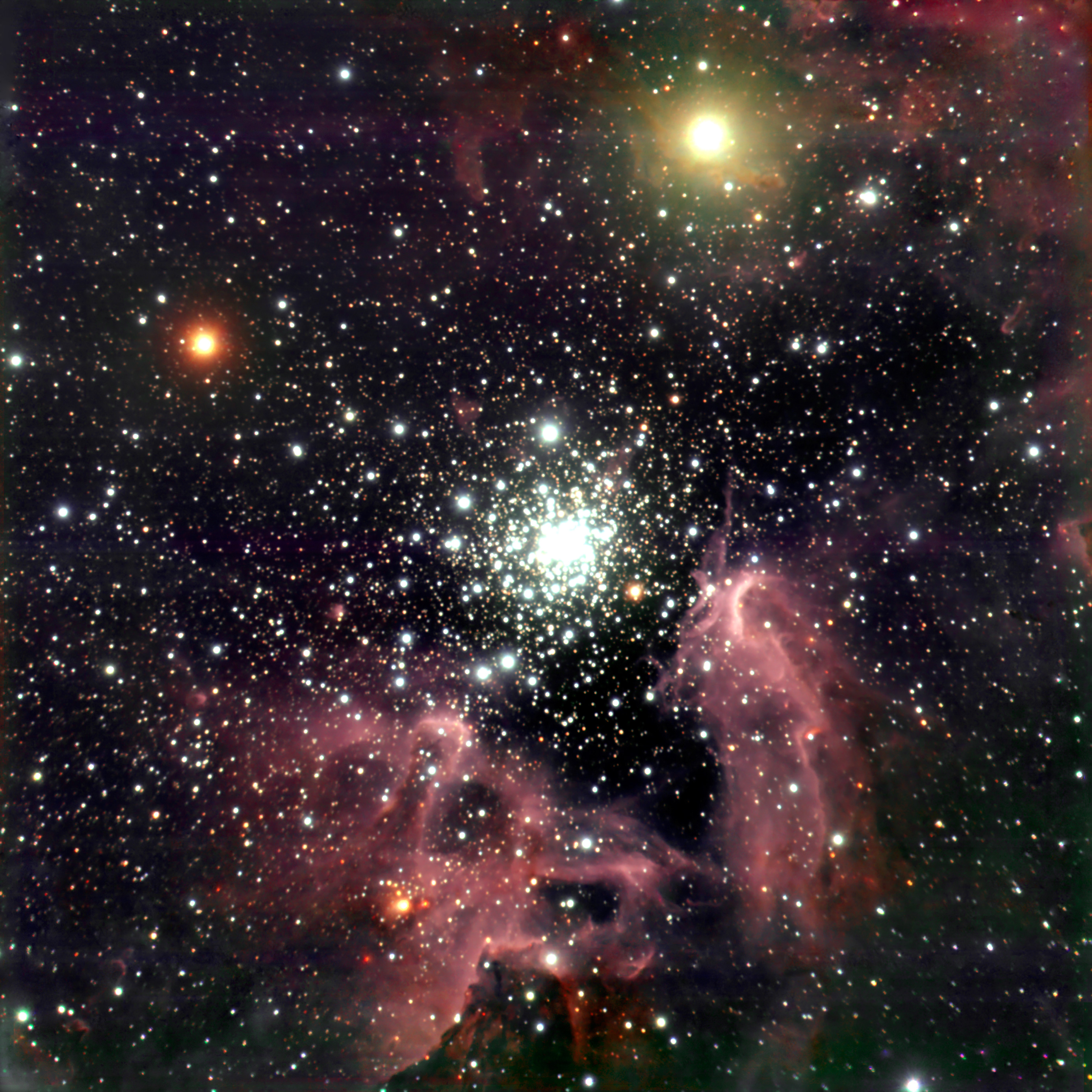 These images of the NGC 3603 region were obtained in three near-IR filter bands (Js, H and Ks) with the ISAAC instrument at the ANTU telescope at the VLT at Paranal. NGC 3603 is located in the Carina spiral arm of the Milky Way galaxy at a distance of about 20,000 light-years (6-7 kpc). It is the only massive, galactic "HII-region" (so denoted by astronomers because part of its hydrogen is ionized) in which a central cluster of strongly UV-radiating stars of types O and B that ionize the nebula can be studied at visual and near-infrared wavelengths. This is because the line-of-sight is reasonably free of dust in this direction; the dimming in near-infrared radiation due to intervening matter between the nebula and us is only about a factor of 2 (compared to 80 in visible light). The total mass of the hot O and B stars in NGC 3603 is over 2,000 solar masses. Together, the more than fifty heavy and bright O stars in NGC 3603 have about 100 times the ionizing power of the well-known Trapezium cluster in the Orion Nebula. In fact, the star cluster in NGC 3603 is in many respects very similar to the core of the large, ionizing cluster in the approximately eight times more distant Tarantula Nebula in the Large Magellanic Cloud. An important conclusion of studying this region is that there are lots of sub-solar mass stars in NGC 3603. Contrary to several theoretical predictions, these low-mass stars do form in violent starbursts. The overall age of stars in the contraction phase that are located in the innermost region of NGC 3603 was found to be 300 000 to 1 000 000 years. The counts clearly show that this cluster is well populated in sub-solar mass stars.
