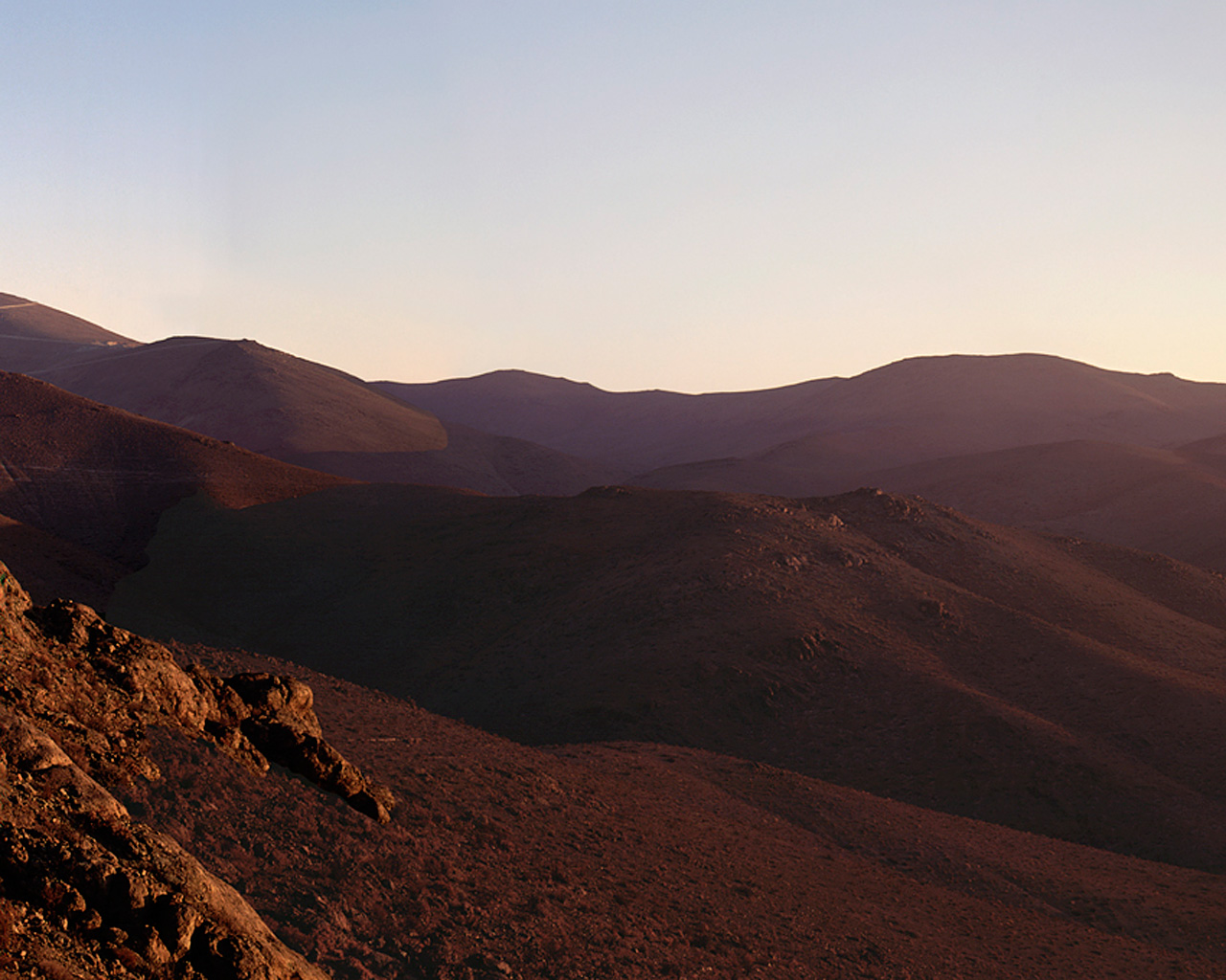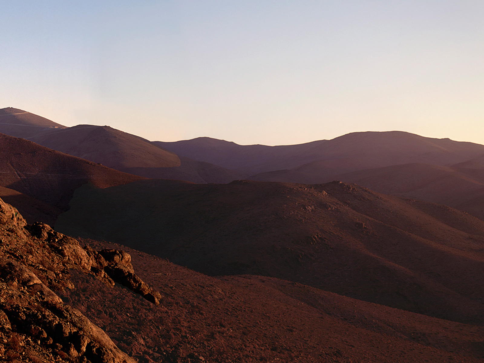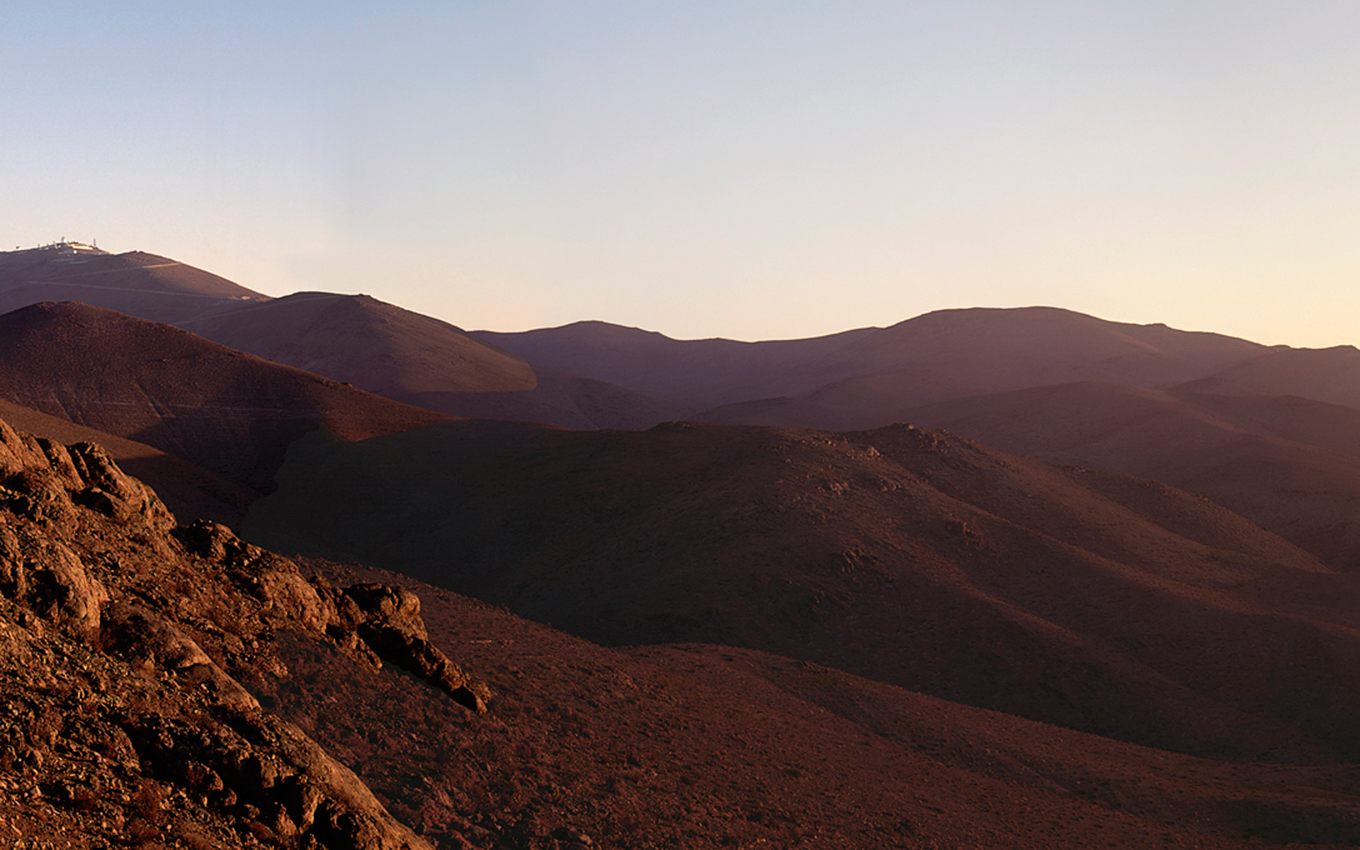 This unique panoramic view of the La Silla area stretches across an angle of nearly 270° and was obtained by combining nine 6x9 cm exposures with a Linhof Technika camera. It was made at sunset from a point near the access road that descends to the Pelicano Camp at the entry to the ESO area. The 3.6-m telescope tower is at the left on the observatory ridge, the living quarters are to the far right of the site and many of the telescope domes are seen in between. Photograph and computer work by Hans Hermann Heyer (ESO). The La Silla Observatory is located in the Chilean Atacama Desert, one of the driest and loneliest areas of the world. The land around this isolated peak was acquired in 1964 and following some years of construction work, the inauguration of ESO's first observatory took place in March 1969. The solitude of this remote desert site is well illustrated by the above panorama, obtained in 1996.