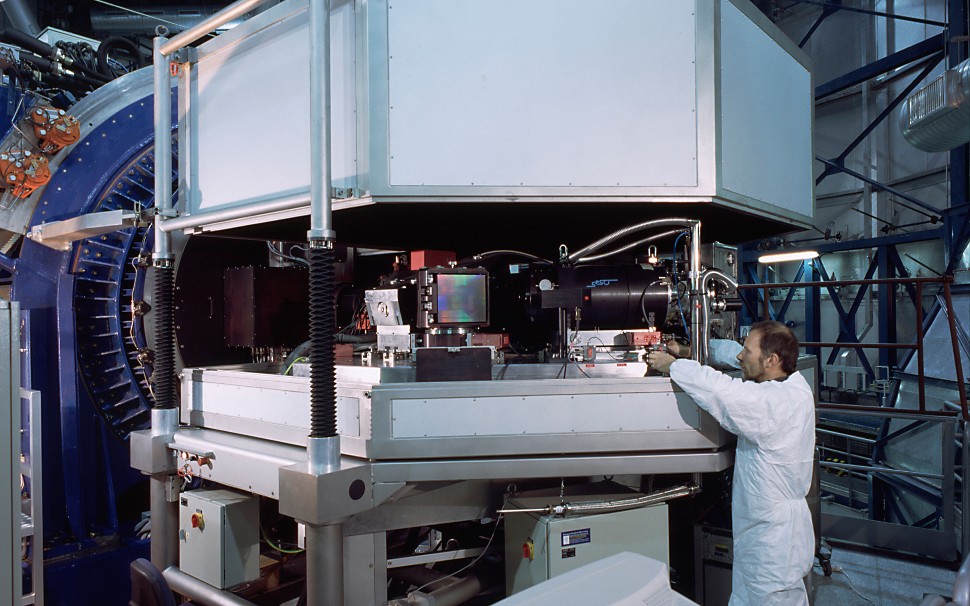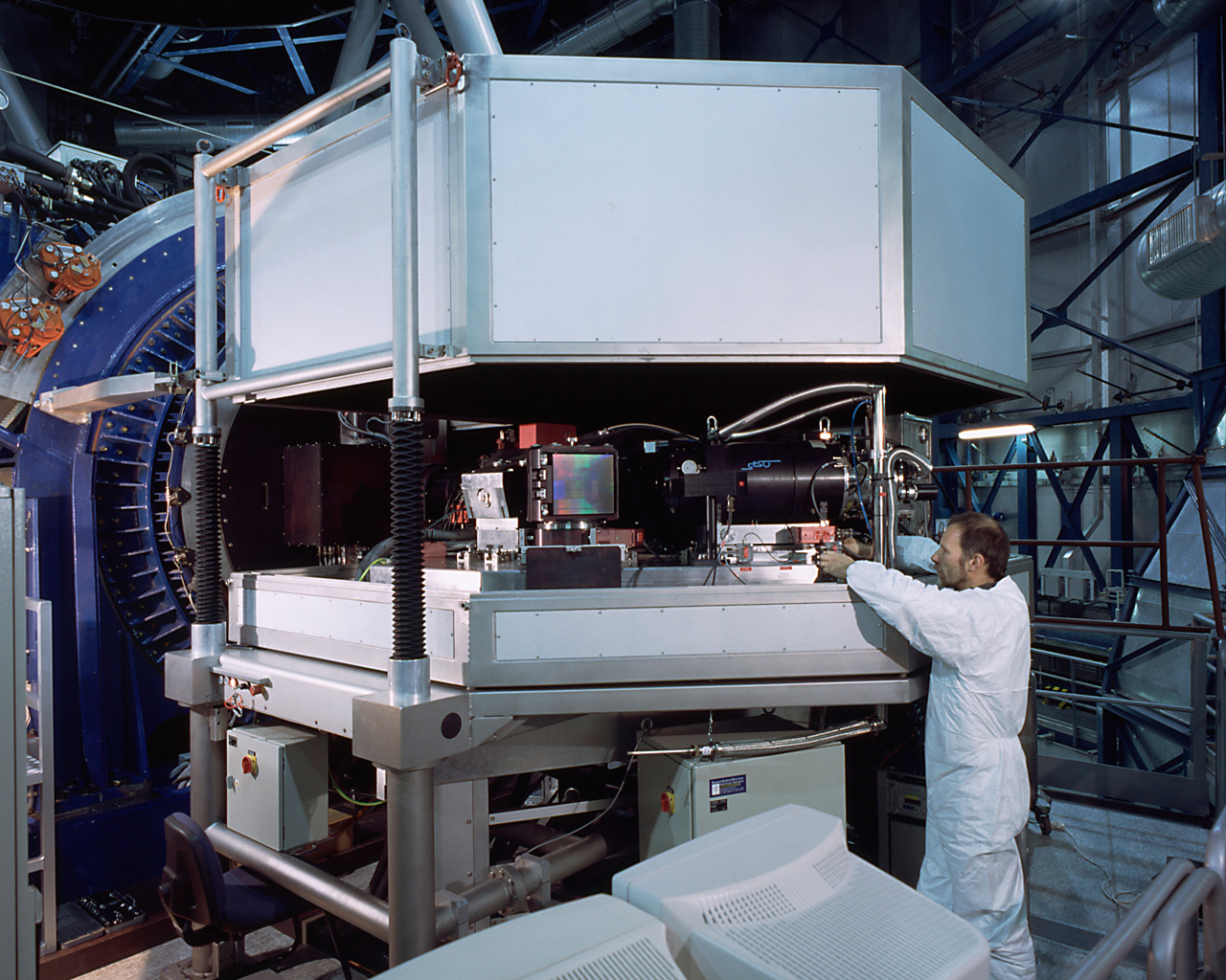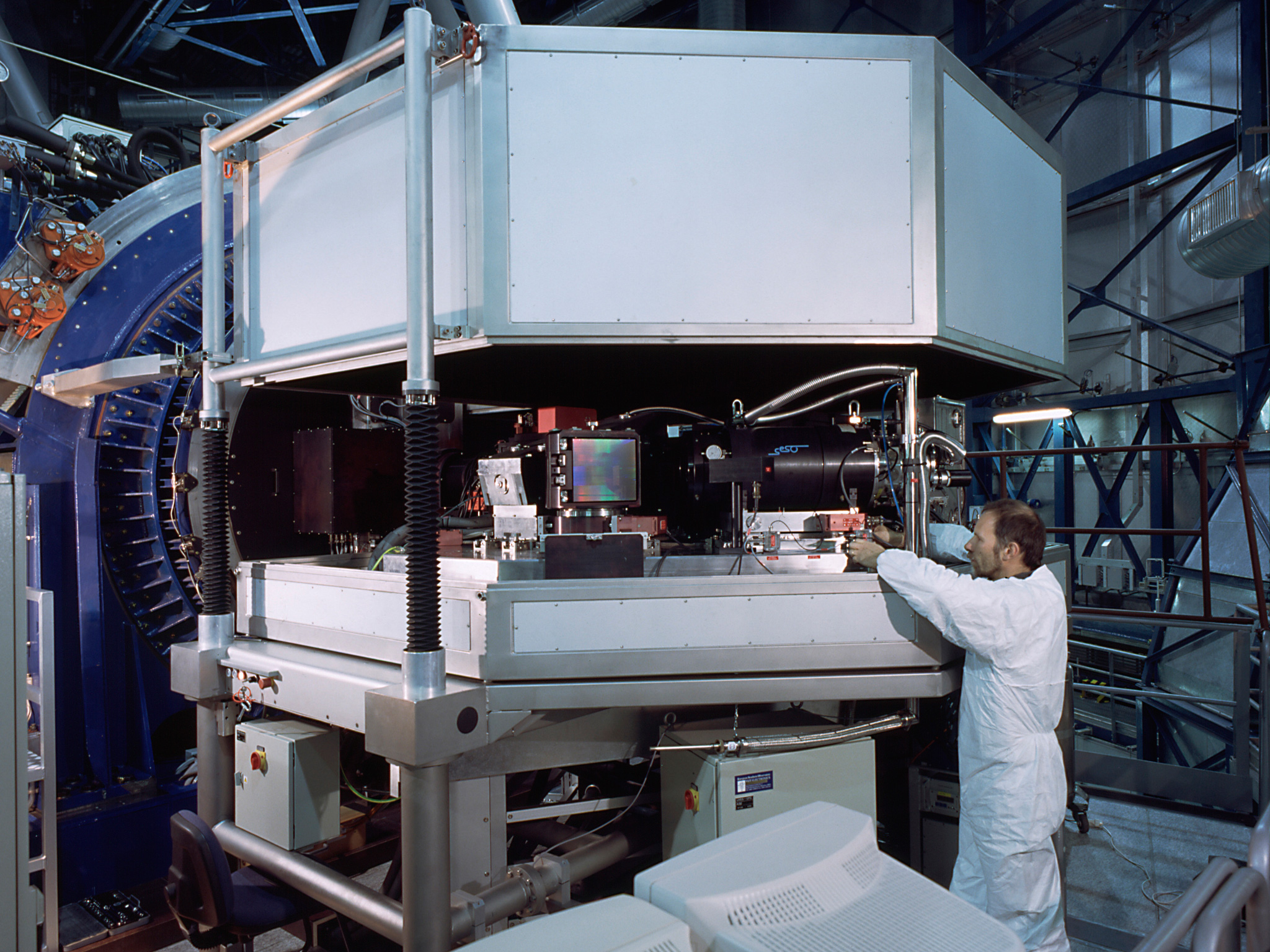 UVES, the high-resolution spectrograph for the VLT, was installed at one of the two Nasmyth foci of KUEYEN in September 1999. The first observations have been very promising (ESO Press Release eso9944). In this view, the cover has been raised and some of the optical elements are visible, e.g. a large grating that serves to disperse the light.