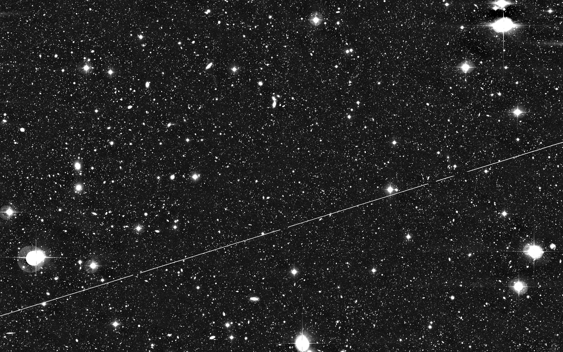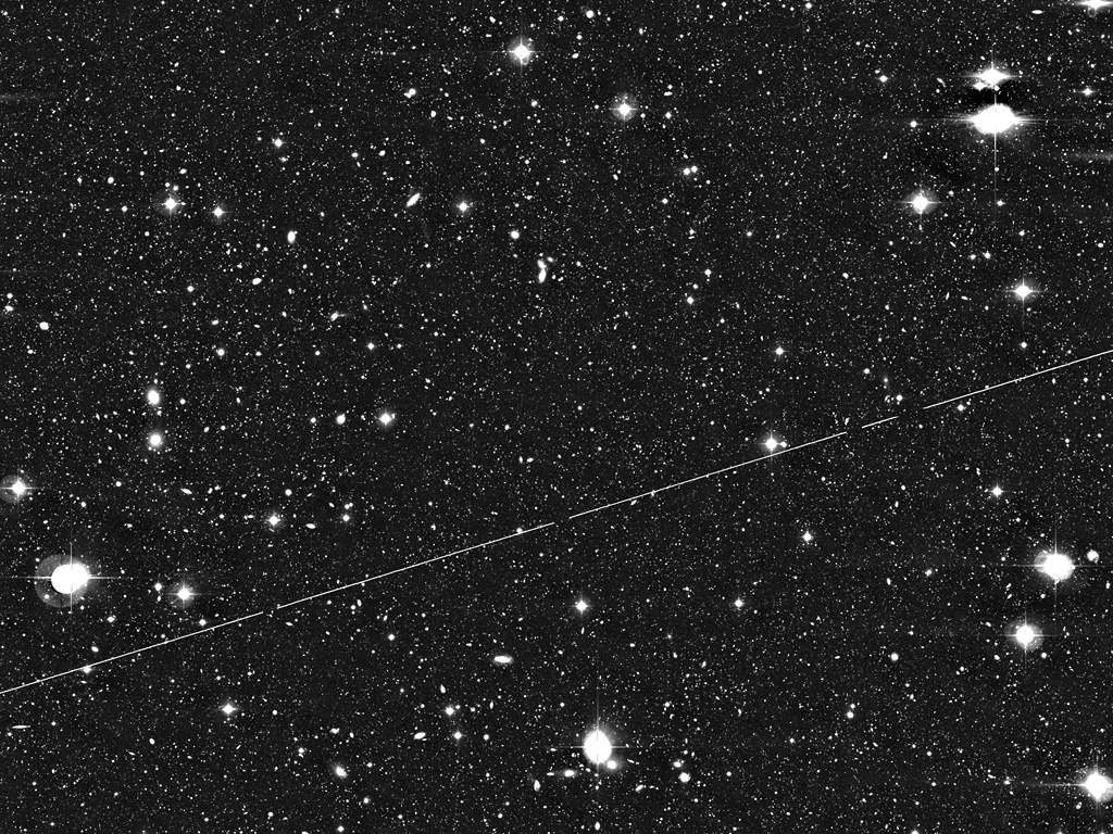 This image displays a 0.5° x 0.5° sky area in the direction of the so-called AXAF Deep Field in which few bright objects are seen. This photo results from the combination of 28 individual WFI exposures behind a B(lue) optical filter with a total exposure time of 7 hours. About 100,000 galaxies are visible in the original image that encompasses approx. 8000 x 8000 pixels (1 pixel = 0.24 arcsec). The light trail of an artificial satellite crosses the field. The High-Res version included here has been compressed by a factor of four in order to facilitate transport over the Web. North is up and East is left.