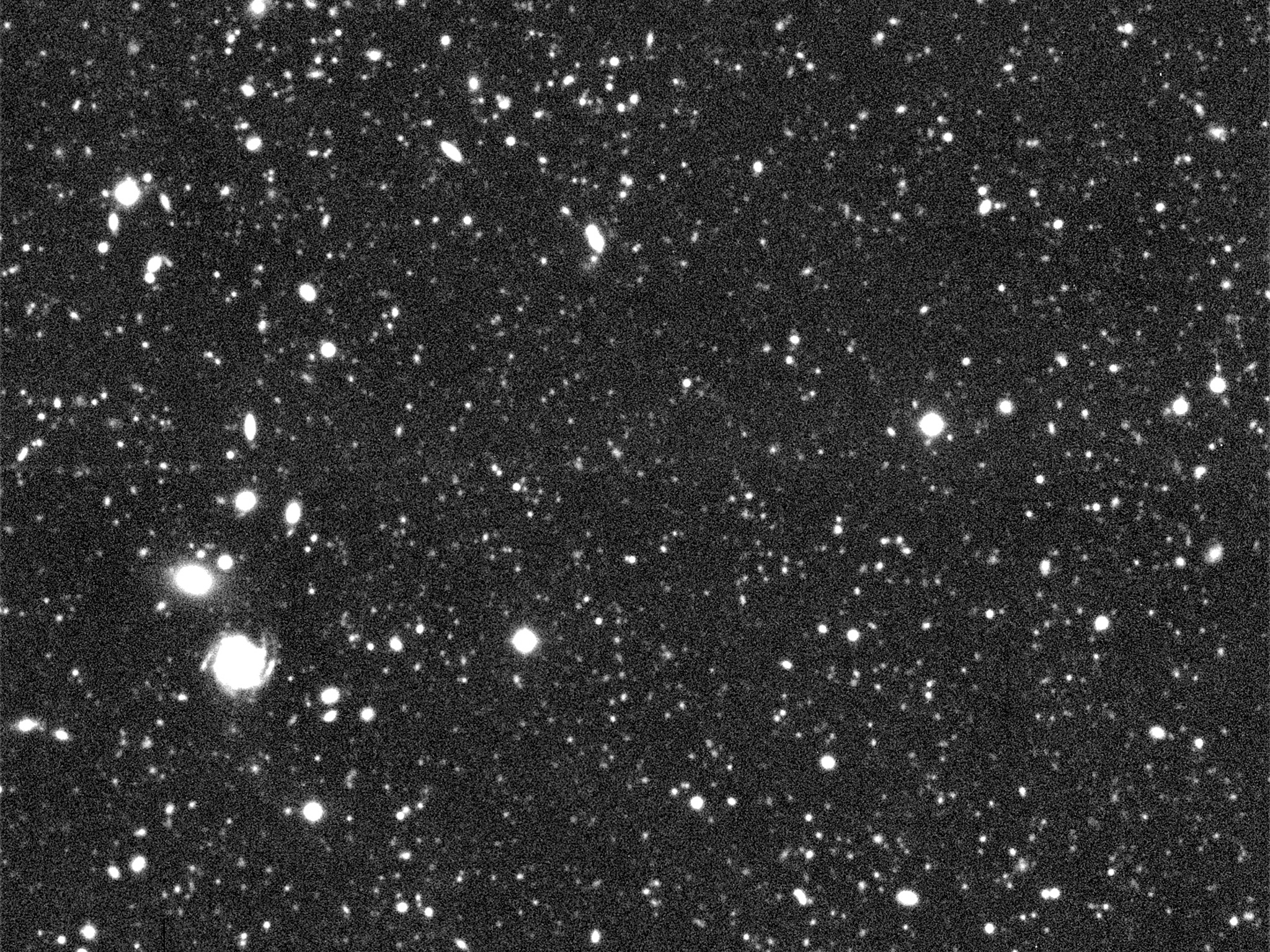 Image showing a small area of the AXAF Deep Field at the original resolution. It measures about 5.8 x 6.5 arcmin 2, i.e. the area corresponds to approx. 1/30 of the full frame. The background is extremely crowded with very faint objects - most of these are galaxies at very large distances. Some of them are likely to be identified as strong X-ray emitters when this field is observed with the Chandra X-ray Observatory.