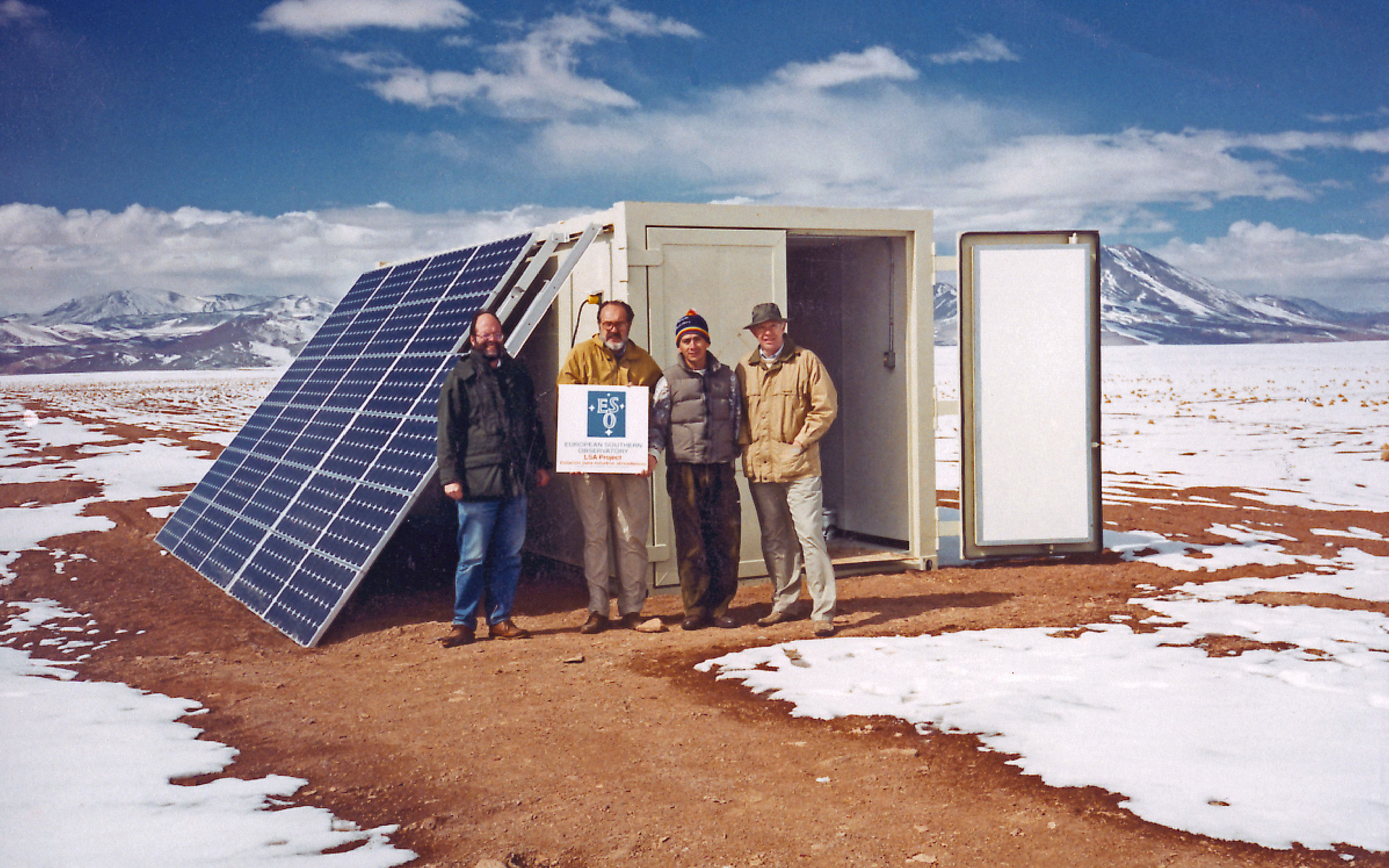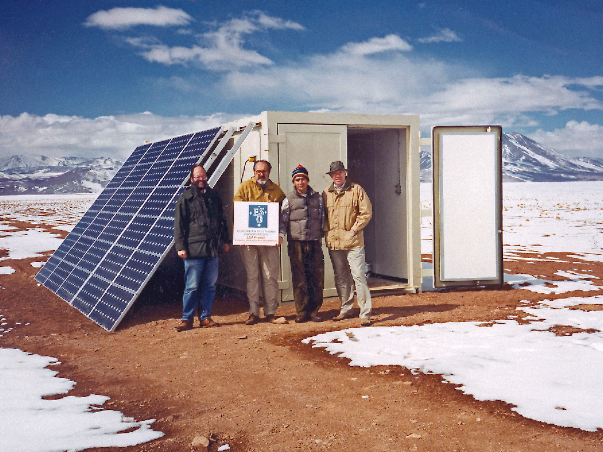 Site testing at Pampa de Pajonales, Standing in front of the container and the photovoltaic modules that provided power to the interferometer and 183 Ghz water vapour radiometer (left to right): Lars-Ake Nyman, Daniel Hofstadt, Angel Otárola and Peter Shaver.