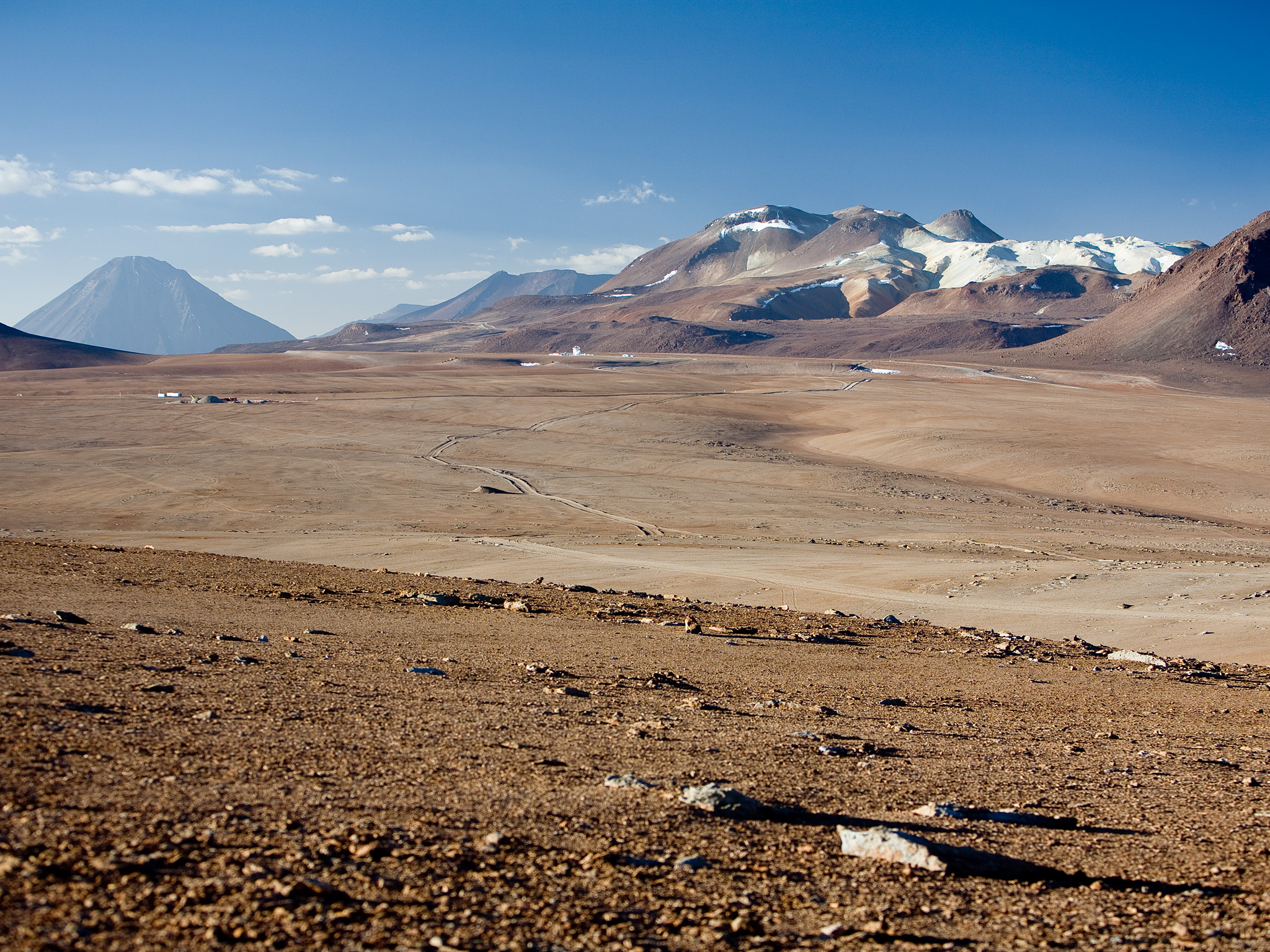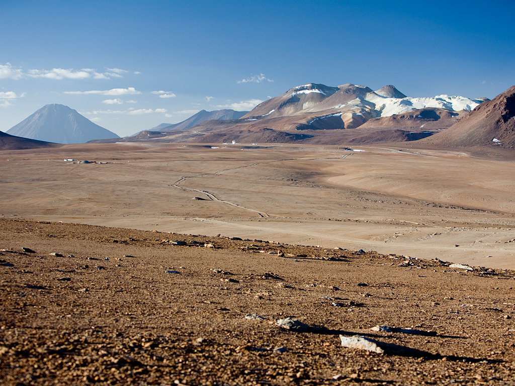 The APEX telescope is at the edge of the 5,100m altitude Chajnantor plateau, together with the ALMA operation site (in construction). The 5,920m Licancabur volcano is towering in the background, and Cerro Chascon is visible to the right. Image taken in December 2005.
