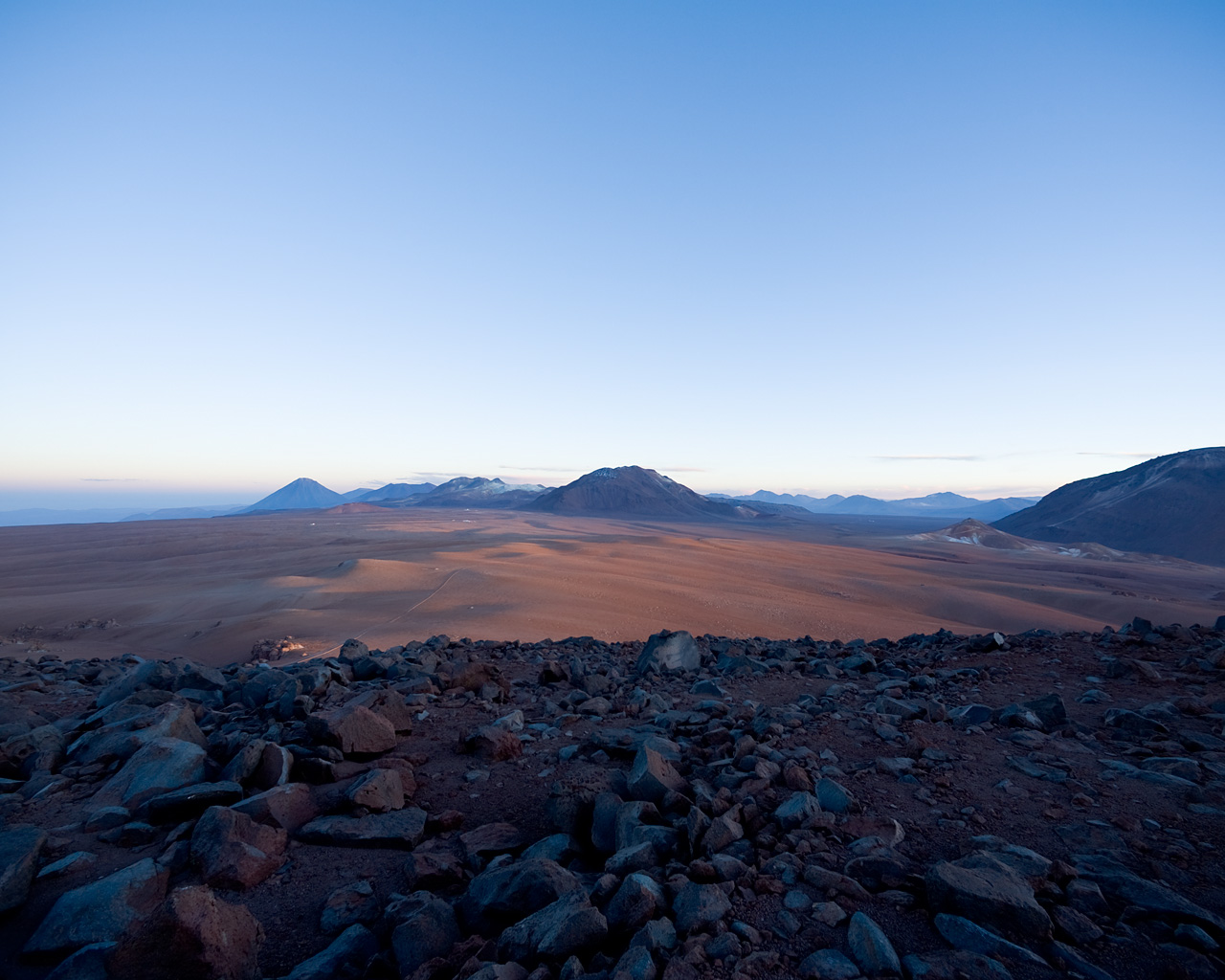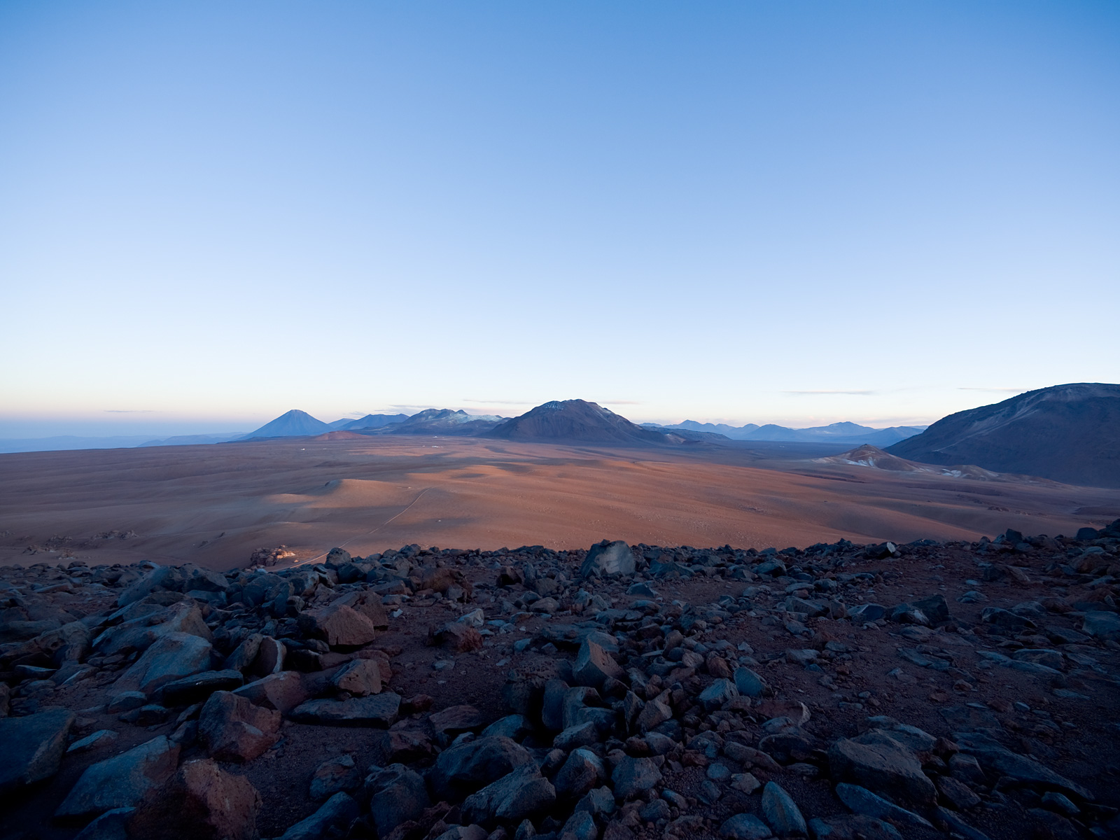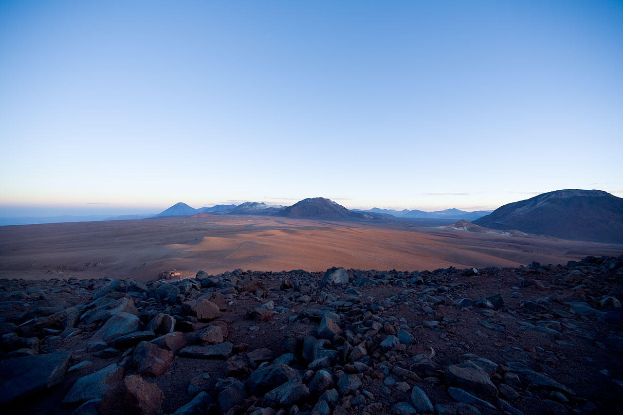 The Llano de Chajnantor at sunrise, looking North toward the AOS site and APEX telescope. The ALMA antennas will be positioned on this 5100m altitude plateau. Image taken in January 2007.