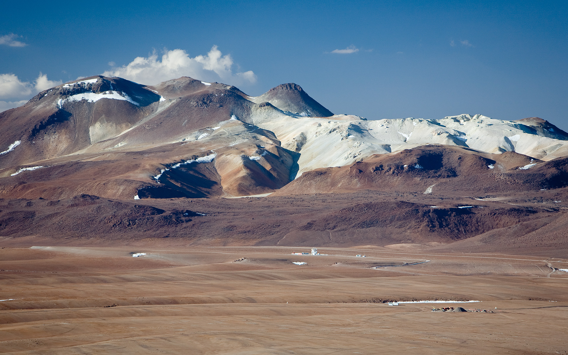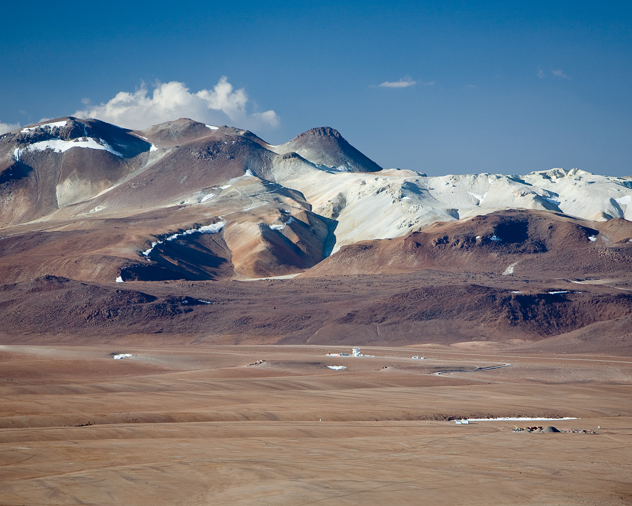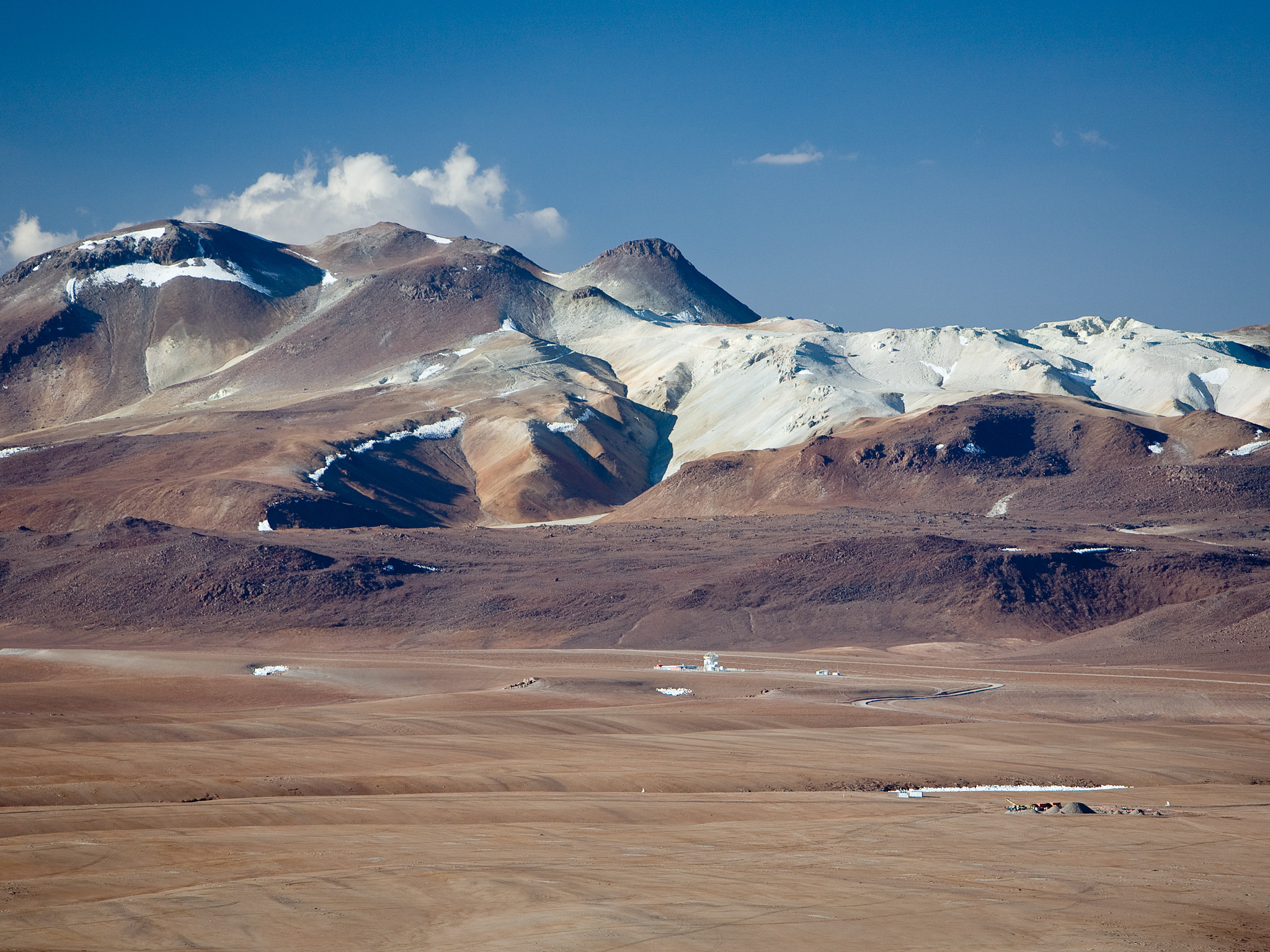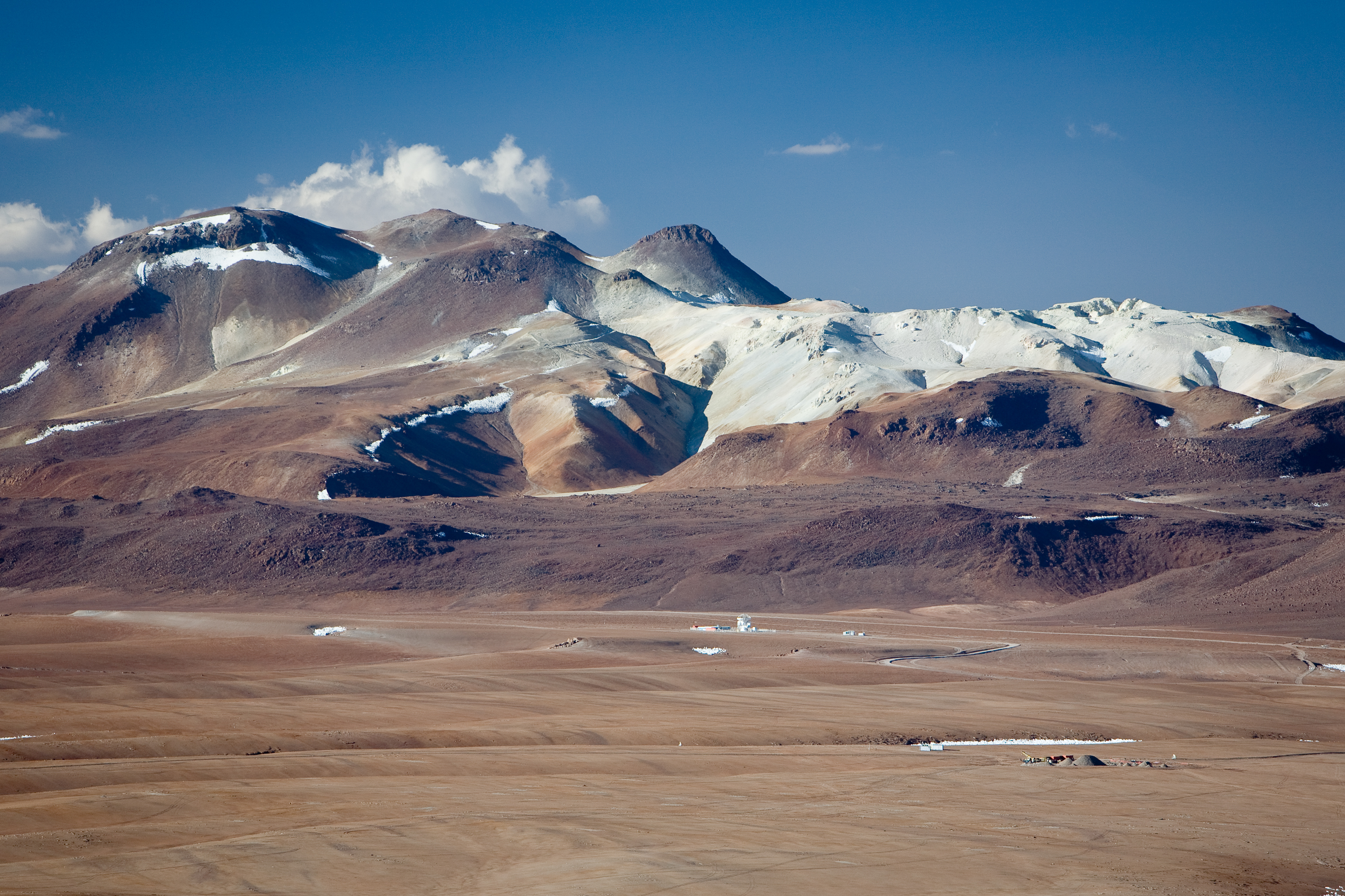The 5,100-m altitude Chajnantor plateau, toward the north. The APEX telescope is visible at a distance, with the site of the ALMA operation site. In the background, a mineral deposits is visible on Cerro Toco. Image taken in December 2005.