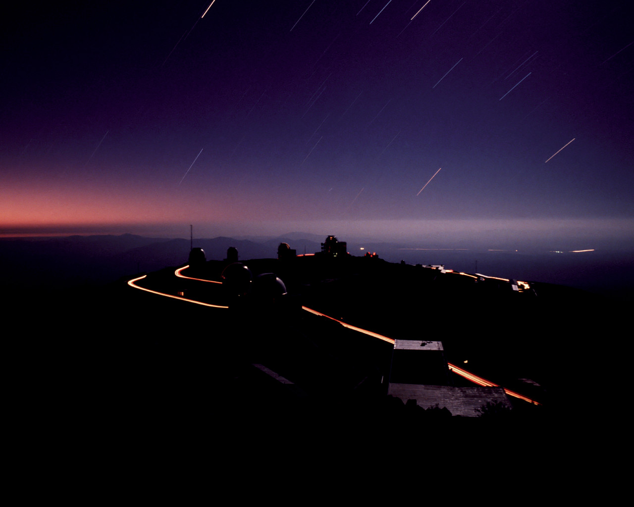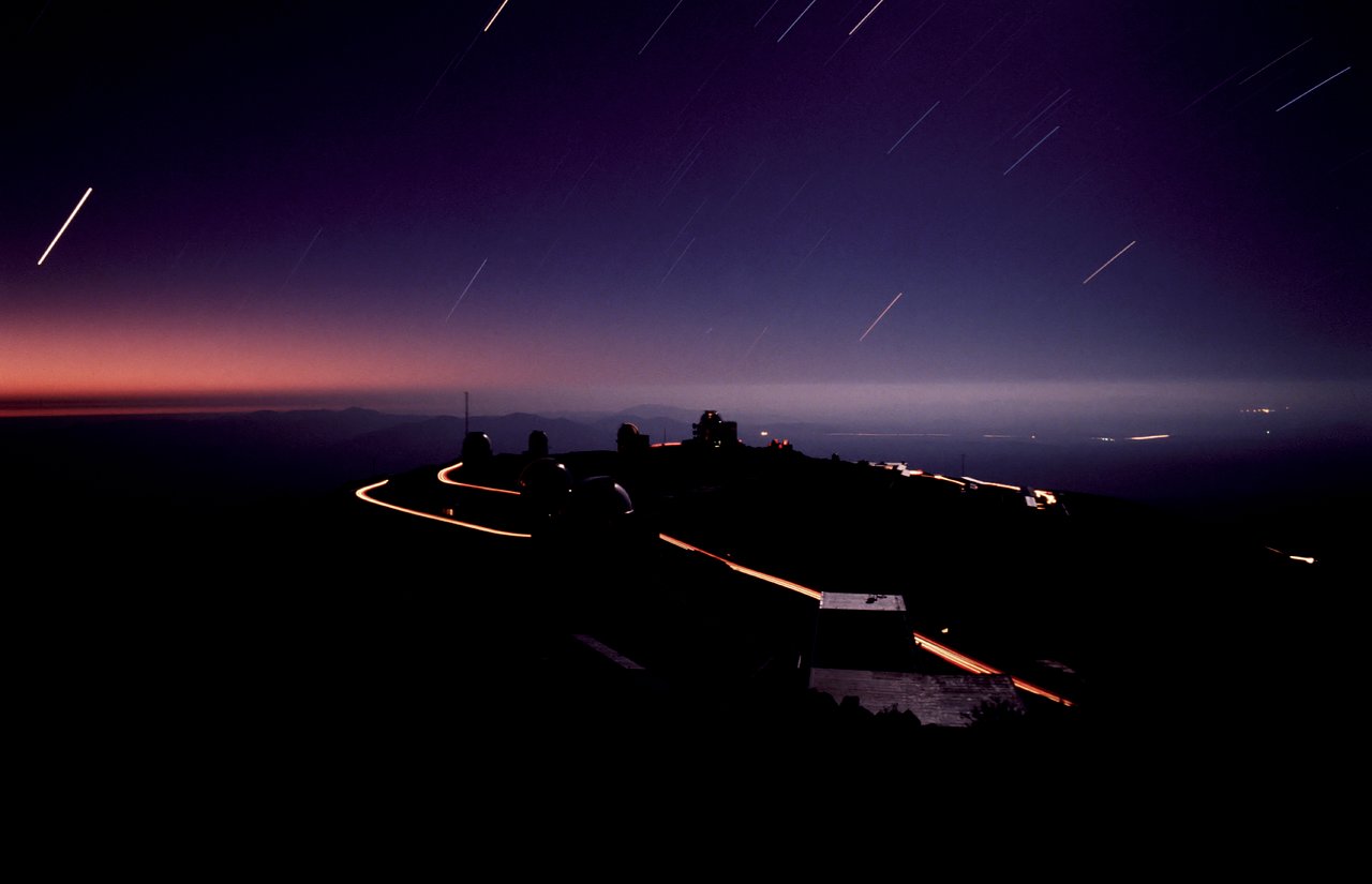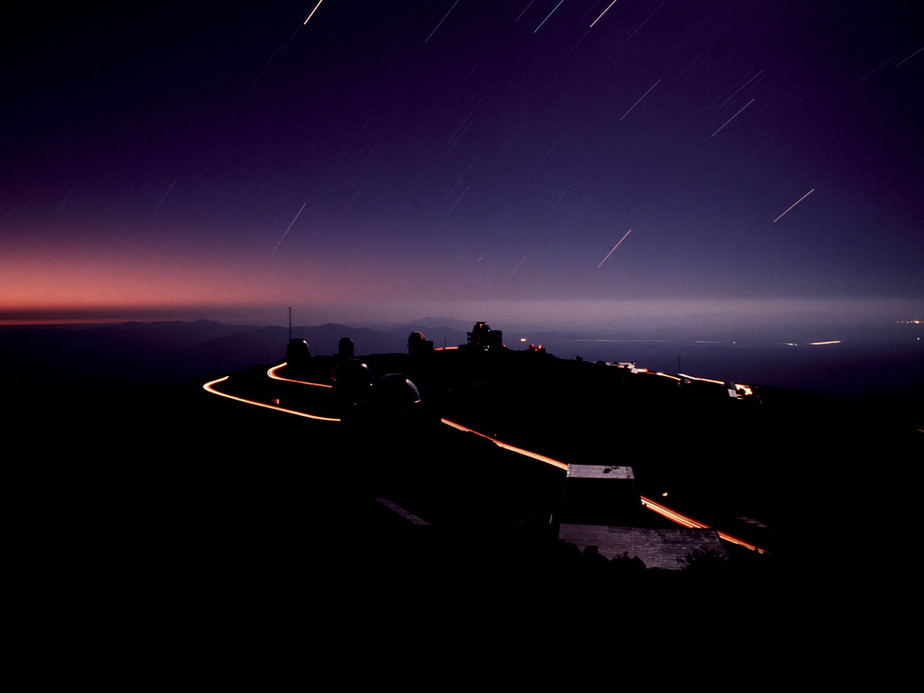 This long exposure was taken from the 3.6m telescope. Because of the rotation of the Earth during this long exposure, the stars appear as trails in the sky. Cars driving between the telescopes have left the bright lines along the road. Notice the very dim headlights used to drive at night on this dark side, so not to disturb the observations.