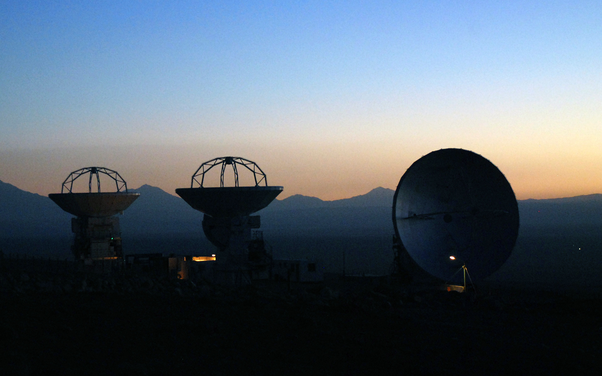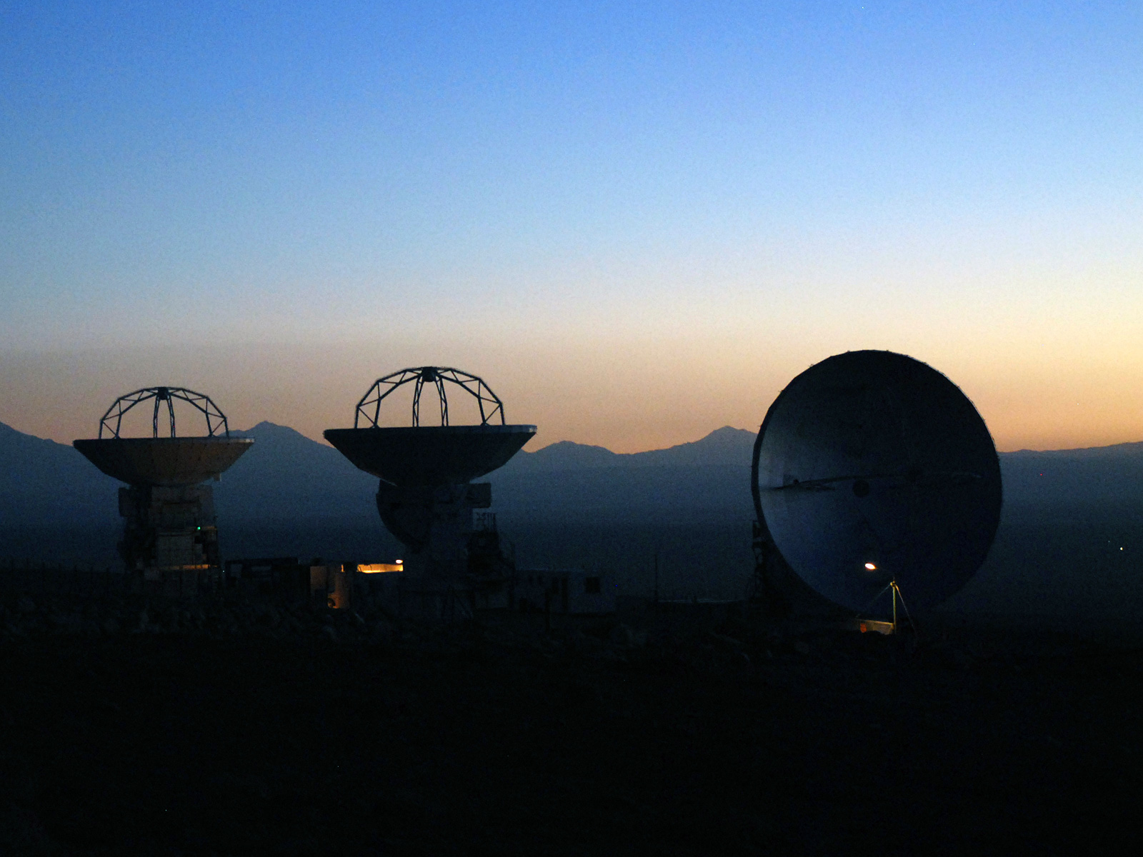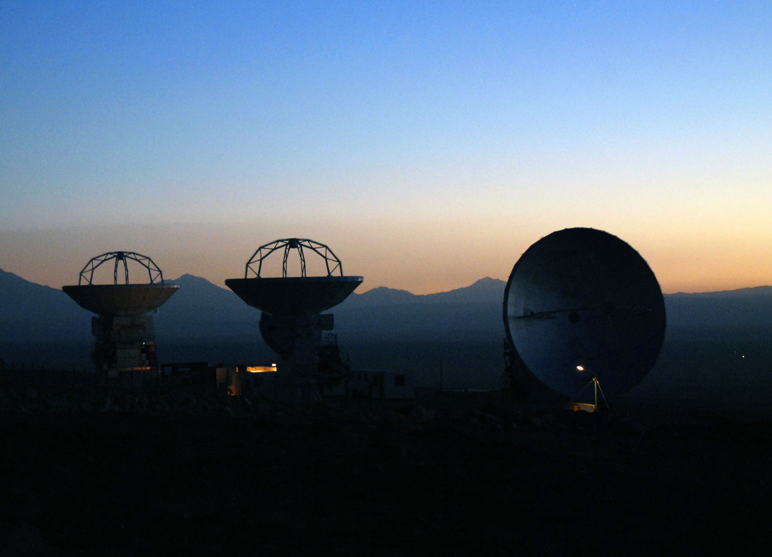 The first three Japanese ALMA antennas of the Atacama Compact Array (ACA) at the ALMA Operation Support Facility, located close to the town of San Pedro de Atacama in the Chilean Atacama Desert, at an altitude of 2900m.