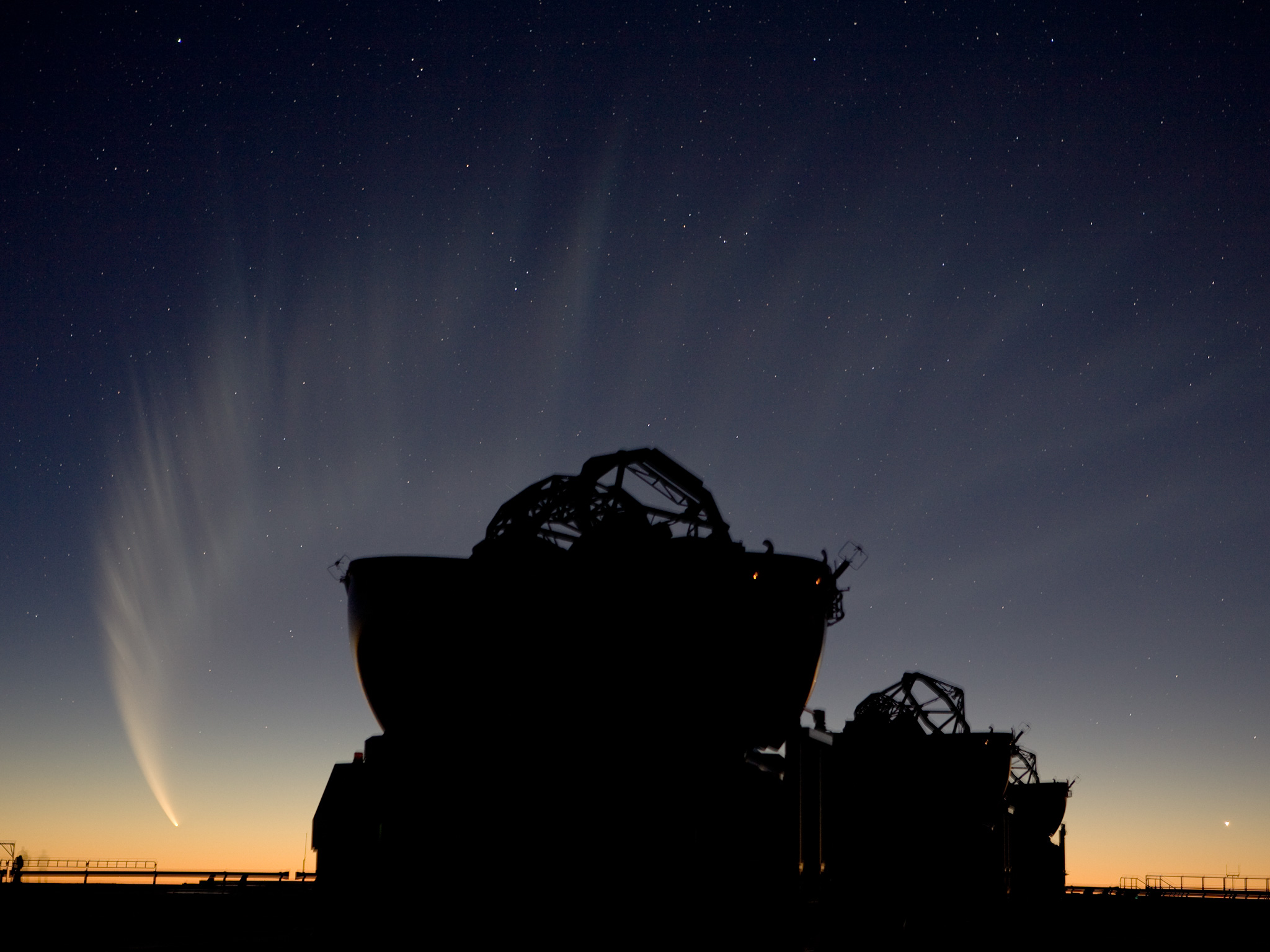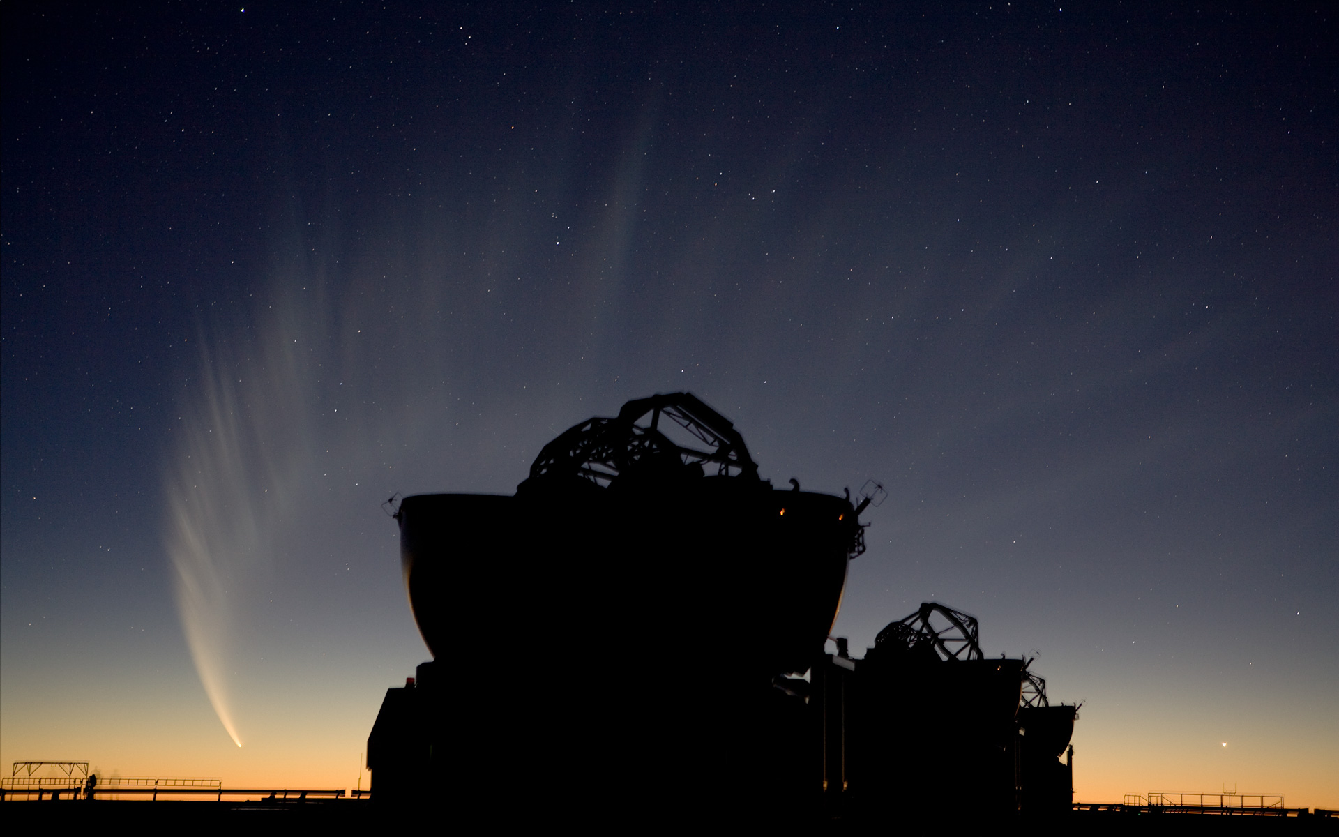 Comet McNaught after sunset, two Auxiliary Telescopes of the VLTI in foreground. 19 January 2007.