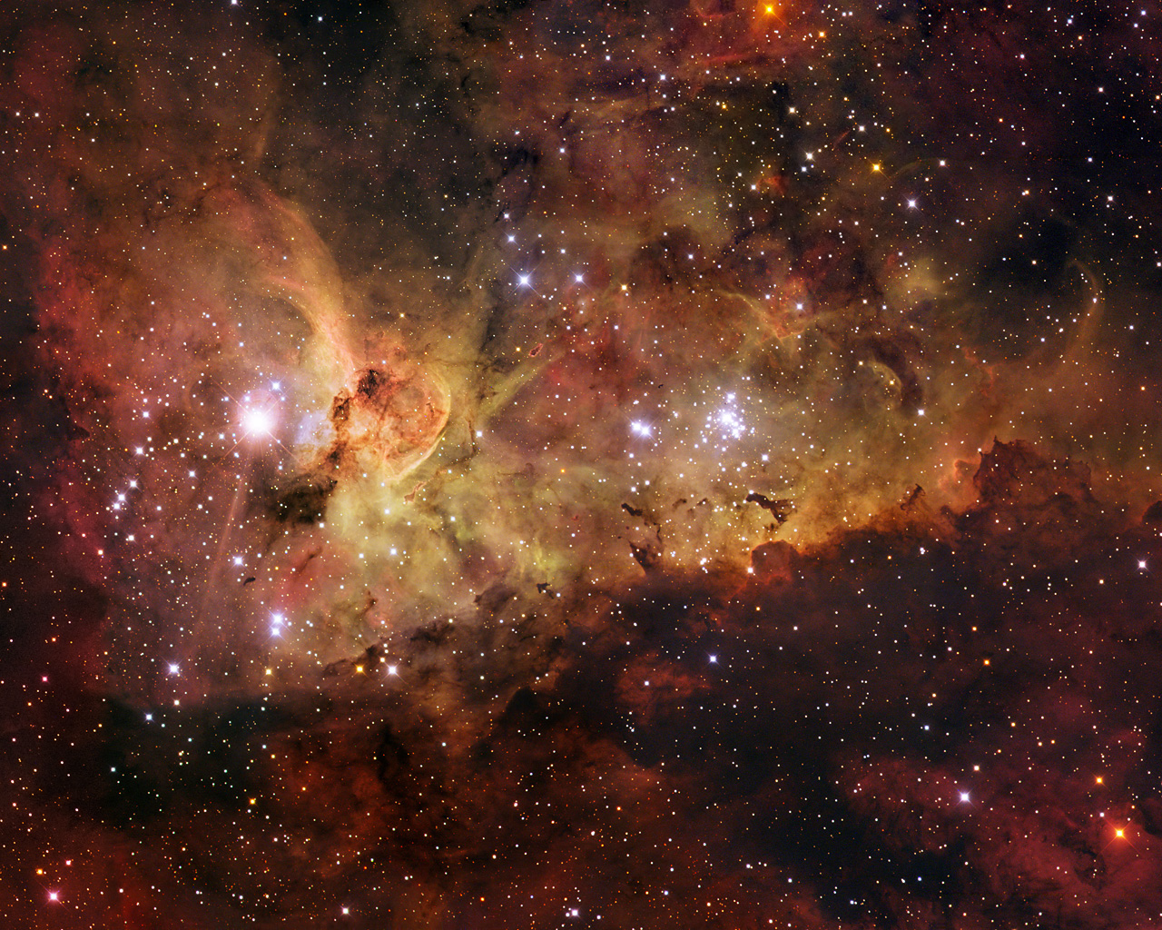 The Carina Nebula is a large bright nebula that surrounds several clusters of stars. It contains two of the most massive and luminous stars in our Milky Way galaxy, Eta Carinae and HD 93129A. Located 7500 light years away, the nebula itself spans some 260 light years across, about 7 times the size of the Orion Nebula, and is shown in all its glory in this mosaic. It is based on images collected with the 1.5-m Danish telescope at ESO's La Silla Observatory.