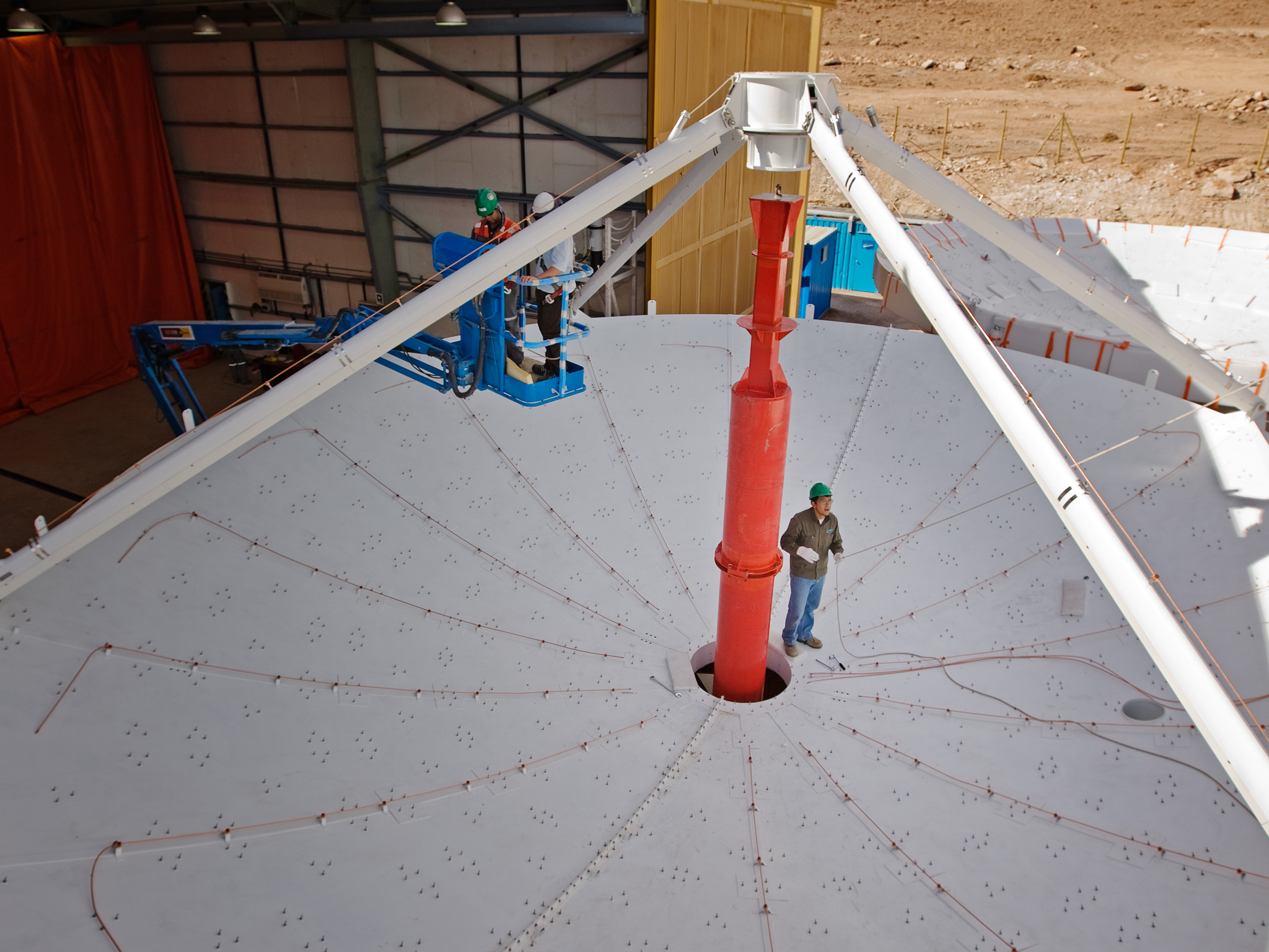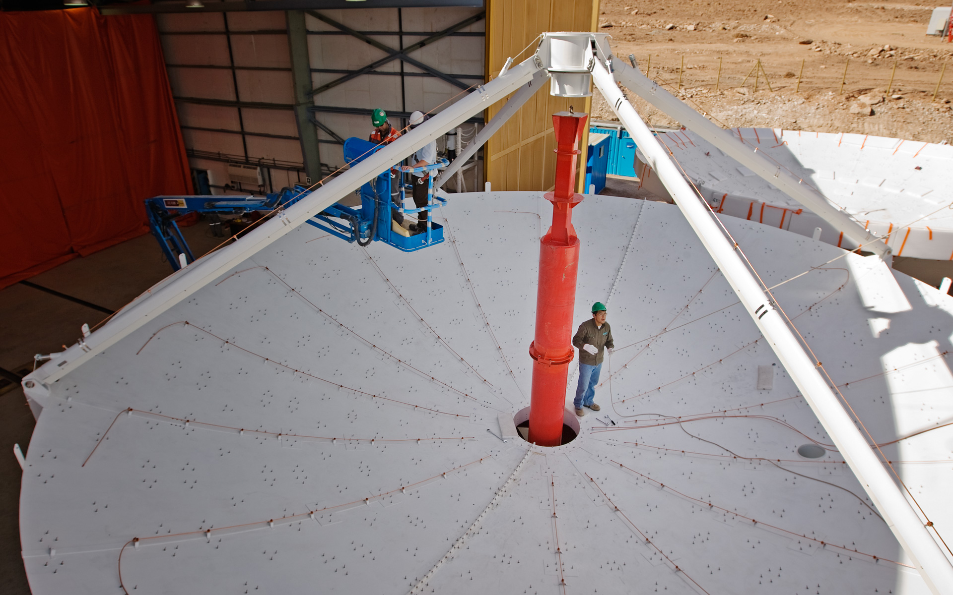 In this photograph taken on 18 August 2009, a European ALMA antenna takes shape at the observatory's Operations Support Facility (OSF). ALMA, the Atacama Large Millimeter/submillimeter Array, is a revolutionary astronomical telescope, comprising an array of 66 giant 12-metre and 7-metre diameter antennas observing at millimetre and submillimetre wavelengths. The telescope is being built on the breathtaking location of the Chajnantor plateau, at 5000 metres altitude in the Chilean Andes. The OSF, at which the antennas are being assembled and tested, is at an altitude of 2900 metres. ESO has contracted with the AEM (Alcatel Alenia Space France, Alcatel Alenia Space Italy, European Industrial Engineering S.r.L., MT Aerospace) Consortium for the supply of 25 of the 12-metre diameter ALMA antennas, with options to increase the number to 32. ALMA is a partnership of Europe, North America and East Asia in cooperation with the Republic of Chile.