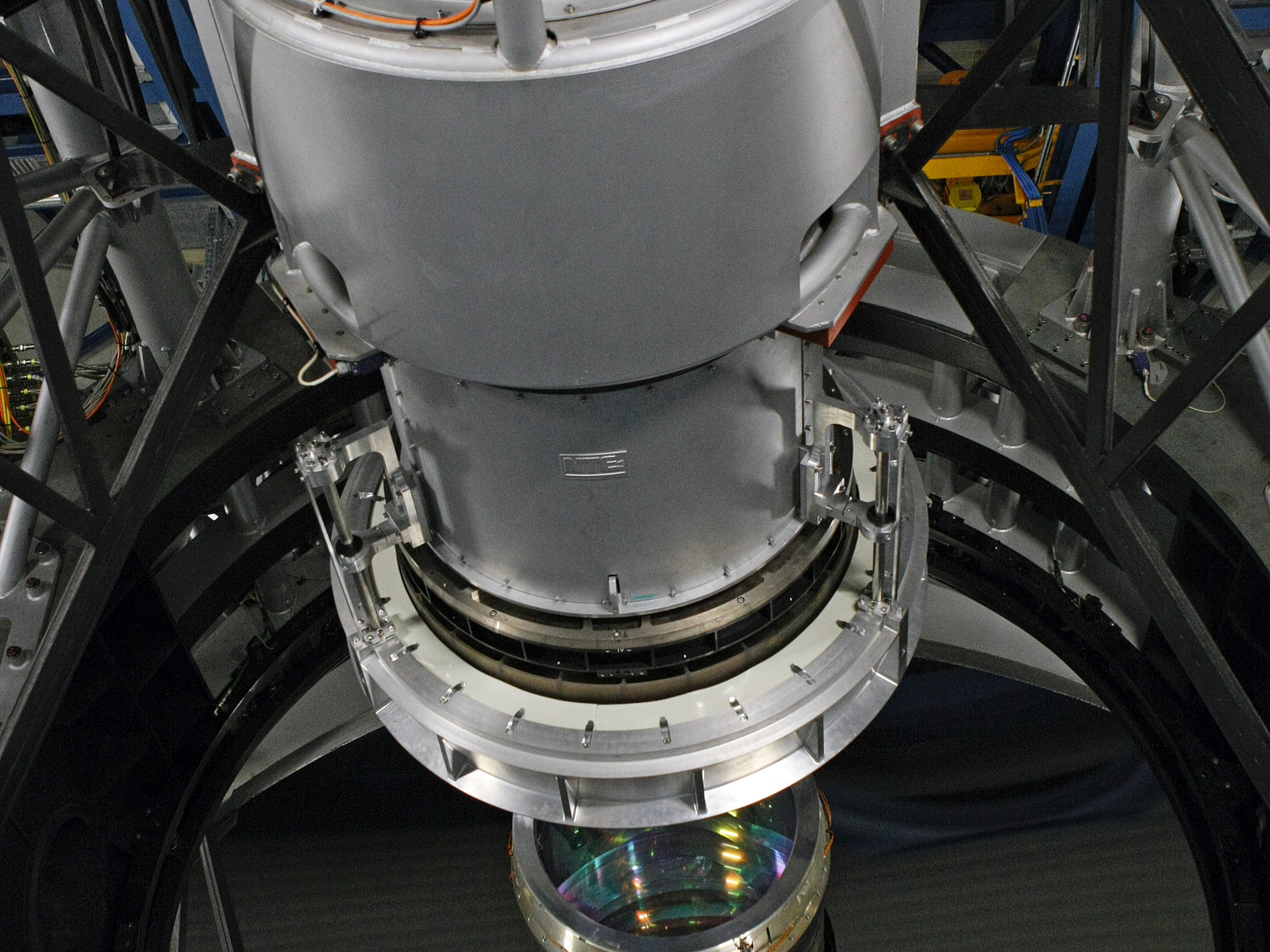 The 4.1 metre mirror of the Visible and Infrared Survey Telescope for Astronomy, VISTA, on Paranal. The entrance lens of the giant infrared camera is visible at the centre, under the structure that supports the secondary mirror.