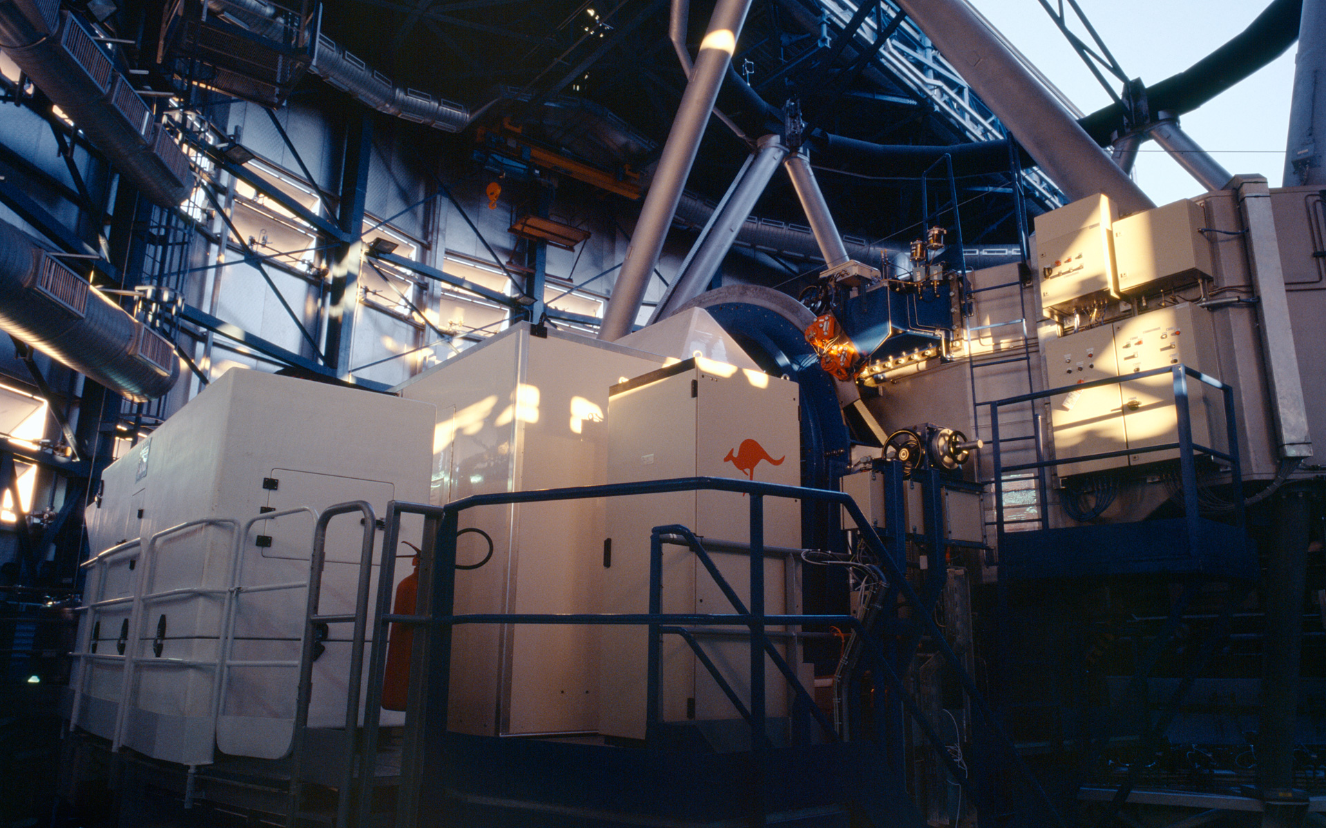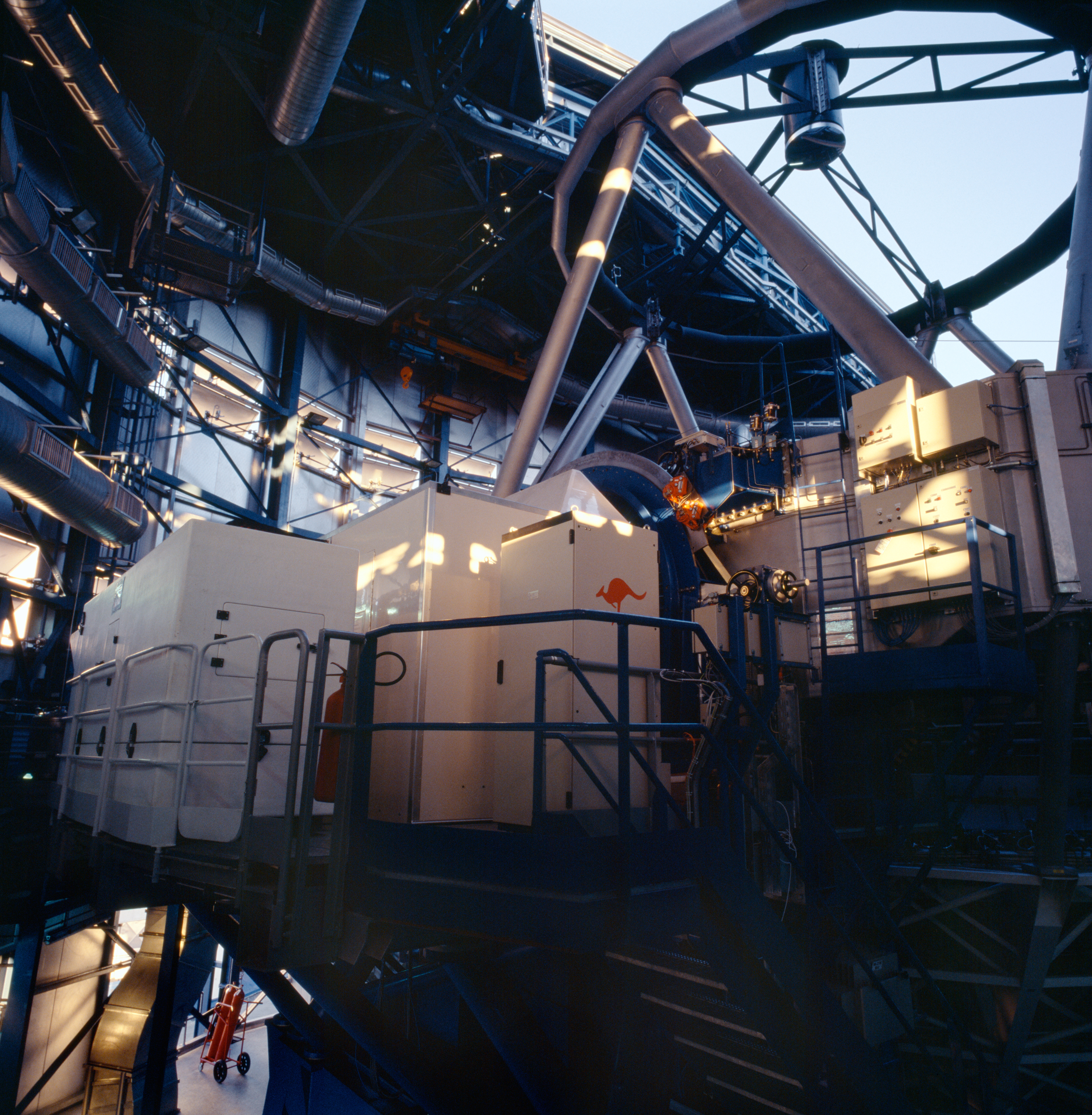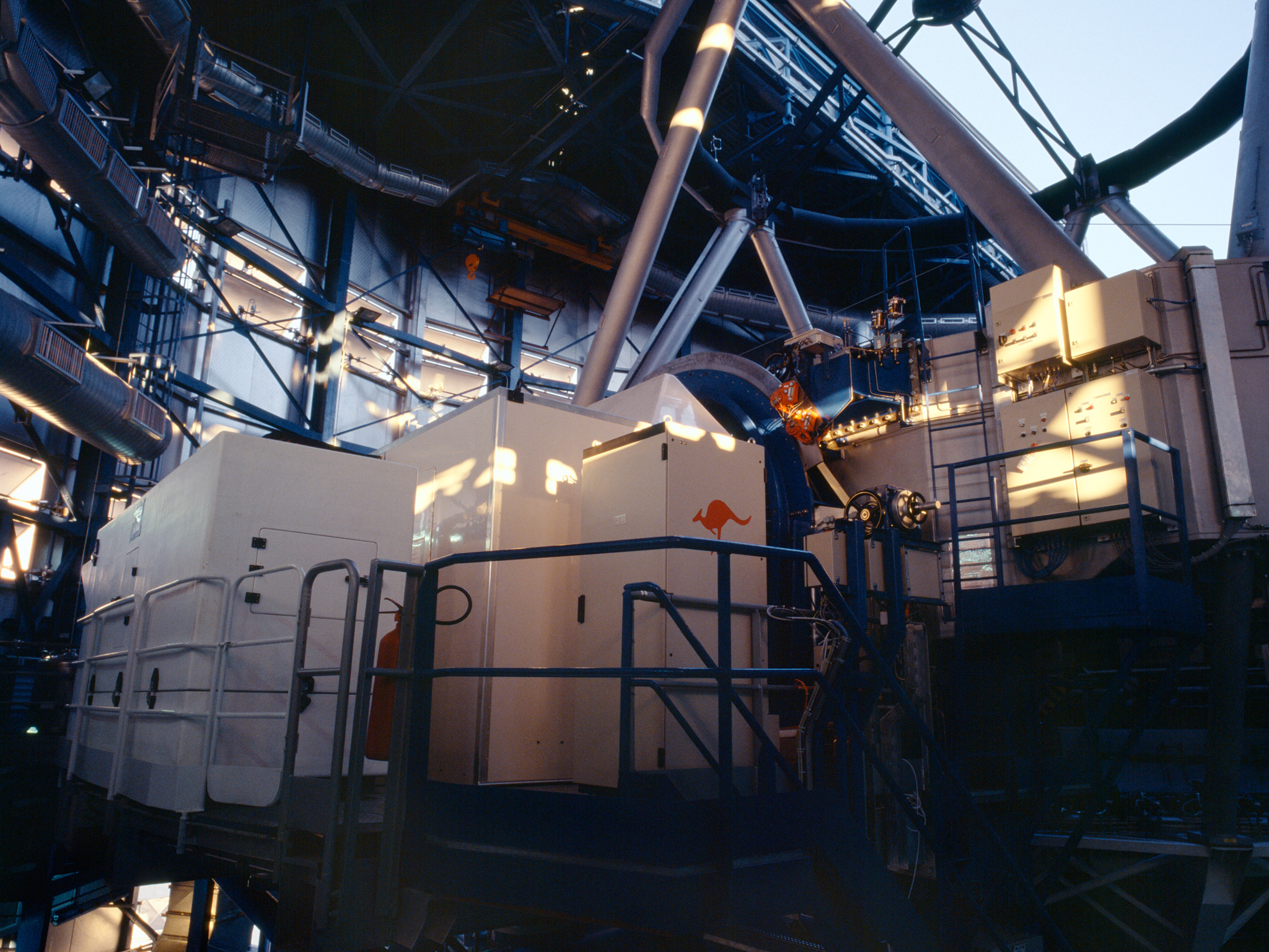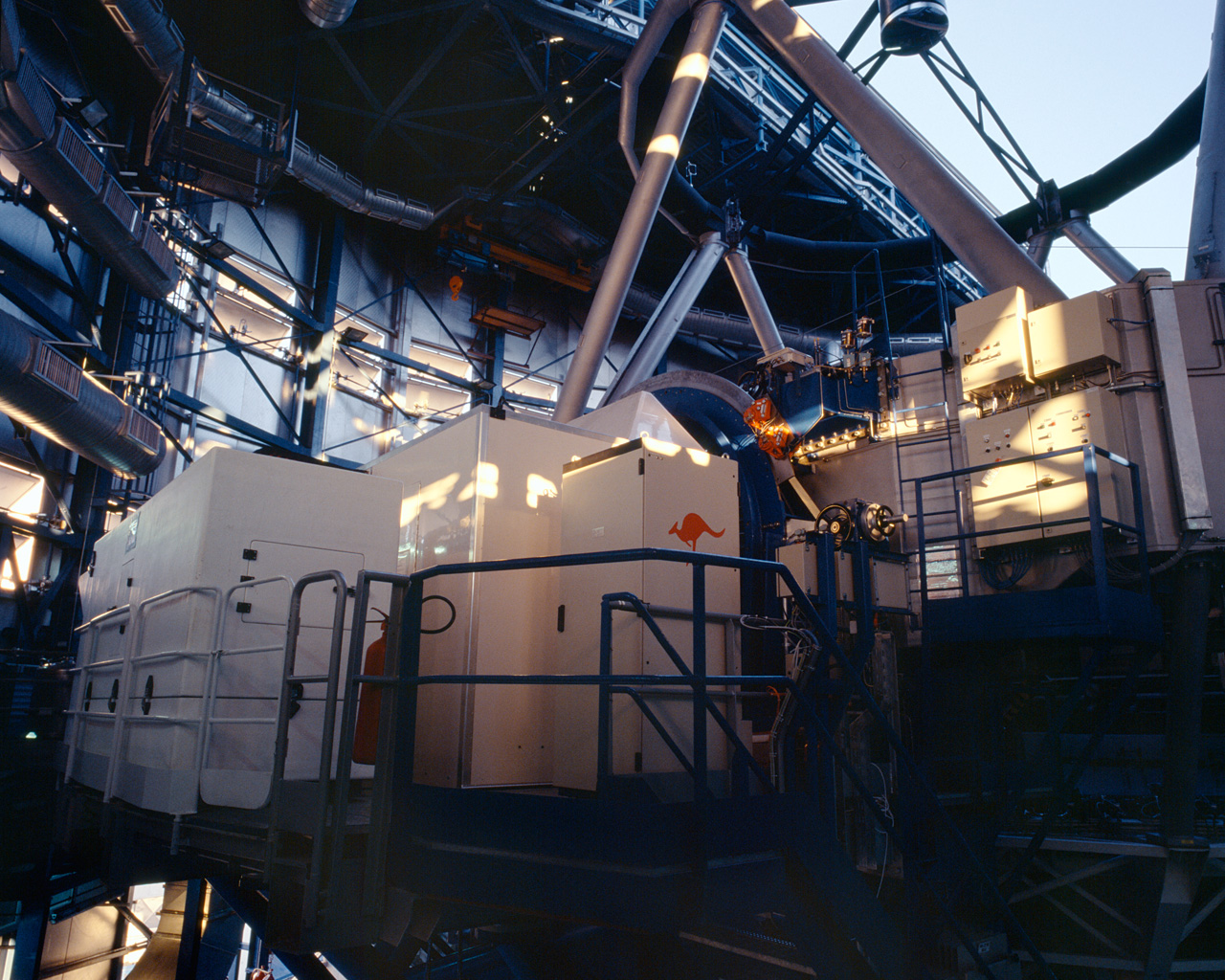 The FLAMES instrument, mounted at the Nasmyth A platform of Kueyen, UT2 of ESO's Very Large Telescope. FLAMES is the multi-object, intermediate and high resolution spectrograph of the VLT and can access targets over a large corrected field of view (25 arcmin diameter).