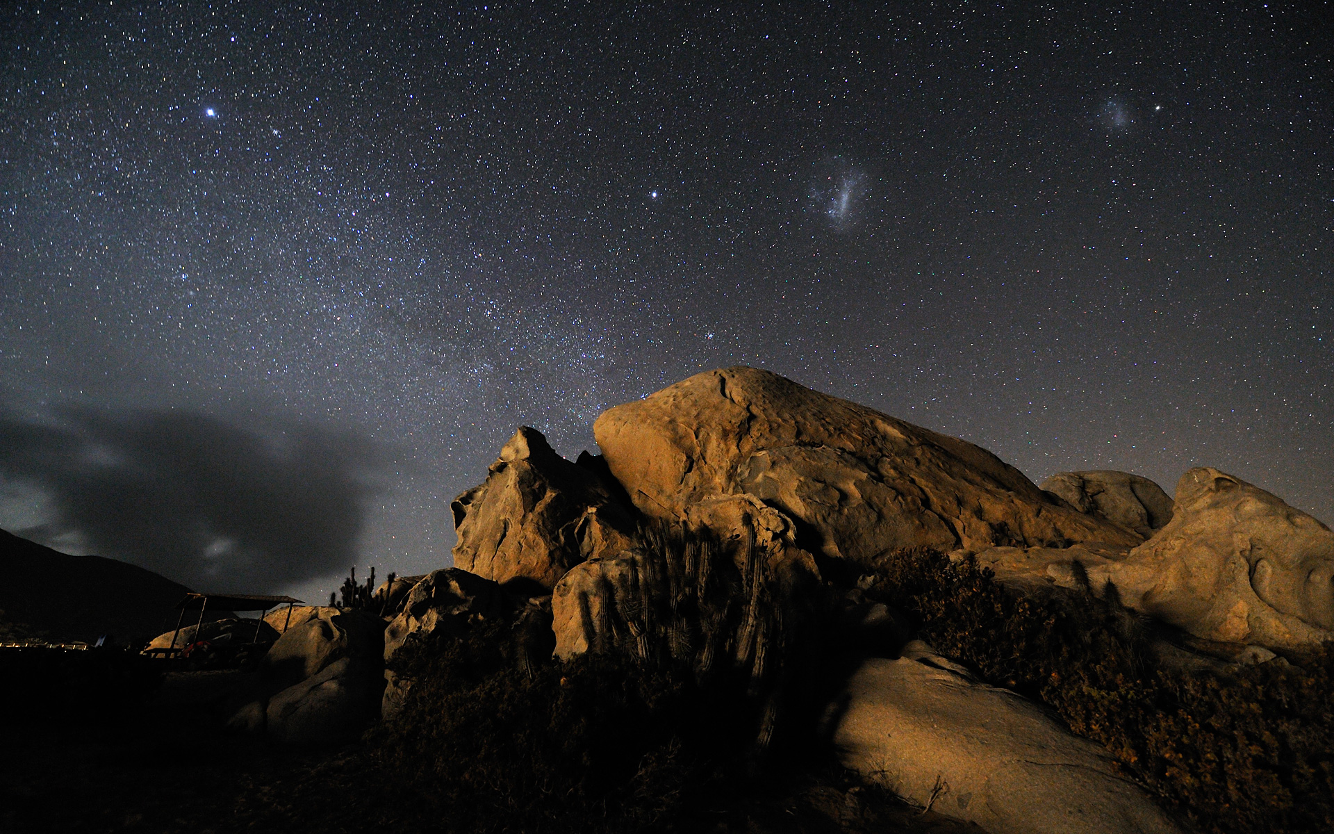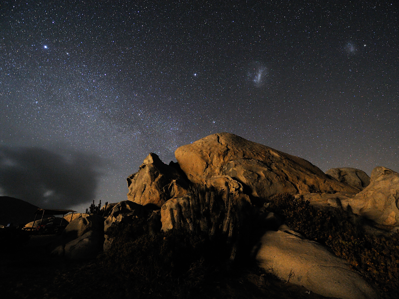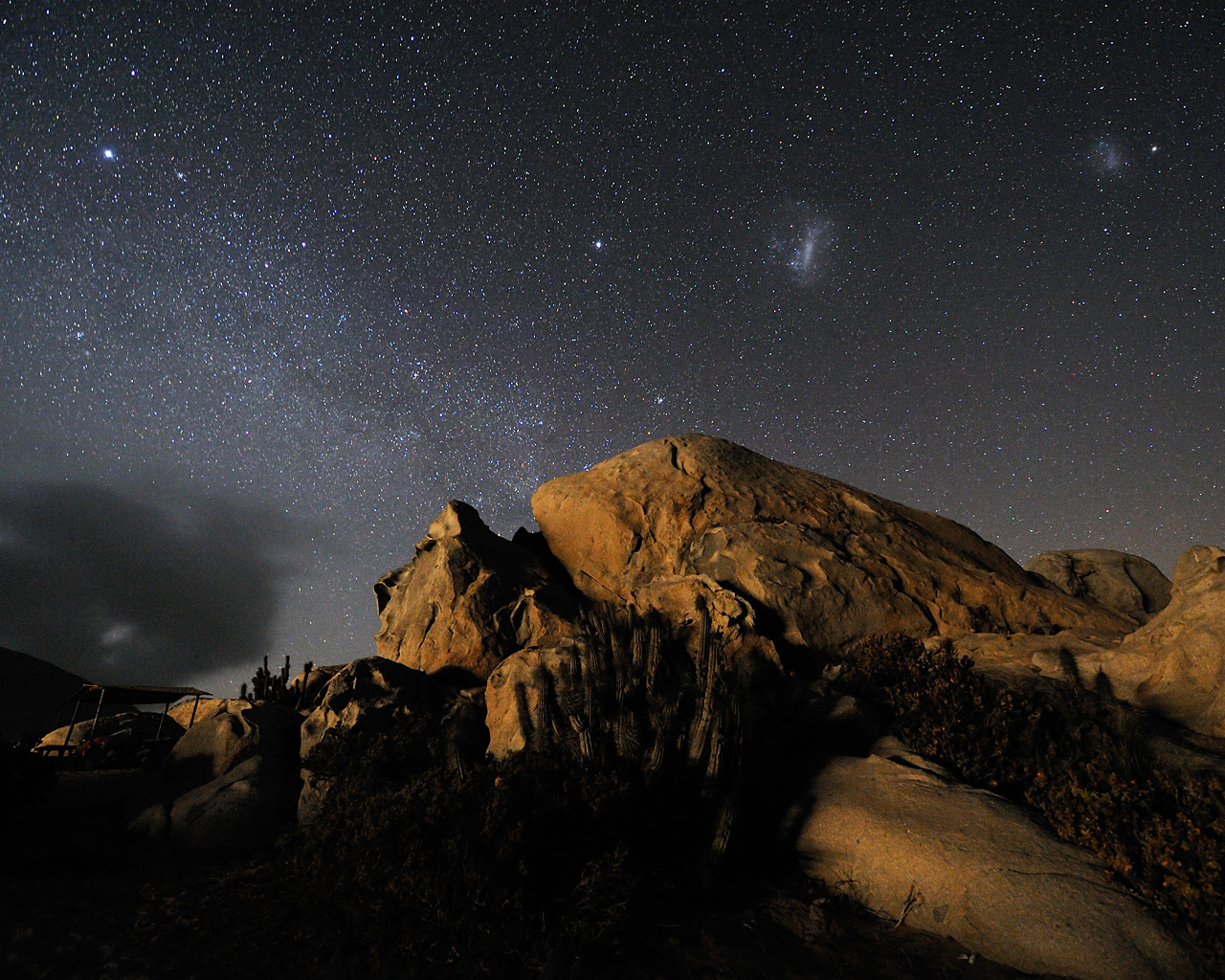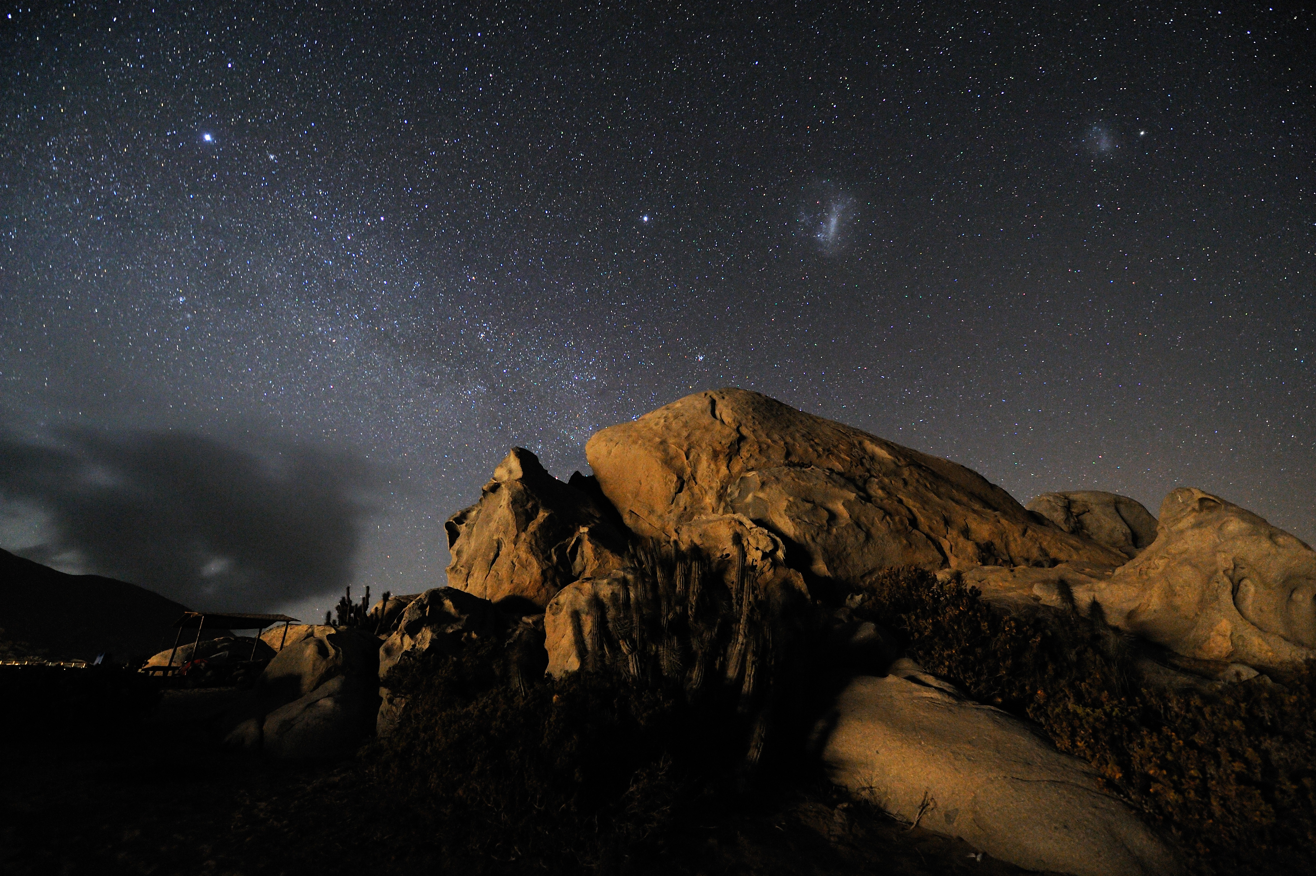 From right to left, the Small and the Large Magellanic Clouds, two irregular galaxies neighbourhood of the Milky Way. The observation of these objects was notified for the first time by the Magellan´s expedition at the beginning of the XVI century. By then, they were thought to be –strangely immobile- thin clouds. A “real” cloud leans out of the left horizon. Because of the humidity brought by the cold Pacific Ocean and the thermal contrast with the ground, clouds often cover the coast of the Atacama Desert, providing the humidity that feeds the local flora, consisting in different species of cacti, many of them endemic. The cold temperature of the ocean keeps the so called “inversion layer” very low, while the atmosphere above the clouds is exceptional dry and clear. These are the conditions found at Paranal Observatory, located at an elevation of 2600 metres, only 12 km away from the coast. Mount Paranal is home of the ESO Very Large Telescope (VLT), the most advanced optical ground based telescope in the world.