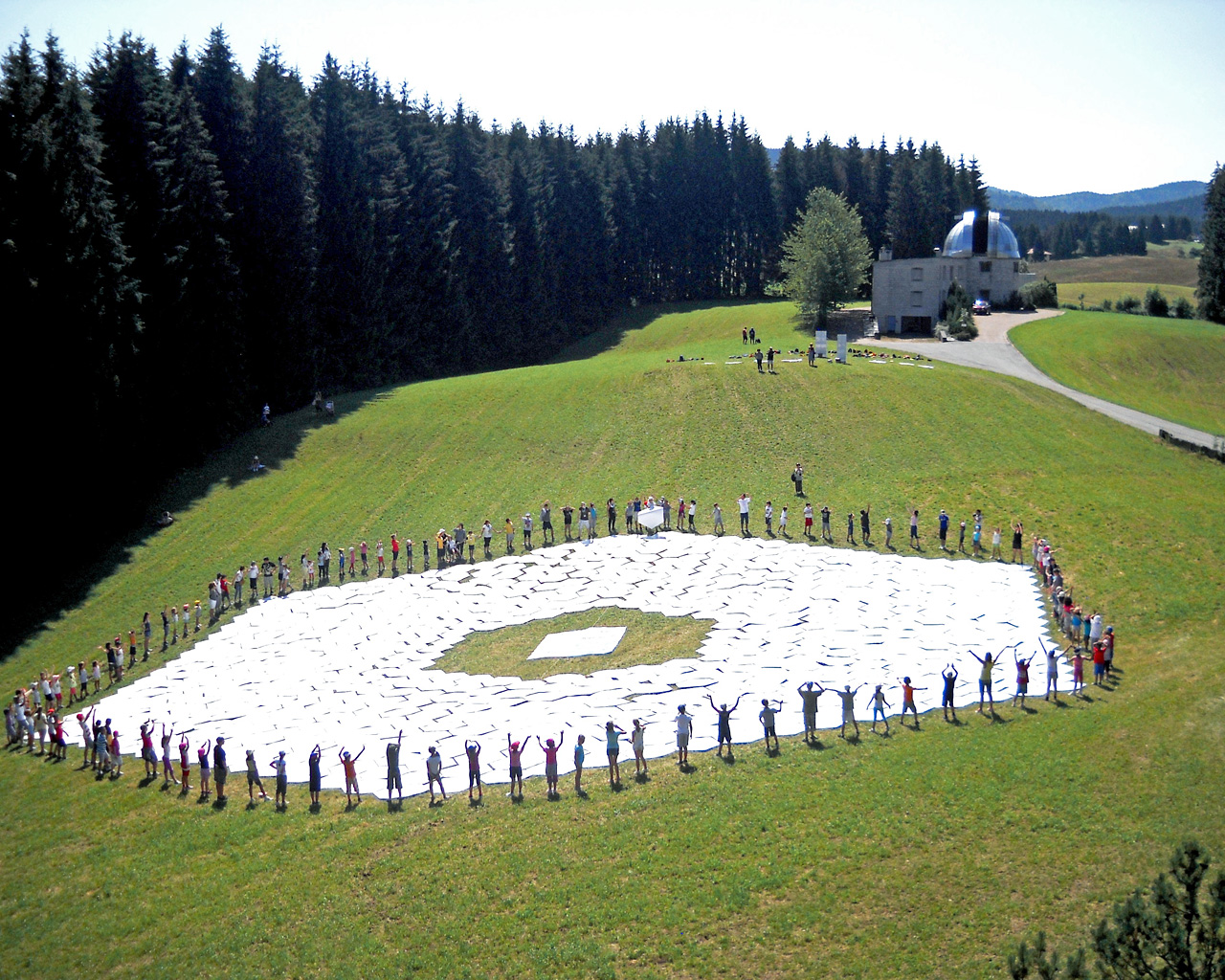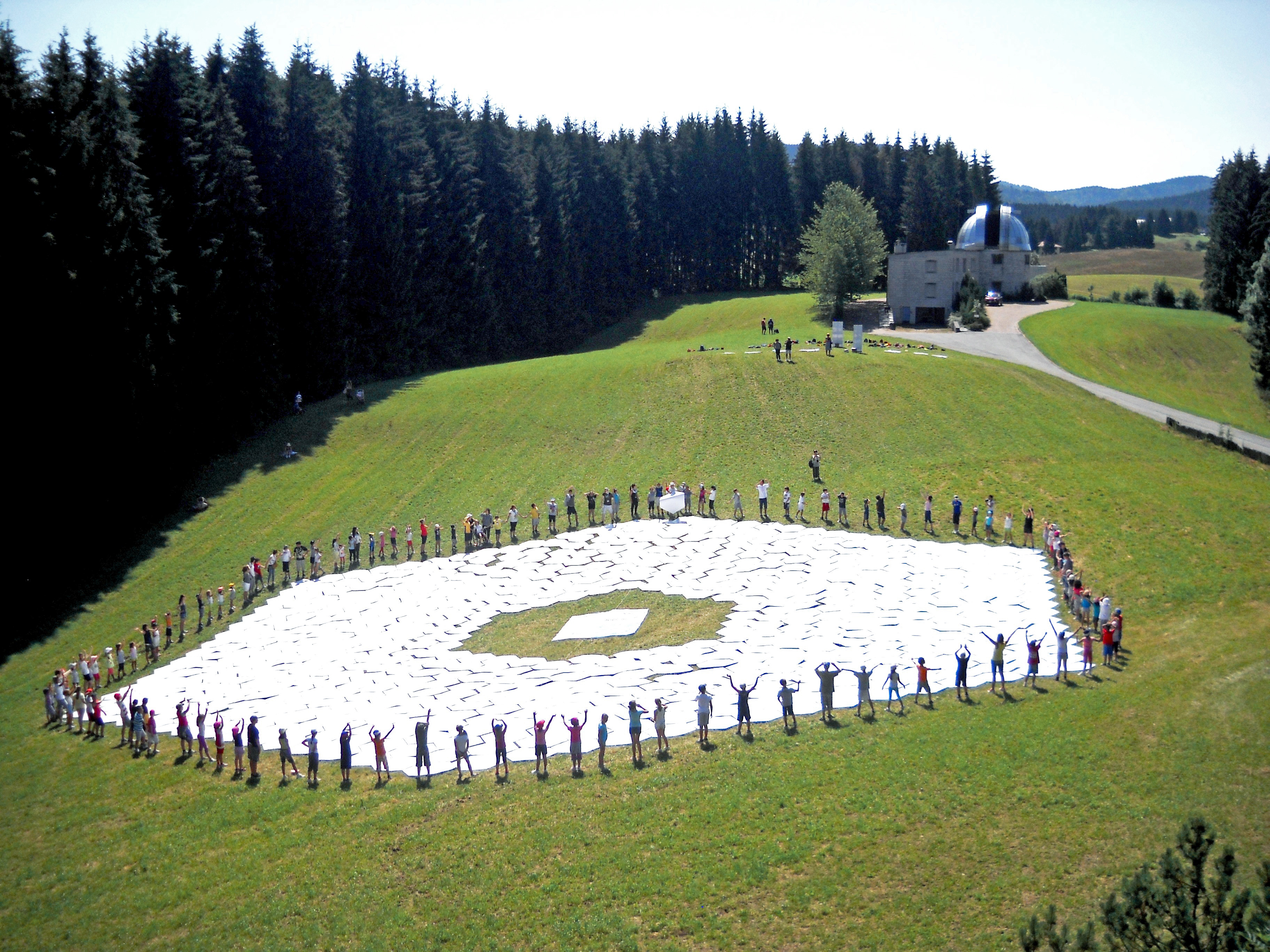 This wonderful arial image shows Asiago Astrophysical Observatory, part of the University of Padua near Asiago, Italy. Clearly visible is the final result of a game to produce a 1:1 scale model of the 39 metre primary mirror of the European Extremely Large Telescope. Around the edge of the model mirror a ring of children celebrate their success at having constructed it.