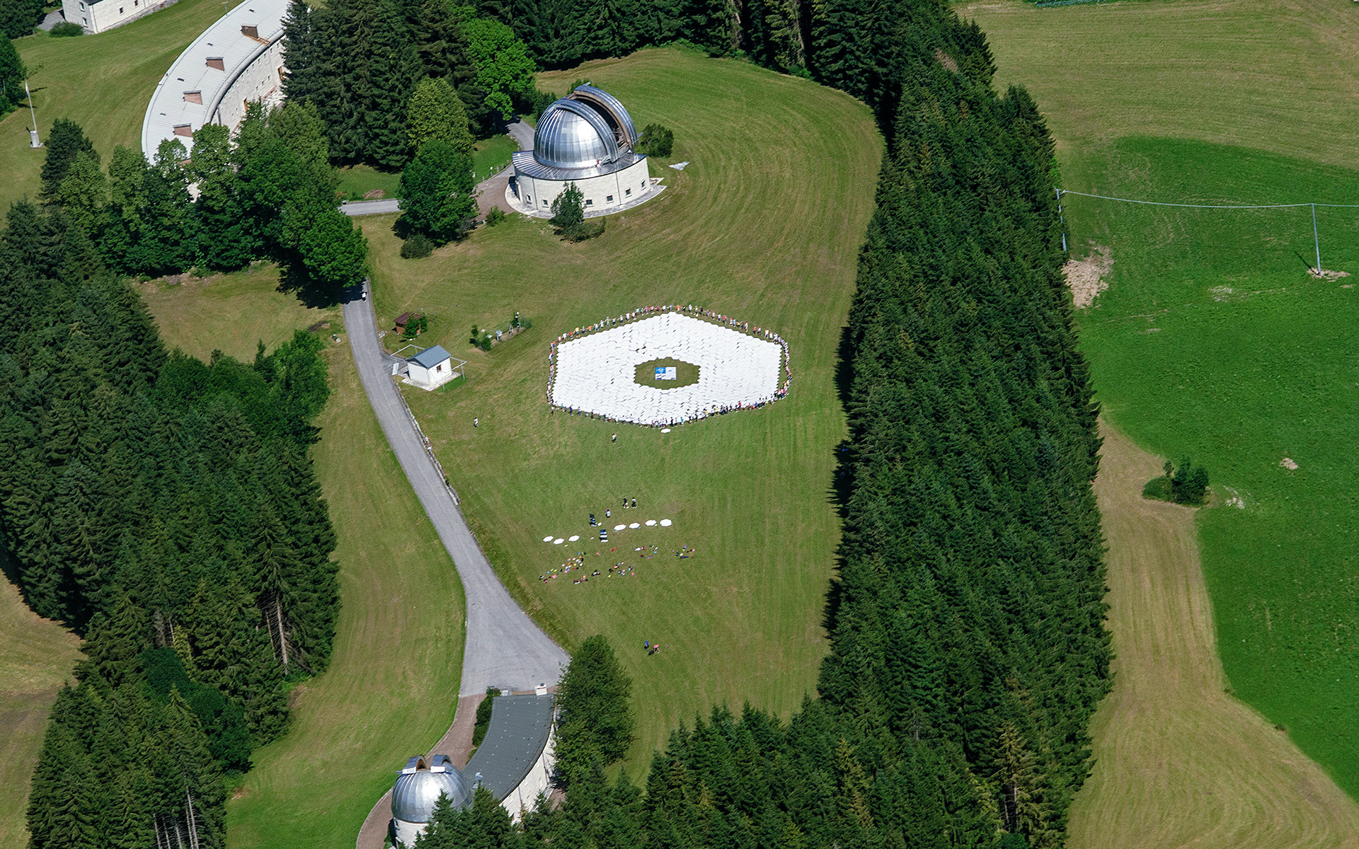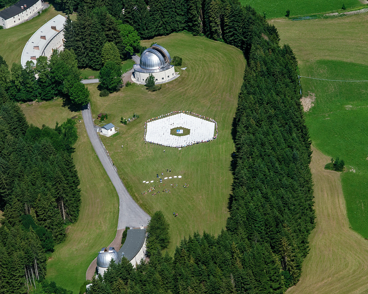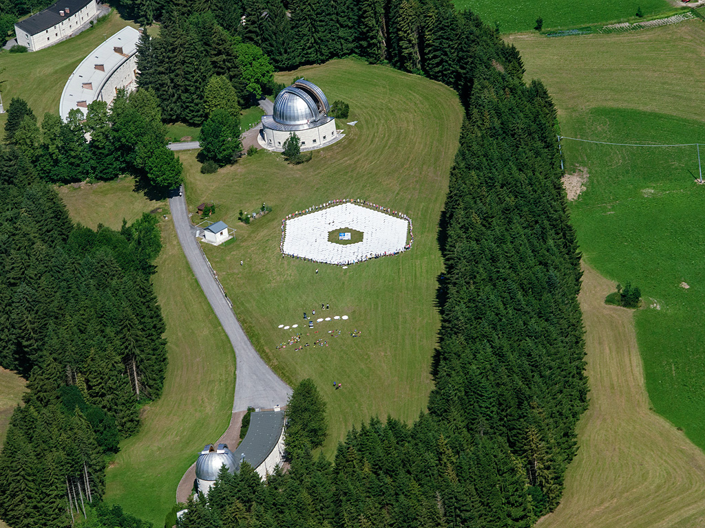 This wonderful arial image shows Asiago Astrophysical Observatory, part of the University of Padua near Asiago, Italy. Clearly visible is the final result of a game to produce a 1:1 scale model of the 39 metre primary mirror of the European Extremely Large Telescope. Around the edge of the model mirror can be seen the ring of children involved in building the structure.