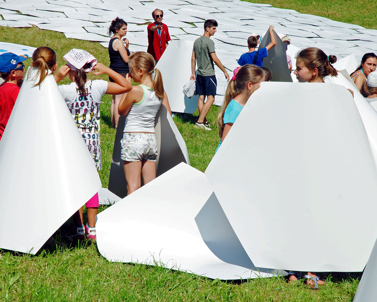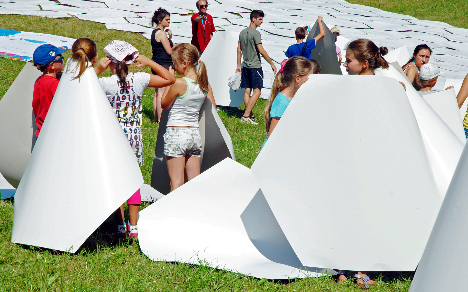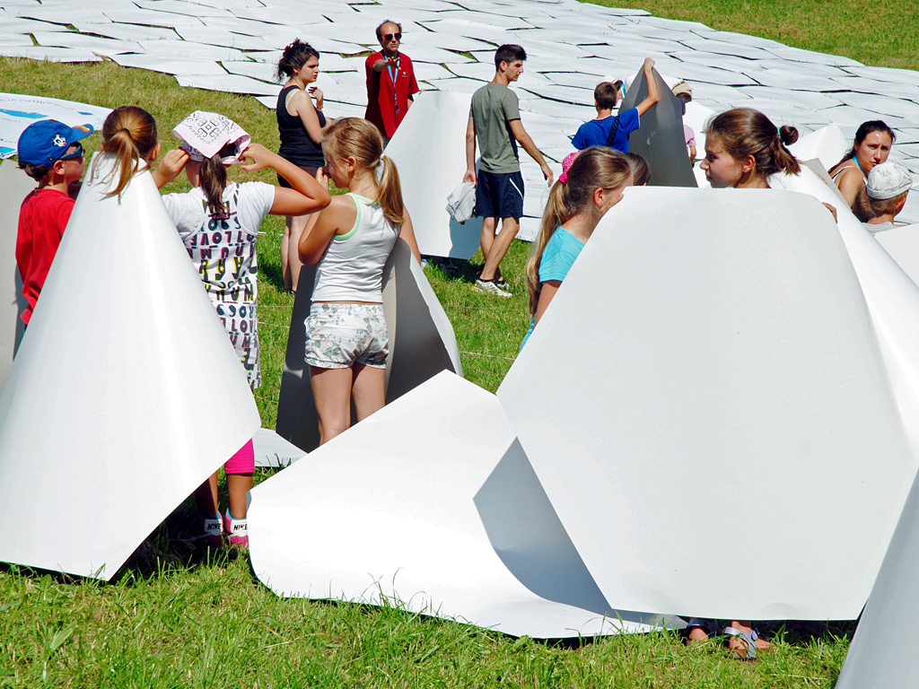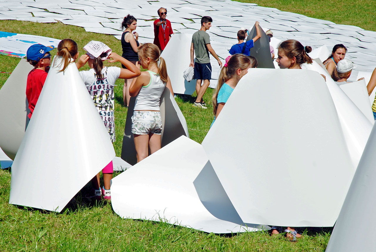 Children construct a 1:1 scale model of the 39 metre primary mirror of the European Extremely Large Telescope. This game was organised and played at the Osservatorio Astrofisico di Asiago — Asiago Astrophysical Observatory — part of the University of Padua near Asiago, Italy.
