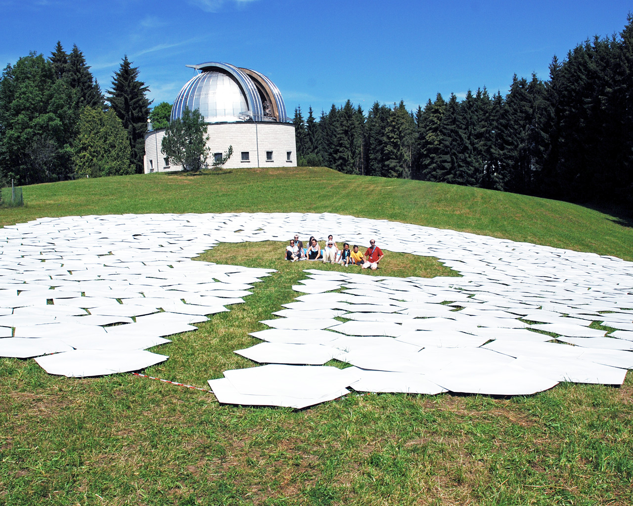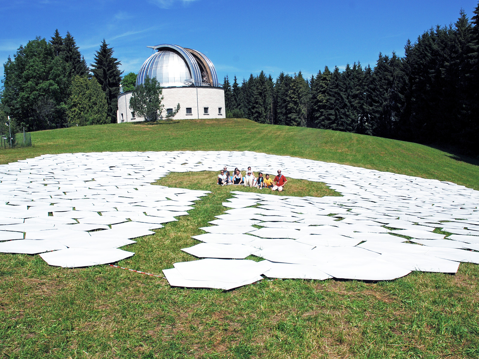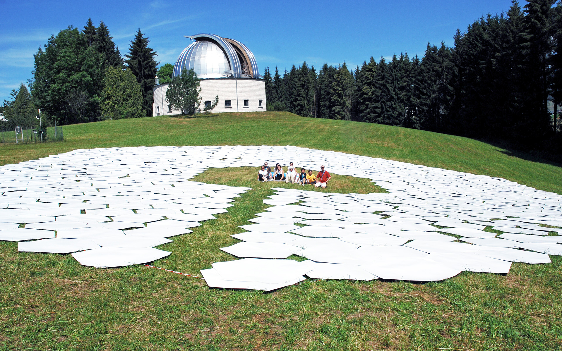 This image shows the final result of a game to produce a 1:1 scale model of the 39 metre primary mirror of the European Extremely Large Telescope. The game was organised and played at the Osservatorio Astrofisico di Asiago — Asiago Astrophysical Observatory — part of the University of Padua near Asiago, Italy.