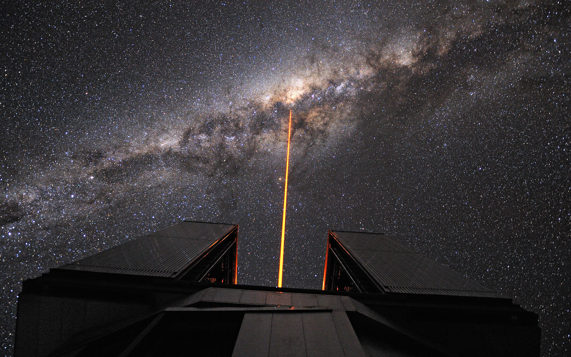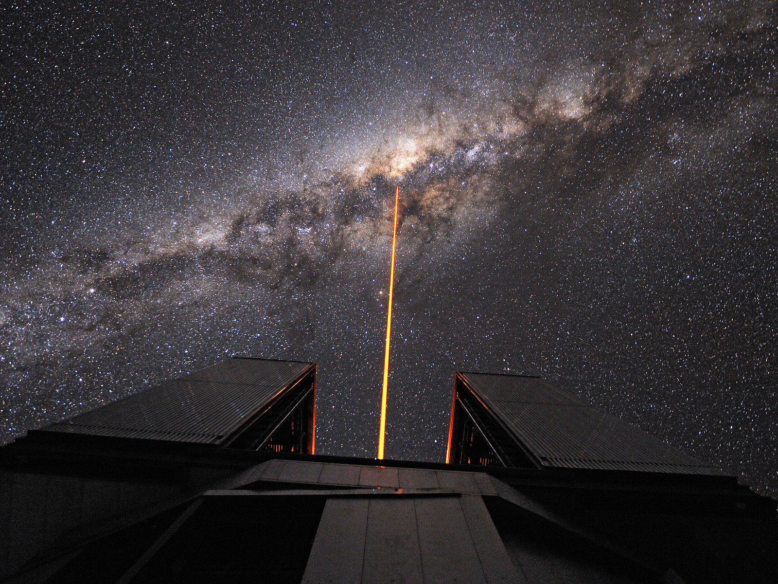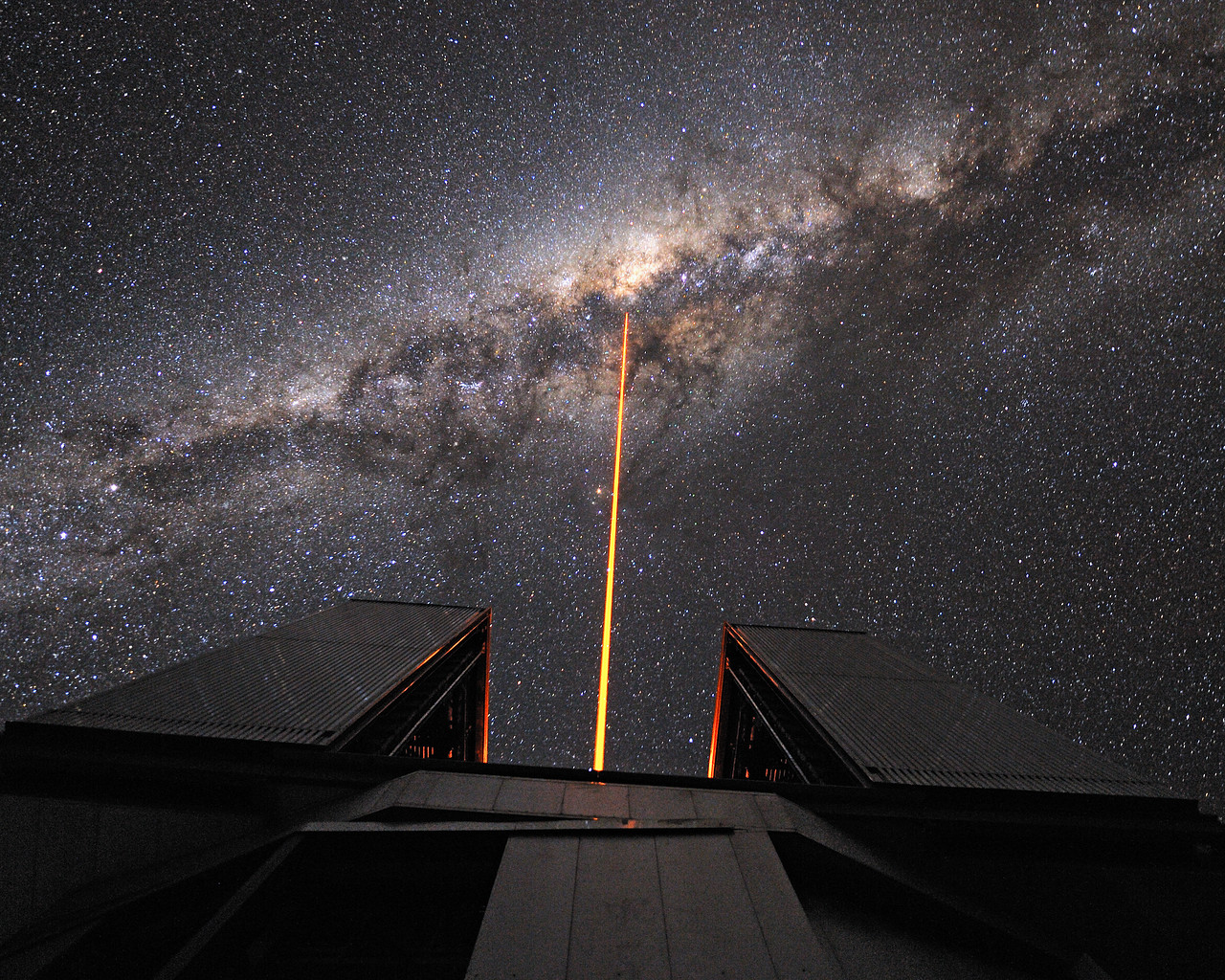 The Laser Guide Star (LGS) is launched from the VLT´s 8.2-metre Yepun Telescope and aims at the centre of our galaxy, in the heart of the brightest part of the Milky Way. The laser beam is part of the VLT´s adaptive optics system. It creates an artificial star at 90 km altitude in the Earth´s mesosphere. This star is used as reference to correct images and spectra for the blurring effect of the atmosphere. The plane of the Milky Way is crossed by prominent dark lanes, huge clouds of interstellar dust that block the visible light. Thanks to the infrared instruments mounted in the Yepun Telescope, astronomers can “see through” and study the complex and turbulent core of our galaxy, where a supermassive black hole is lurking. The ESO´s Very Large Telescope is composed by four 8.2-metre Unit Telescopes (UTs, where Yepun is UT4) plus four 1.8-metre movable Auxiliary Telescopes (ATs).