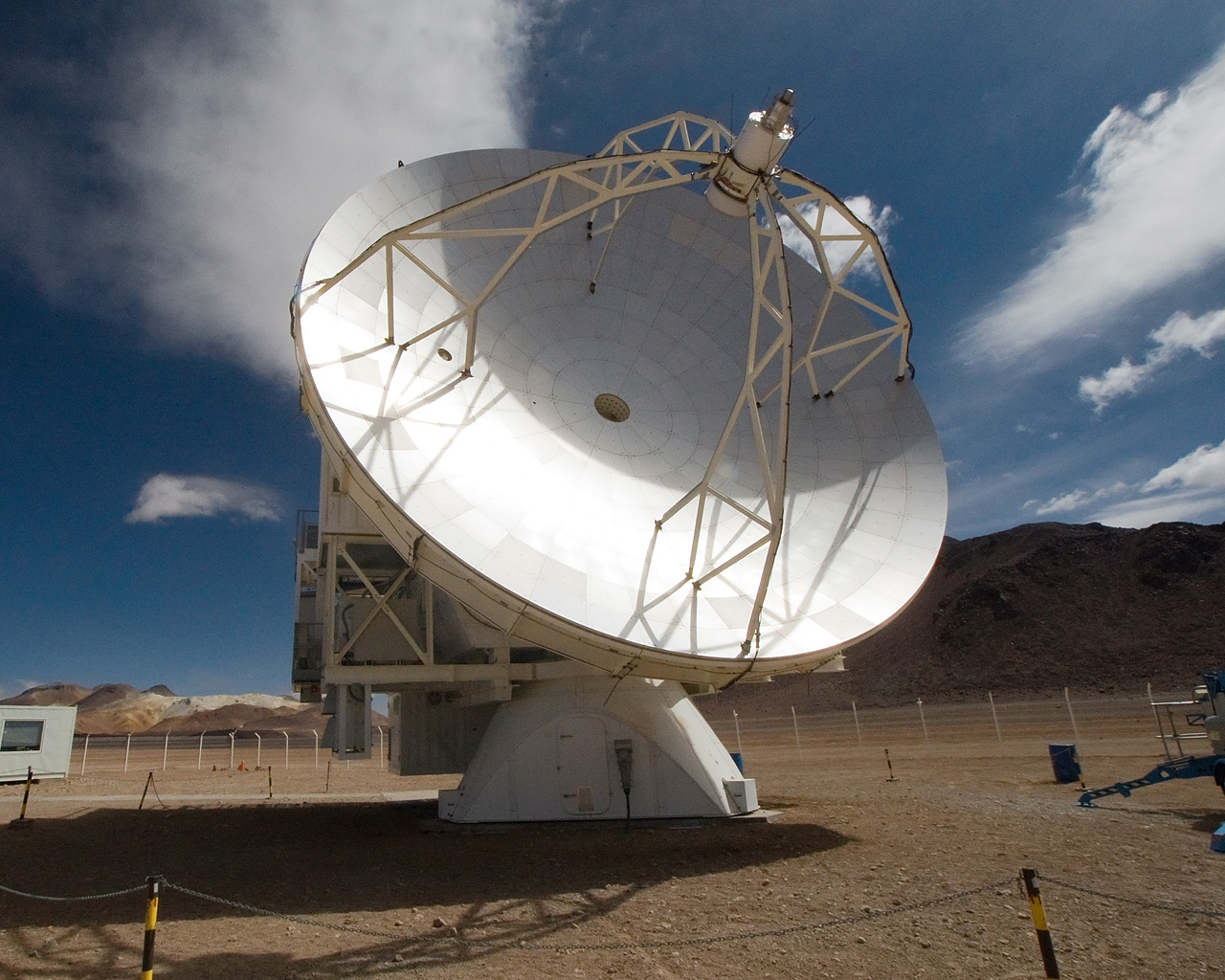 View of the Atacama Pathfinder Experiment (APEX) antenna on the Chajnantor plain of the Chilean Andes, 5000 m above sea level. APEX is a collaboration between the Max Planck Institut für Radioastronomie, Onsala Space Observatory (OSO) and ESO. The telescope was manufactured by VERTEX Antennentechnik in Duisburg, Germany. Astronomers observing with APEX can see cold dust and gas in both the Milky Way and in distant galaxies.