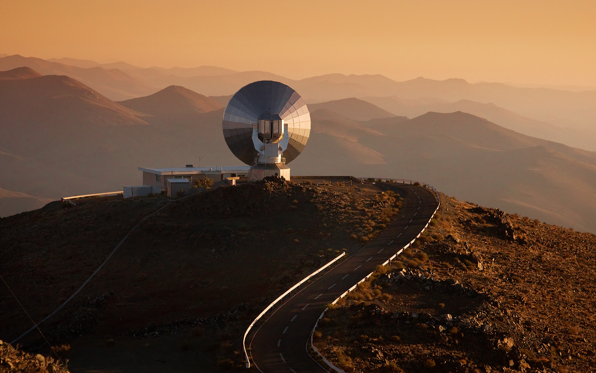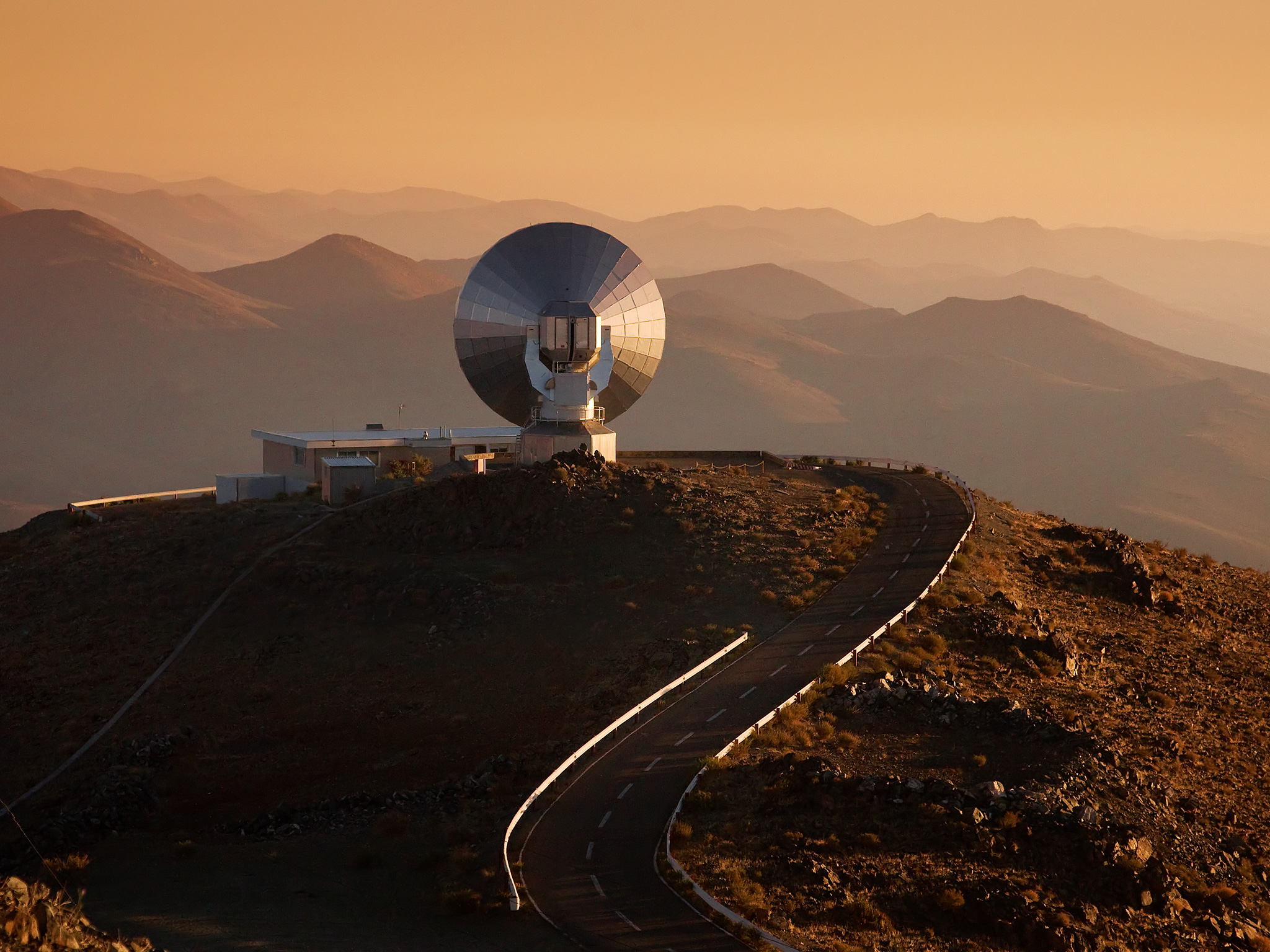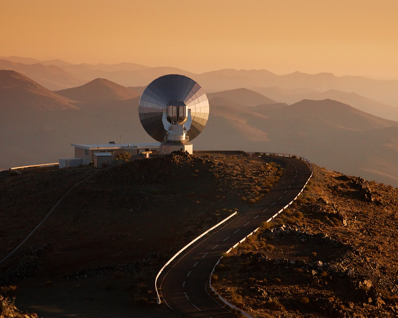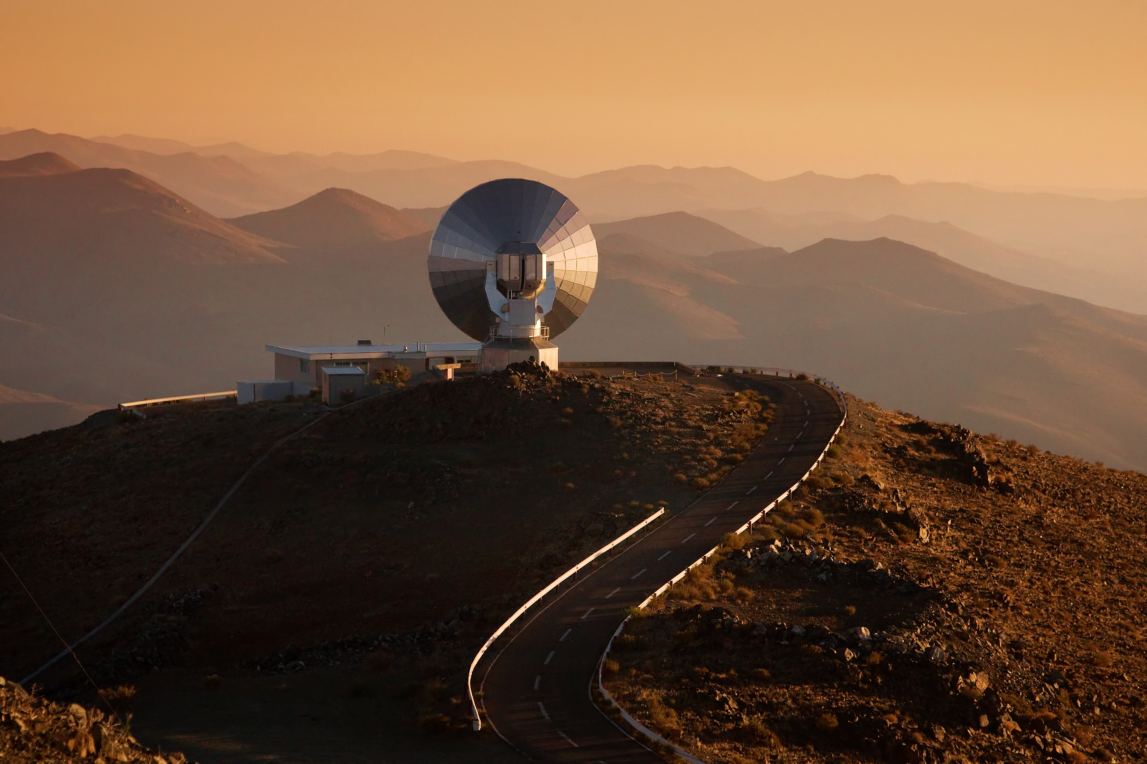 The 15-metre Swedish-ESO Submillimeter Telescope (SEST) looks out over the mountains at ESO's La Silla observing site in the southern part of the Atacama desert of Chile. Designed to observe at sub-millimetric wavelengths, SEST was built in 1987 on La Silla and decommissioned in 2003. 2400 metres above sea level, La Silla was ESO's first observing site. Currently La Silla hosts ESO's 3.6-m telescope, the New Technology Telescope (NTT), and the 2.2-m Max-Planck-ESO telescope.