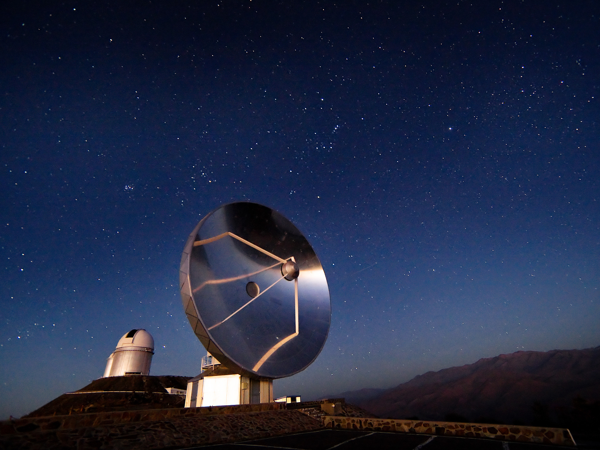 The 15-metre Swedish-ESO Submillimetre Telescope (SEST) at ESO's La Silla observing site in the southern part of the Atacama desert of Chile. Designed to observe at sub-millimetric wavelengths, SEST was built in 1987 on La Silla and decommissioned in 2003. It was a precursor of APEX and ALMA. 2400 metres above sea level, La Silla was ESO's first observing site. Currently La Silla hosts ESO's 3.6-m telescope, visible in the background, the New Technology Telescope (NTT), and the 2.2-m Max-Planck-ESO telescope.